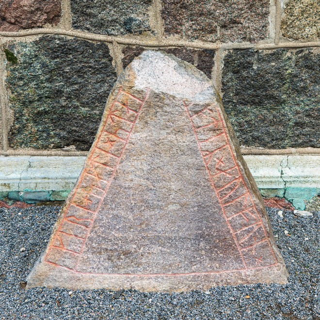 Stenen er ifølge N.G. Bruzelius den yngste gravsten med ”munkebogstaver”.