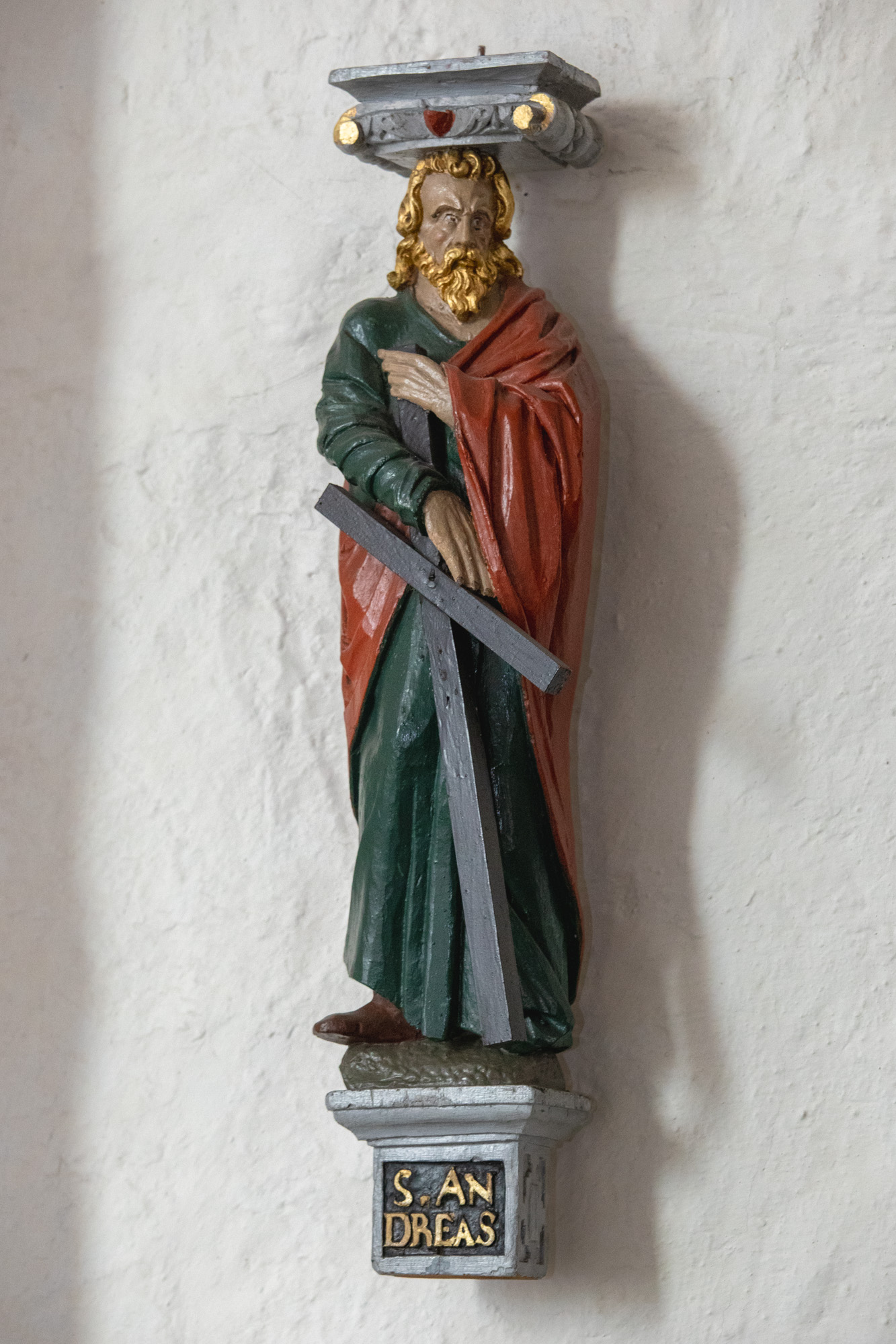 Mellem storfelterne står 10 apostle med deres navn anført på konsollen. Den 11., Andreas, er opsat på væggen. Figuren må ligesom storfeltet være blevet overflødig ved flytningen af prædikestolen.