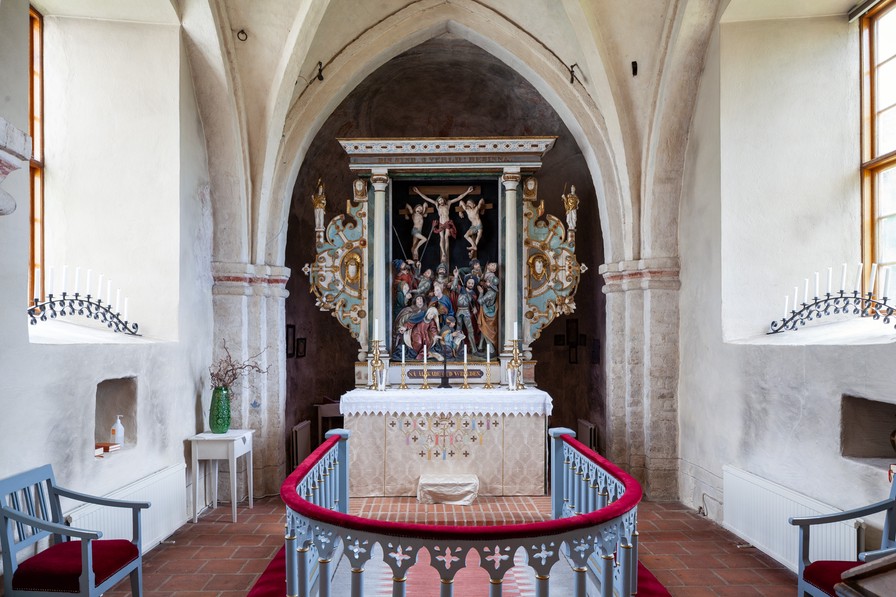 Alterbilledet er et relief fra skabsaltertavle fra de første årtier af 1500-tallet sat ind i en nyere ramme.