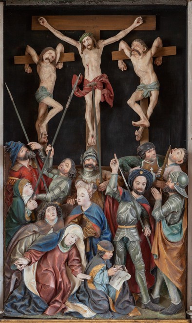 En figurrig korsfæstelsesscene, hvor Kristus er korsfæstet på et T-formet kors flankeret af de to røvere, der er forholdsvis mindre end Kristus. Han har en snoet tornekrone og armene udstrakt diagonalt. To lange flige står ud fra lændeklædet. Røverne krymper sig sammen med armene akavet anbragt over den vandrette korsarm. Forneden til venstre bøjer Maria sig forover med udbredte arme, mens Johannes støtter hende bagfra. Bag Maria ses en kvinde, som sikkert er Maria Magdalene, med hovedbeklædning. Til venstre for hende en kvinde med foldede hænder. Nedenfor korset ses en gruppe på syv mænd, hvoraf nogle er soldater, og nogle peger op mod korset. En holder stangen med eddikesvampen. Forneden foran og midtfor sidder en mandlig skriver med hat og kappe. I venstre hånd holder han et blækhus, mens han skriver i et dokument med en pensel.