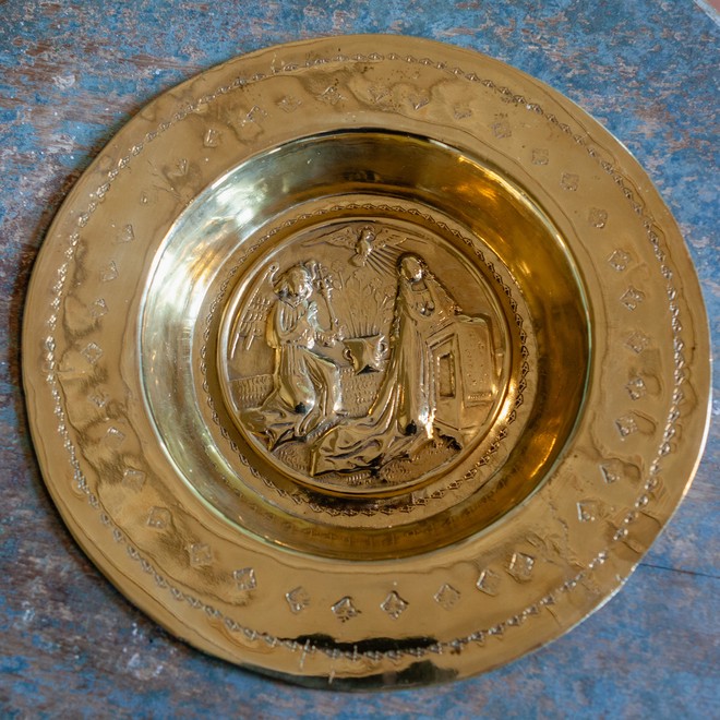 Motivet i dåbsfadet er Mariæ Bebudelse.