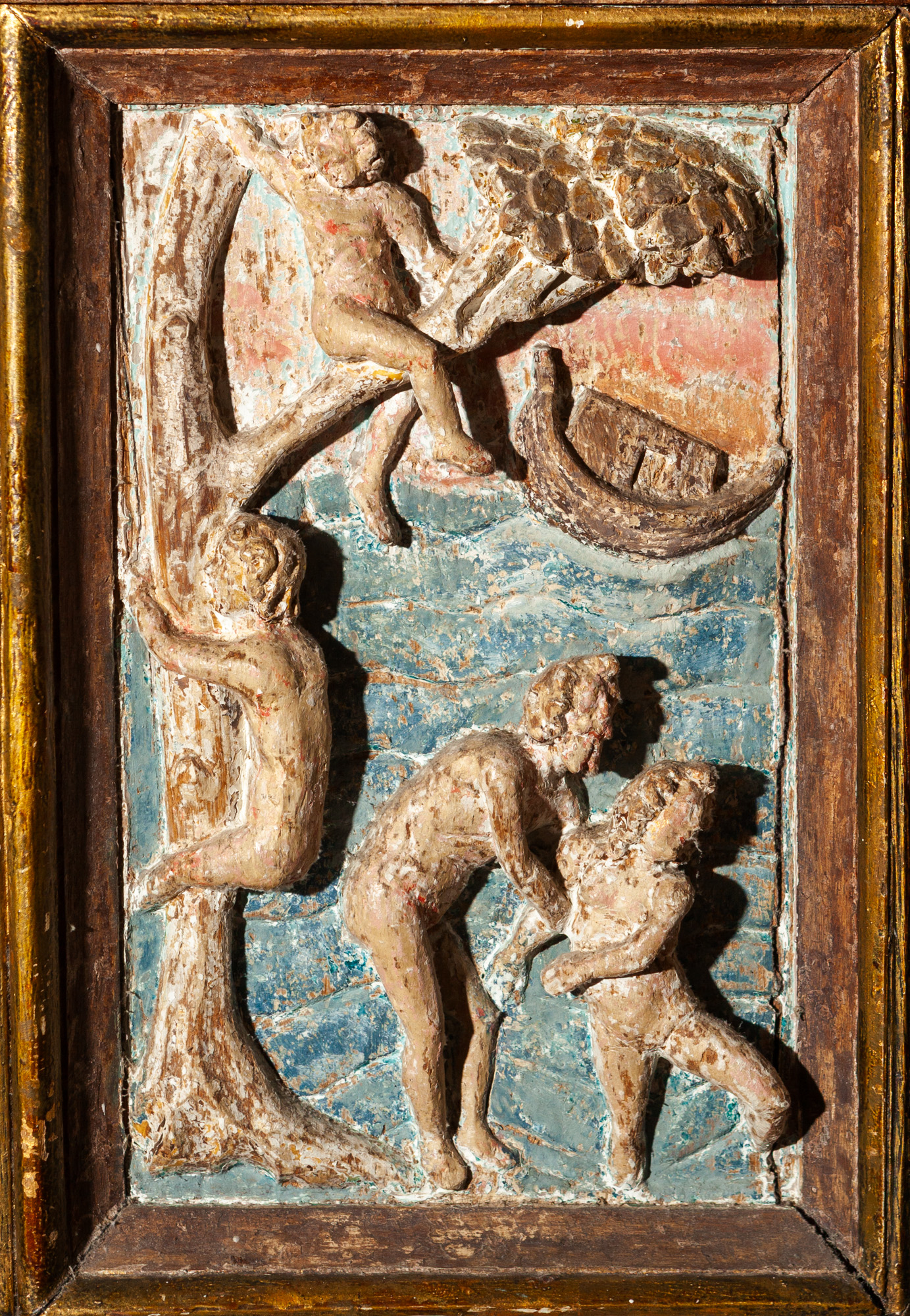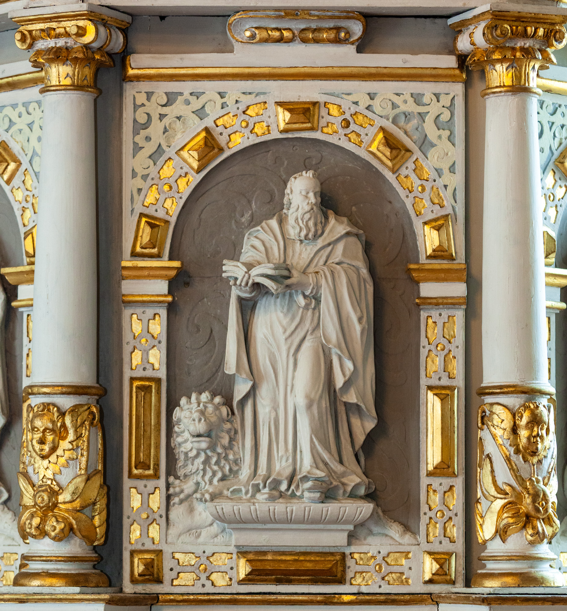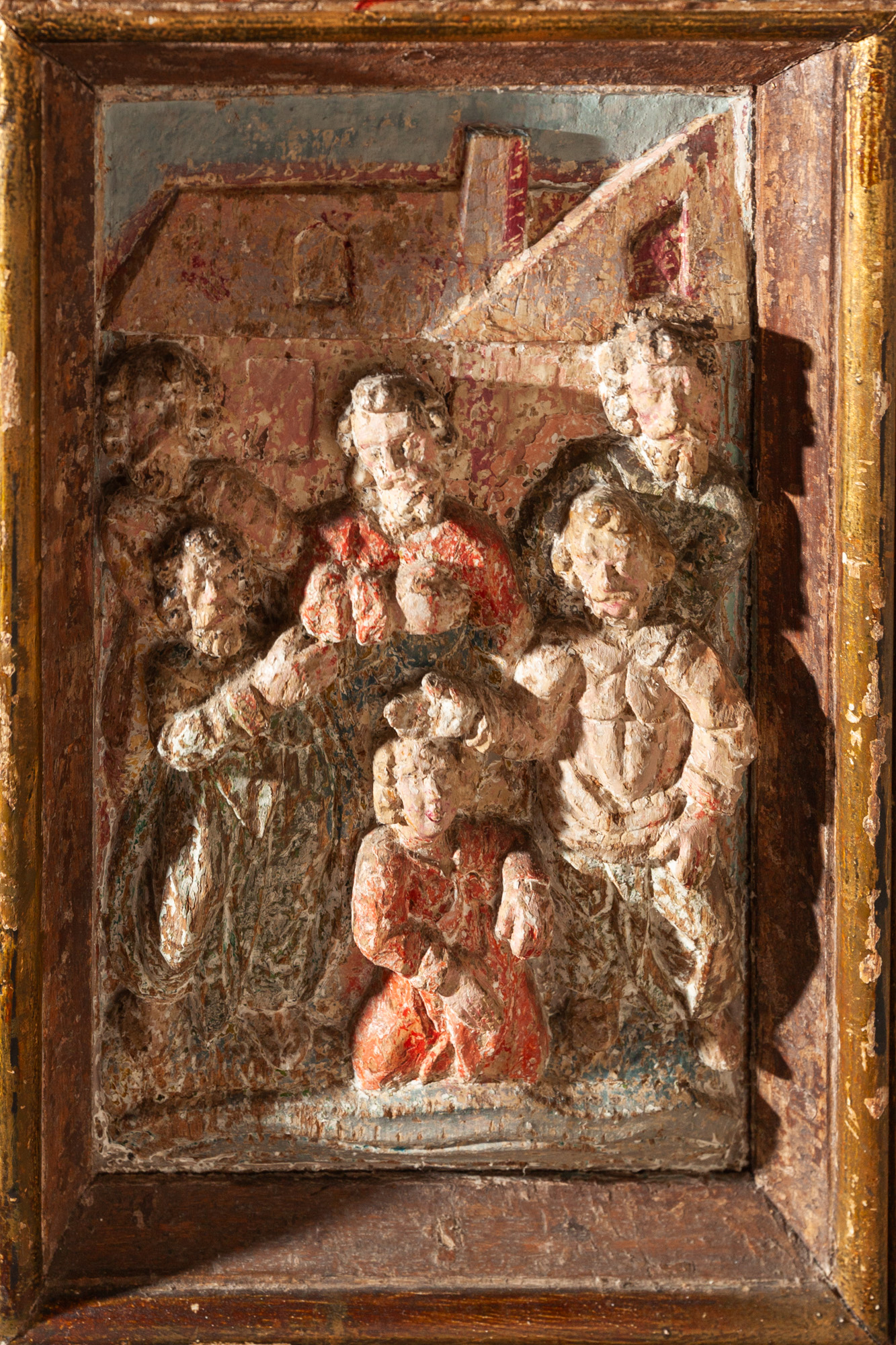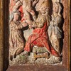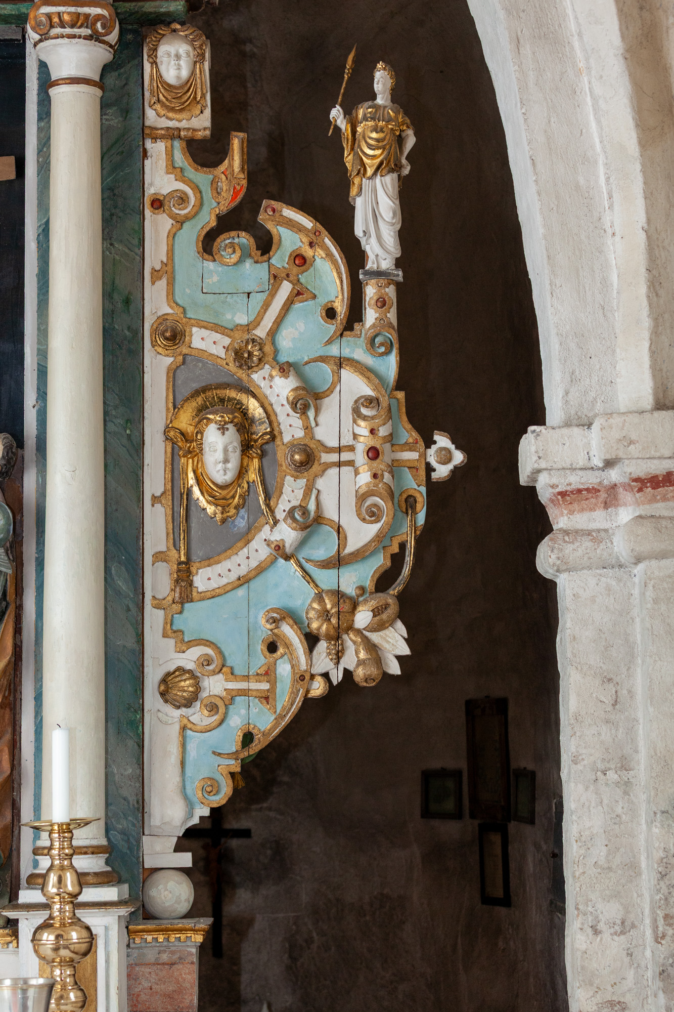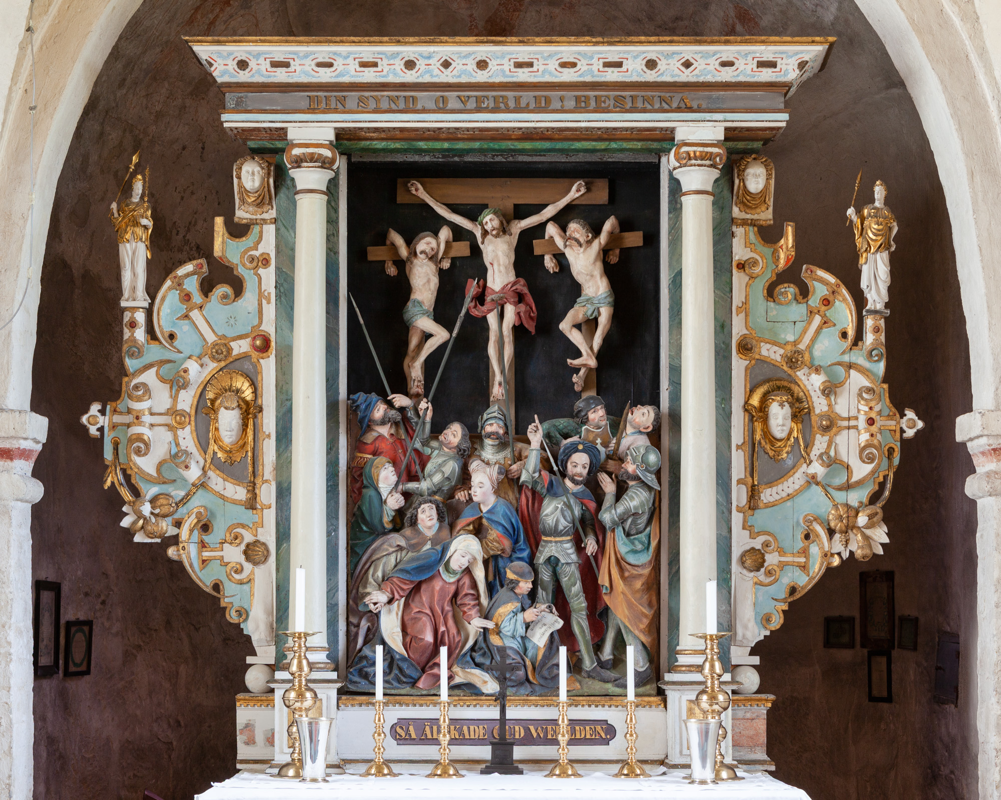 Relieffet er sat ind i en ramme fra første halvdel af 1600-tallet. Et bjælkelag bæres af to glatskaftede søjler. Vingerne er blandt andet udsmykket med rulleværk, frugter og ansigter. På hver vinge er en stående figur.