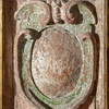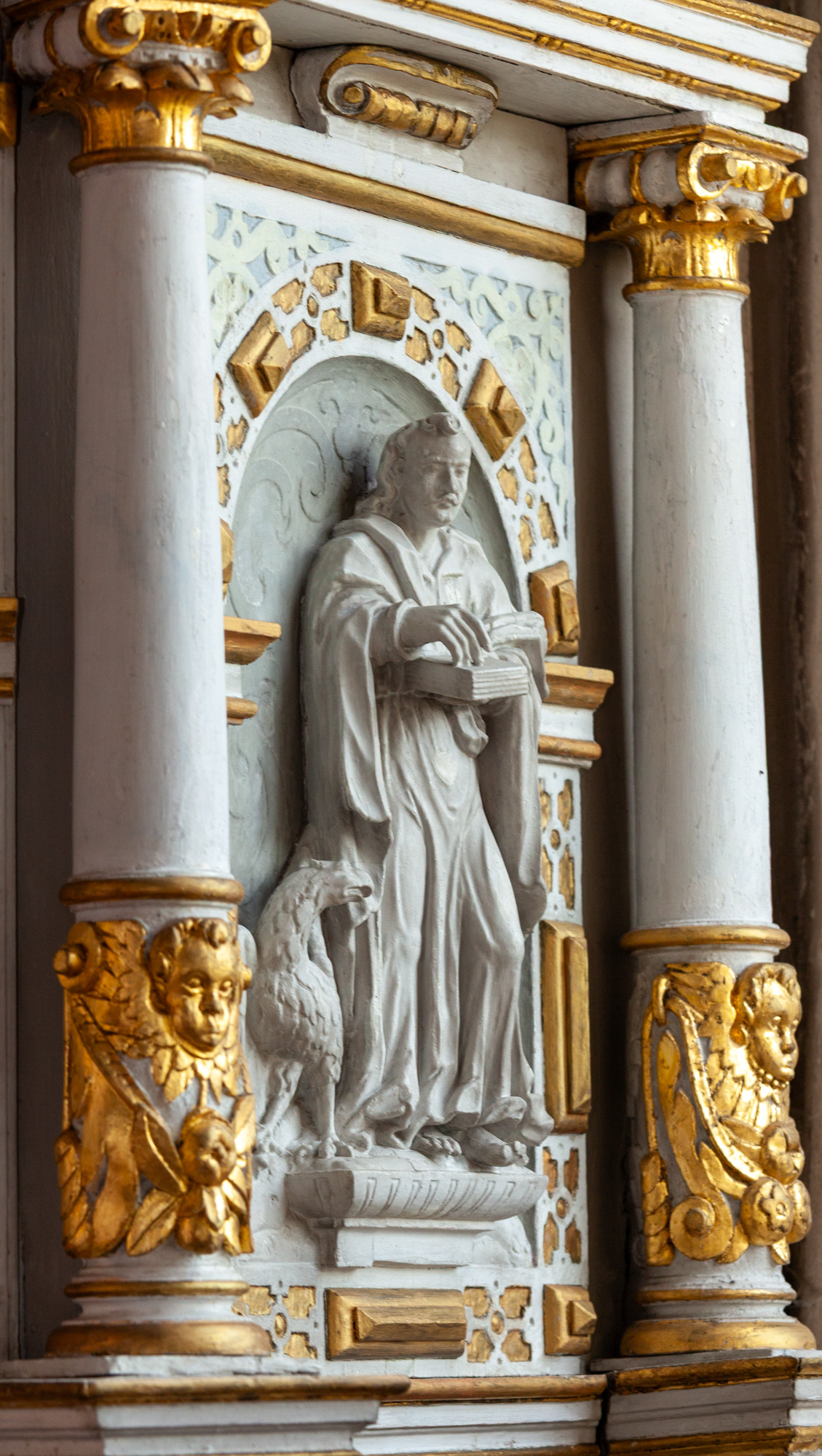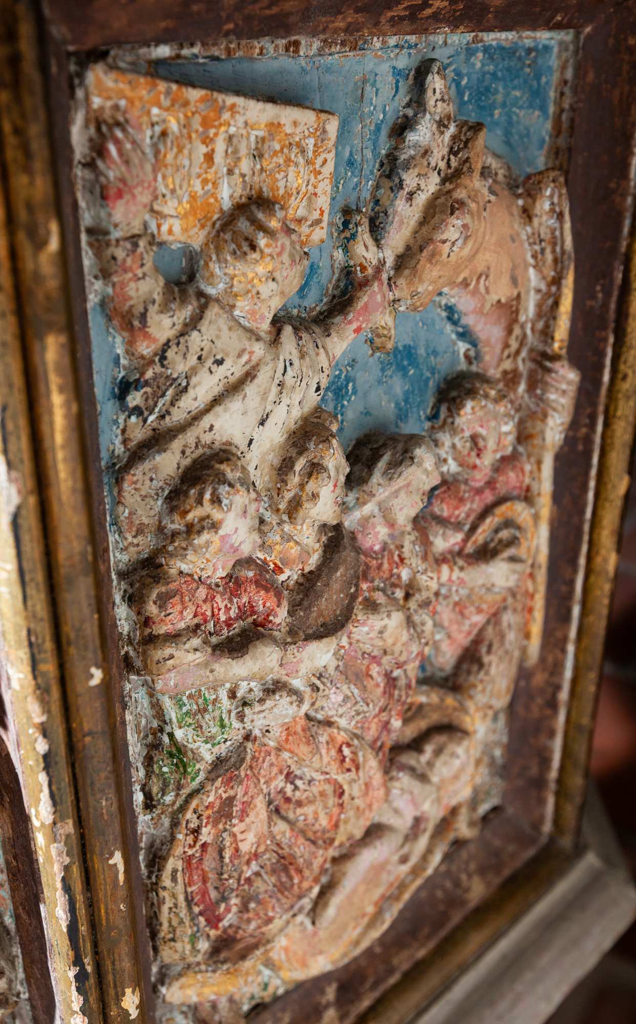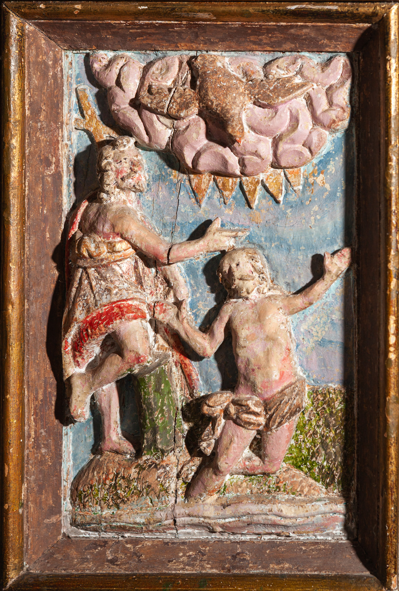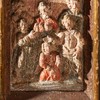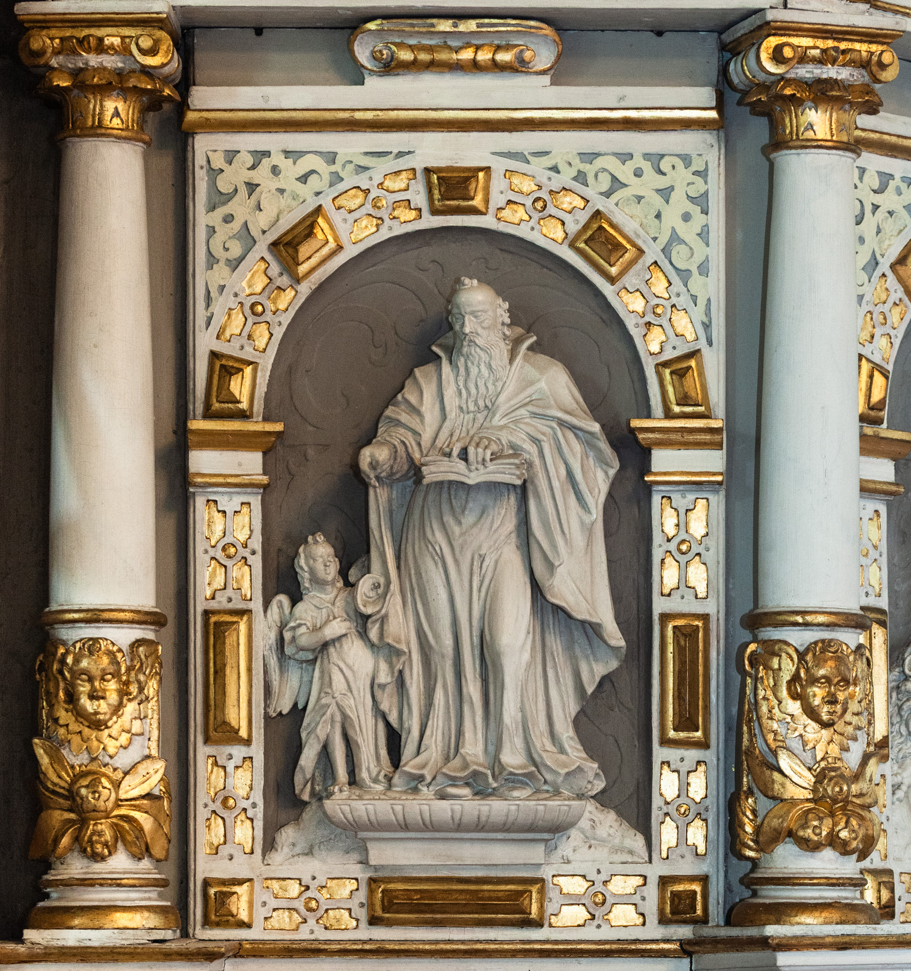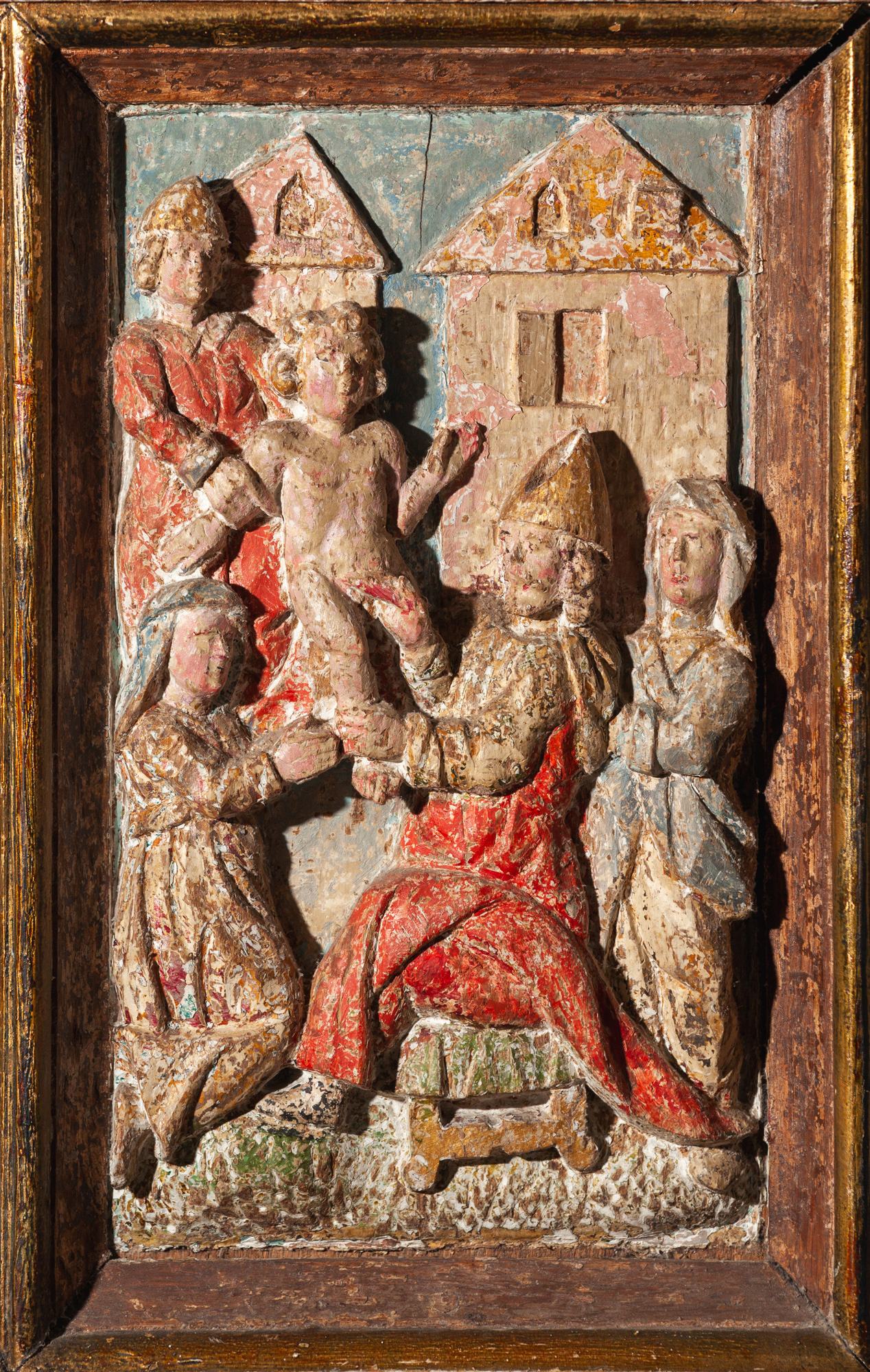 Relieffet er sat ind i en ramme fra første halvdel af 1600-tallet. Et bjælkelag bæres af to glatskaftede søjler. Vingerne er blandt andet udsmykket med rulleværk, frugter og ansigter. På hver vinge er en stående figur.