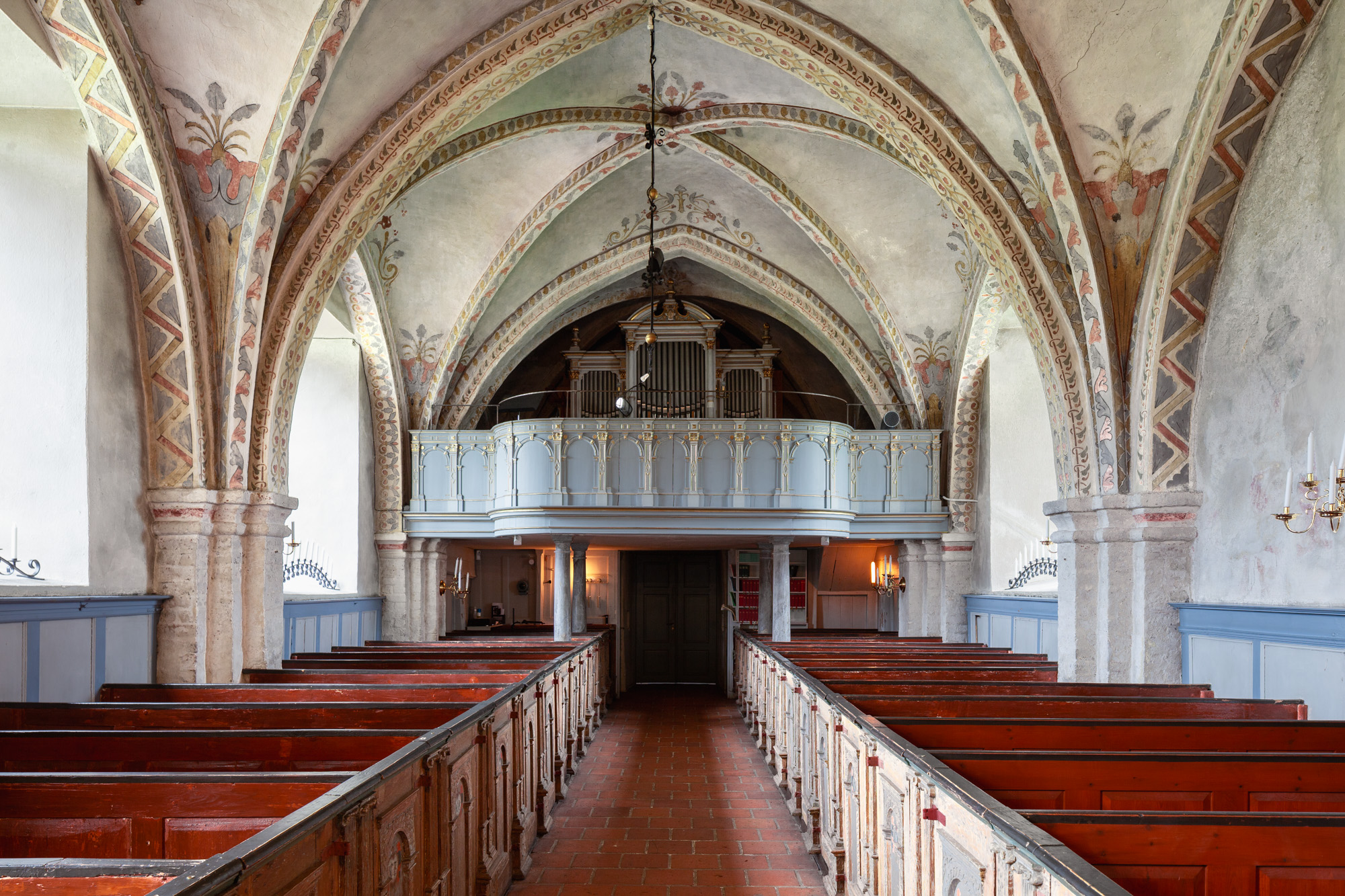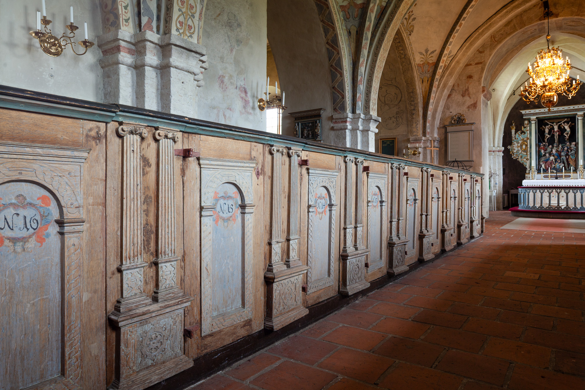Bænkene er fra 1611. Numrene på dørene blev maleet i 1688. De har haft høje bænkegavle, som blev fjernet i 1862.