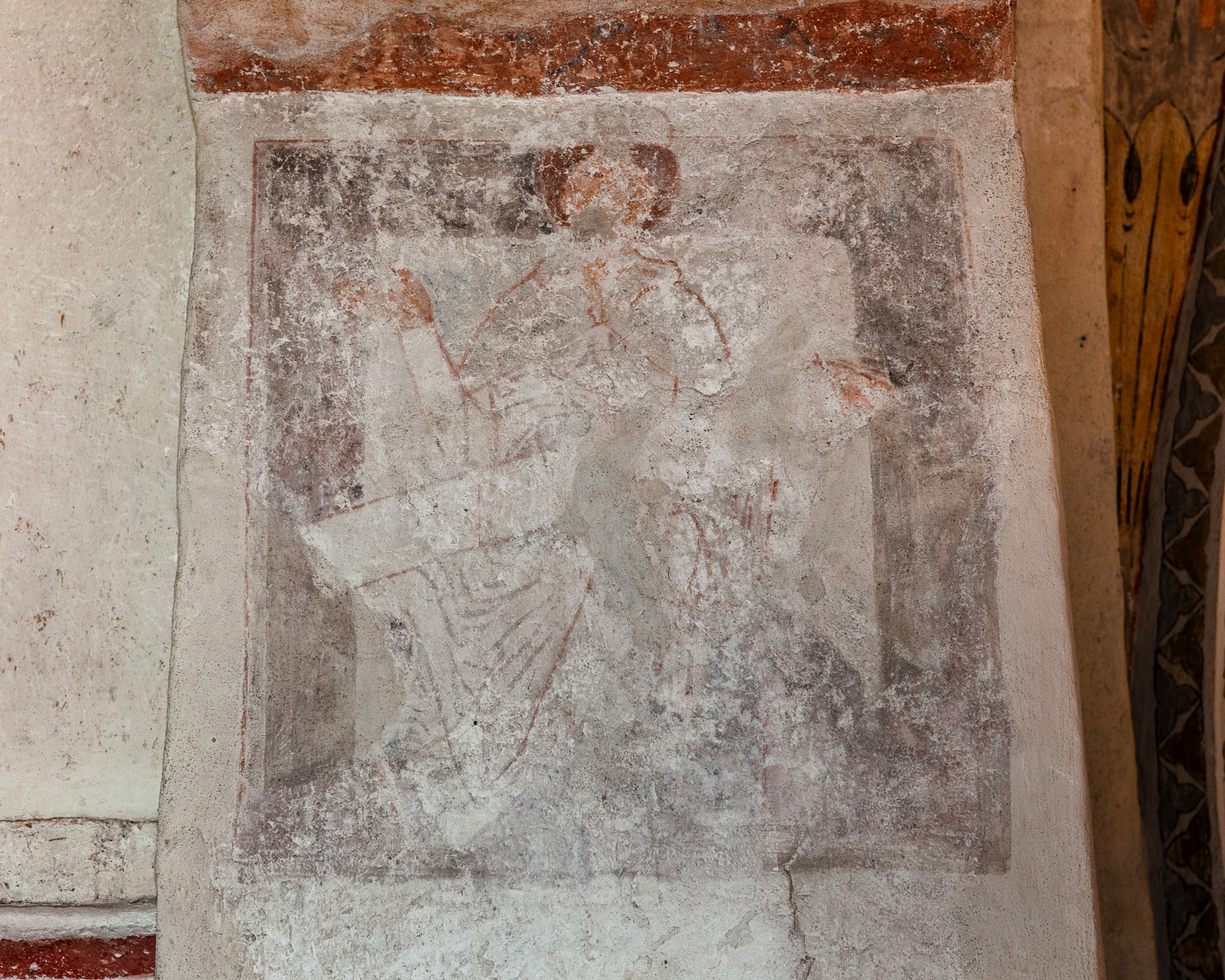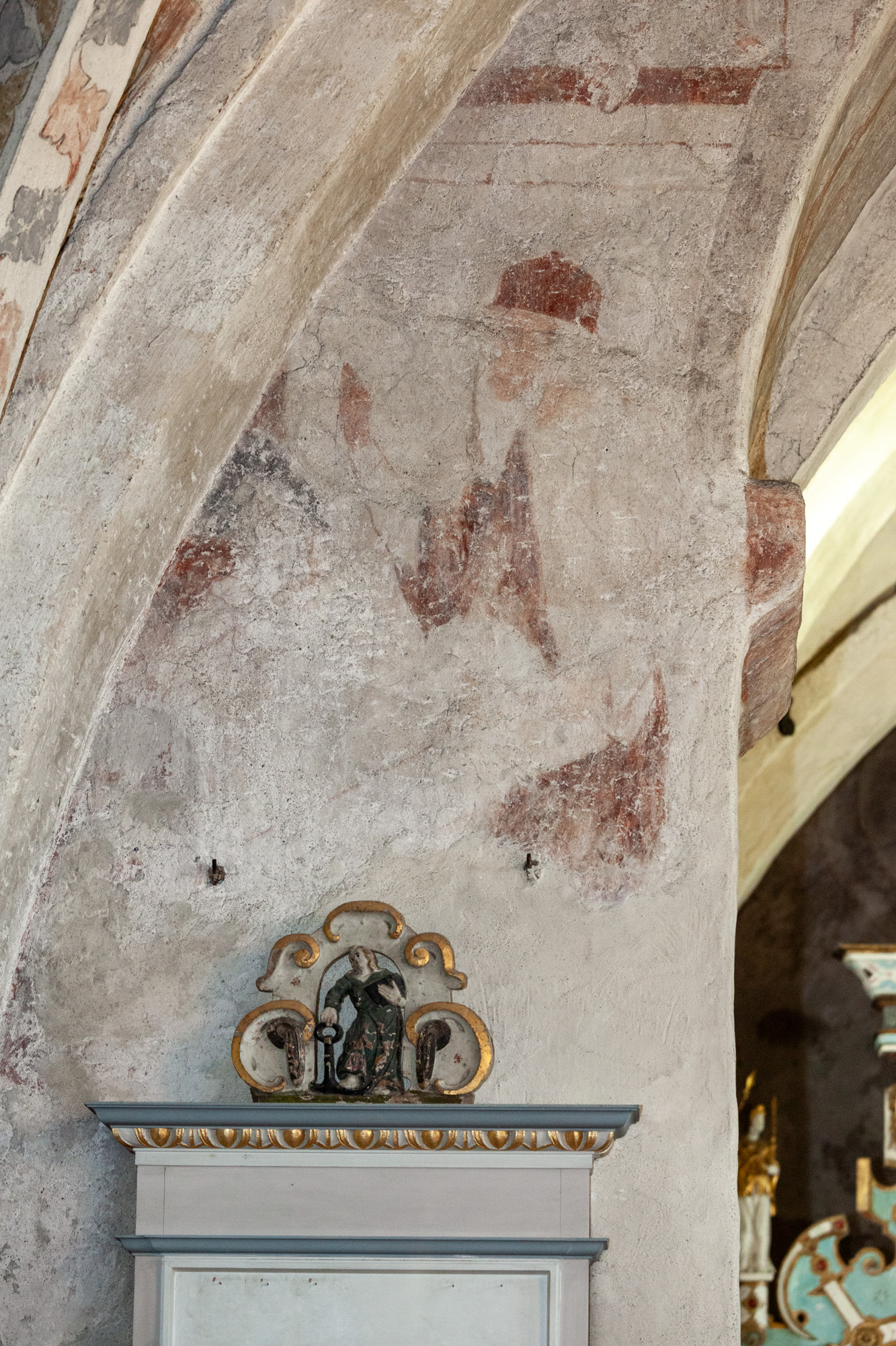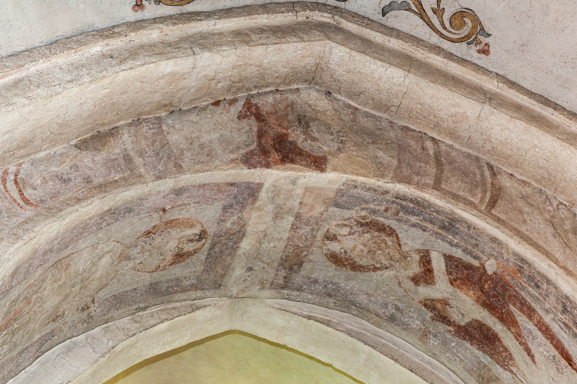 I korbuen er to ærkebispehelgener med mitra, pallium og bispestav. På vangerne under kragstenene er der i begge sider en profet. I nordsiden, som kun består af nogle få fragmenter, er der et stykke af et tomt skriftbånd. Billedet i sydsiden er bedre bevaret. En person i en lang dragt sidder ned med et skriftbånd med udvisket tekst.