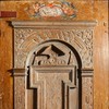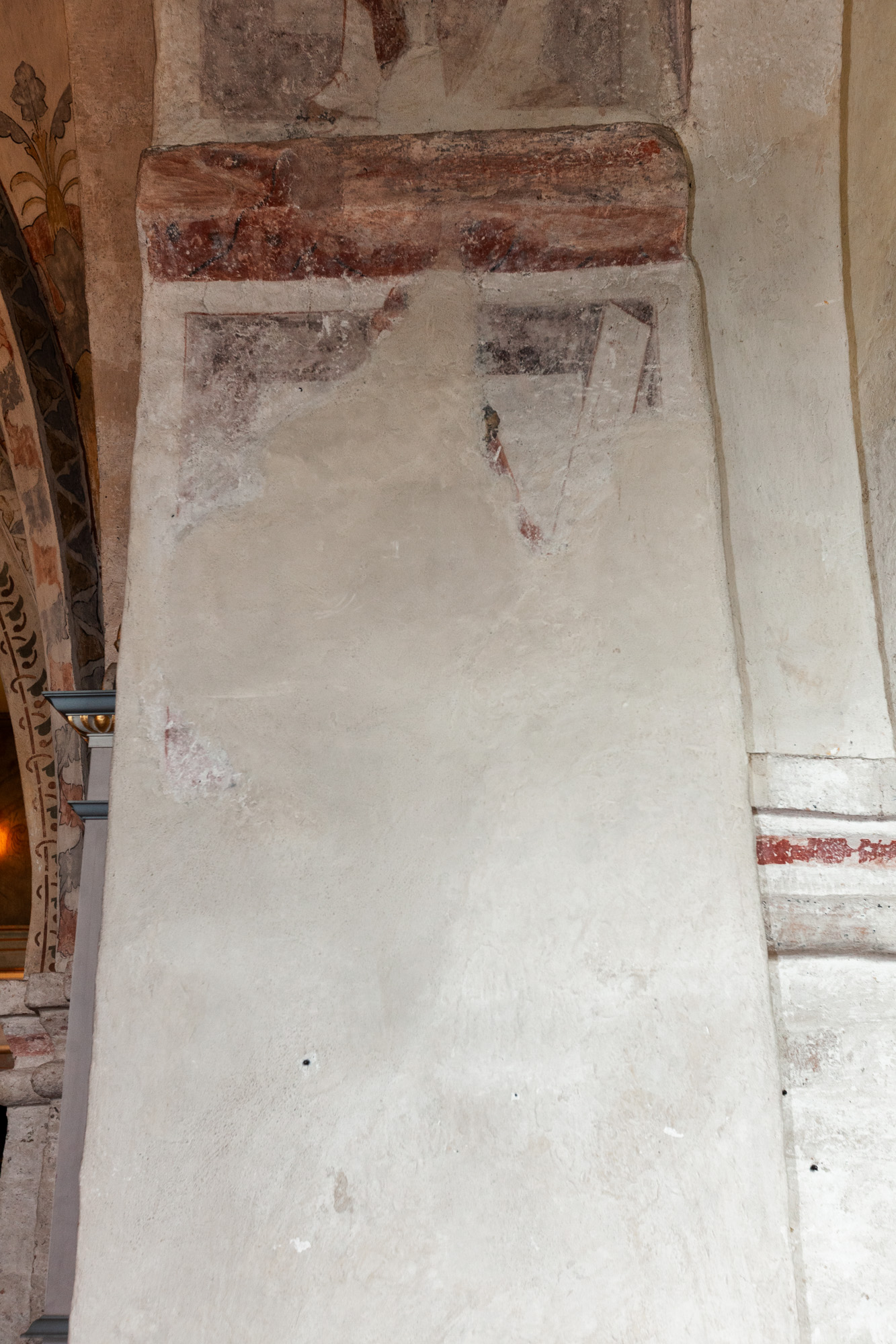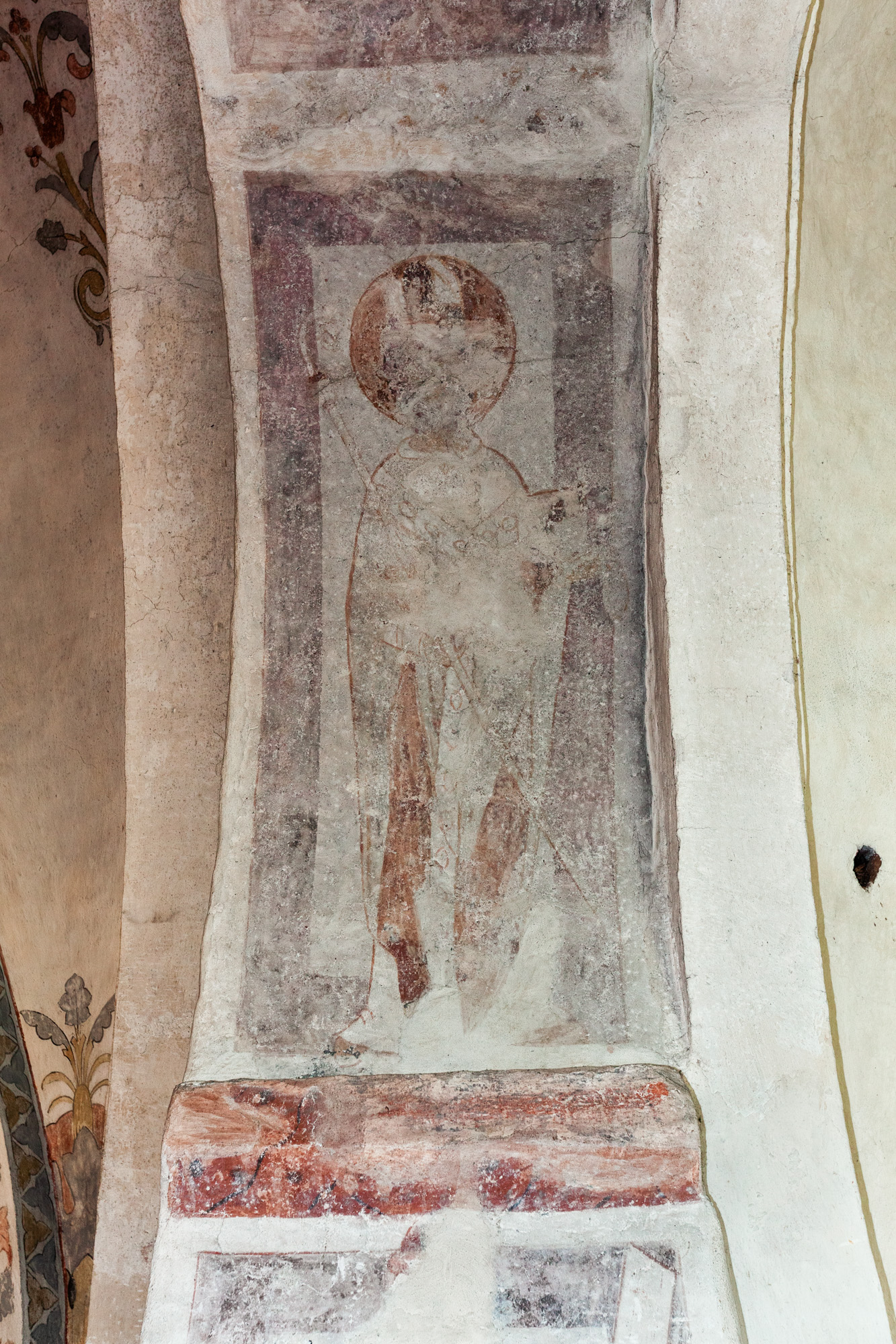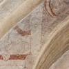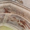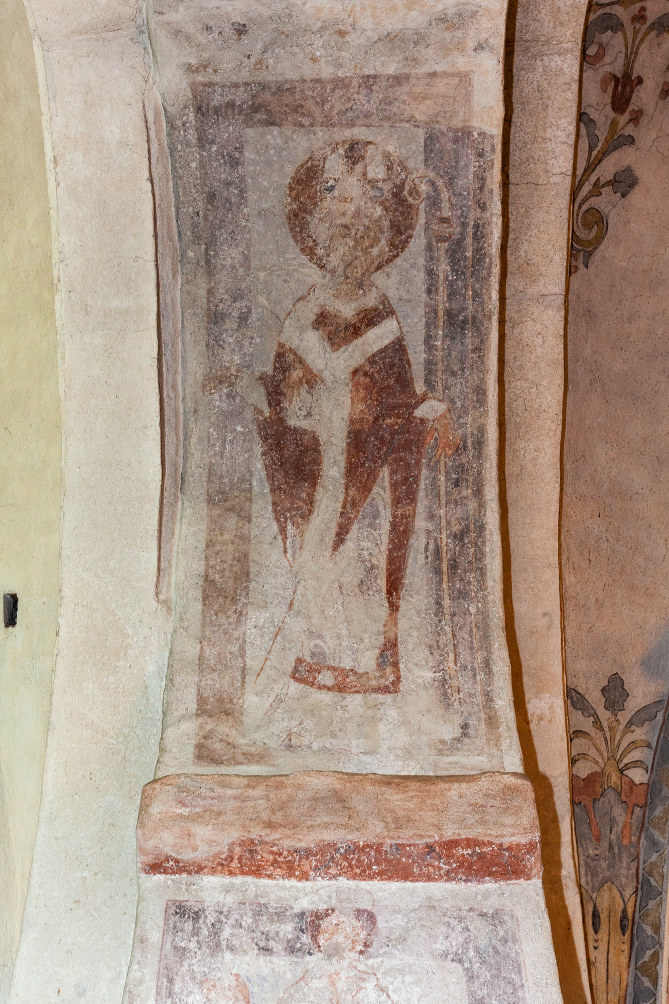 I korbuen er to ærkebispehelgener med mitra, pallium og bispestav. På vangerne under kragstenene er der i begge sider en profet. I nordsiden, som kun består af nogle få fragmenter, er der et stykke af et tomt skriftbånd. Billedet i sydsiden er bedre bevaret. En person i en lang dragt sidder ned med et skriftbånd med udvisket tekst.