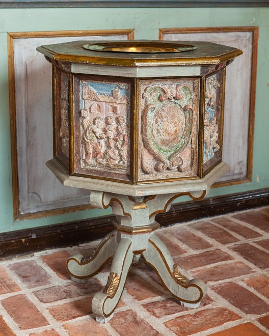 De genkendelige motiver på døbefonten er Noas Ark, Fremstillingen i Templet og Jesu Dåb.