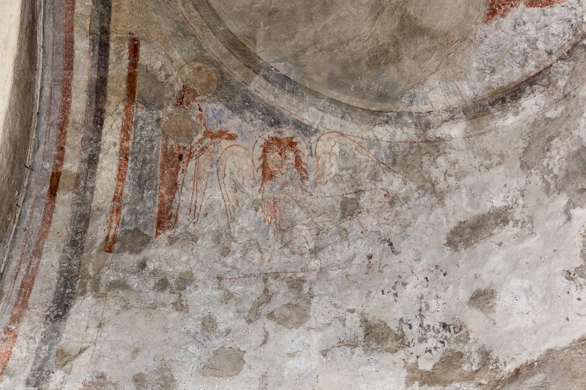 På triumfvæggen over buen (og over hvælv) er der profeter og rester af en medaljon. Det er alt sammen meget utydeligt. På triumvæggens nordside er det muligvis Maria og Barnet, der er skåret igennem af skjoldbuen. Til højre står en person med hat og et tomt skriftbånd. Det kan være Esajas. Motivet findes også i Stehag.