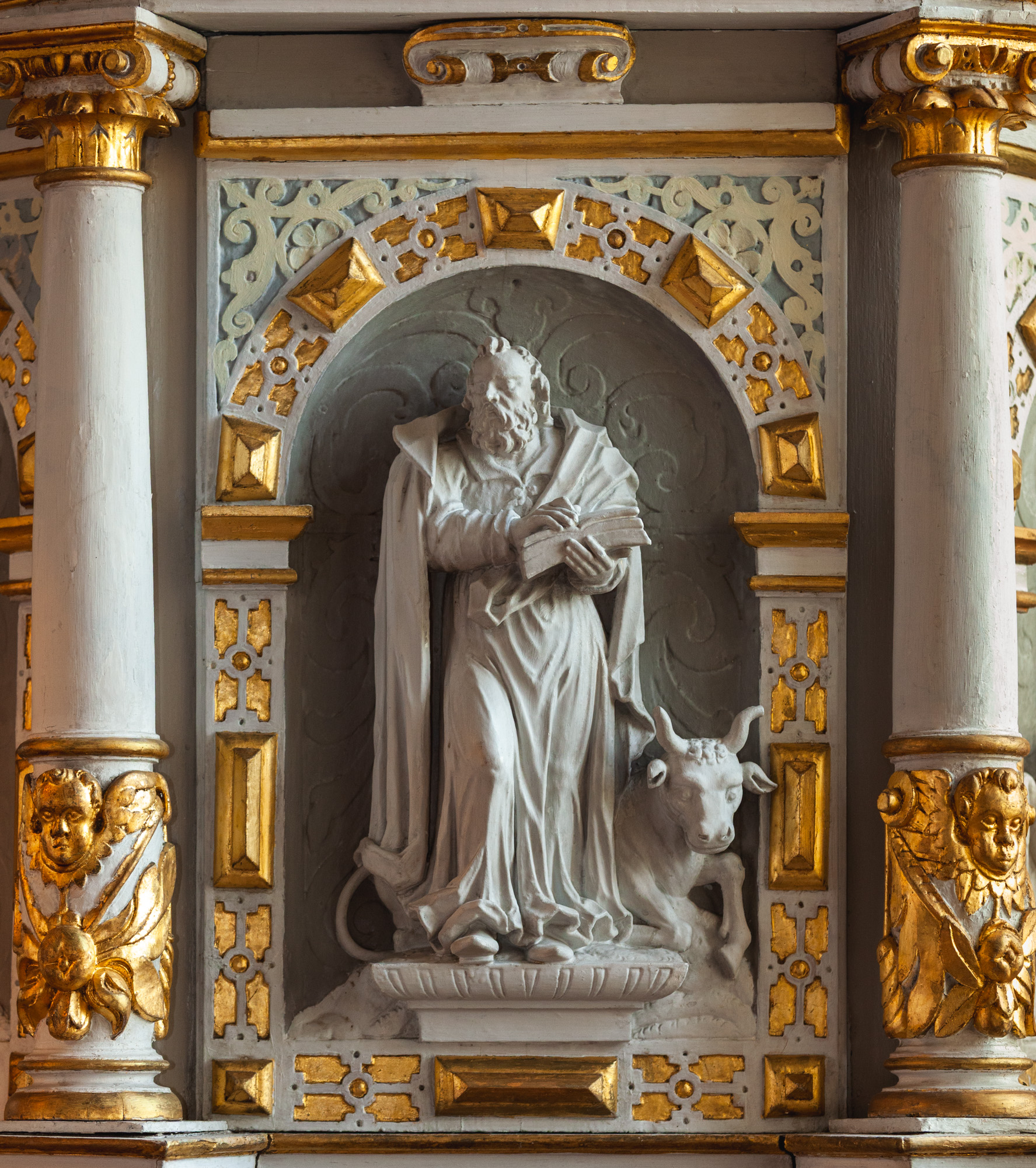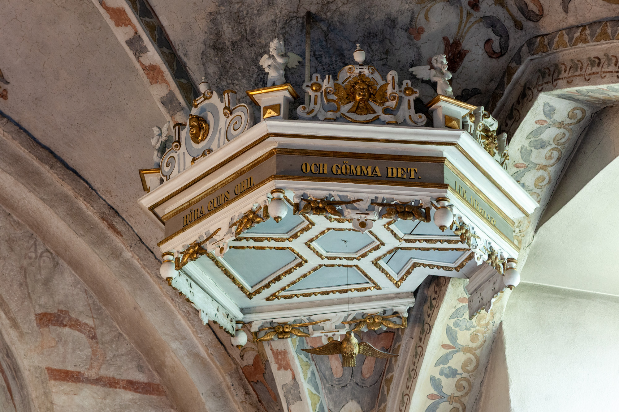 Lydhimlen har opsatser, der består af en kartouche med et engleansigt. På hjørnerne er der postamenter med engle. Langs underkanten er der hængestykker med frugter og i hjørnerne kugler.