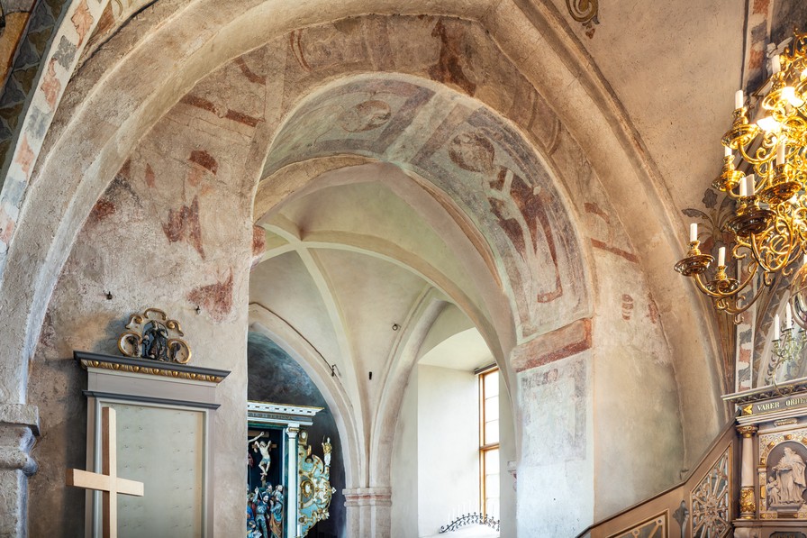 I apsis er på den traditionelle plads en Majestas Domini med dele af evnagelistsymboler. Johannes og Maria kan ses.