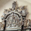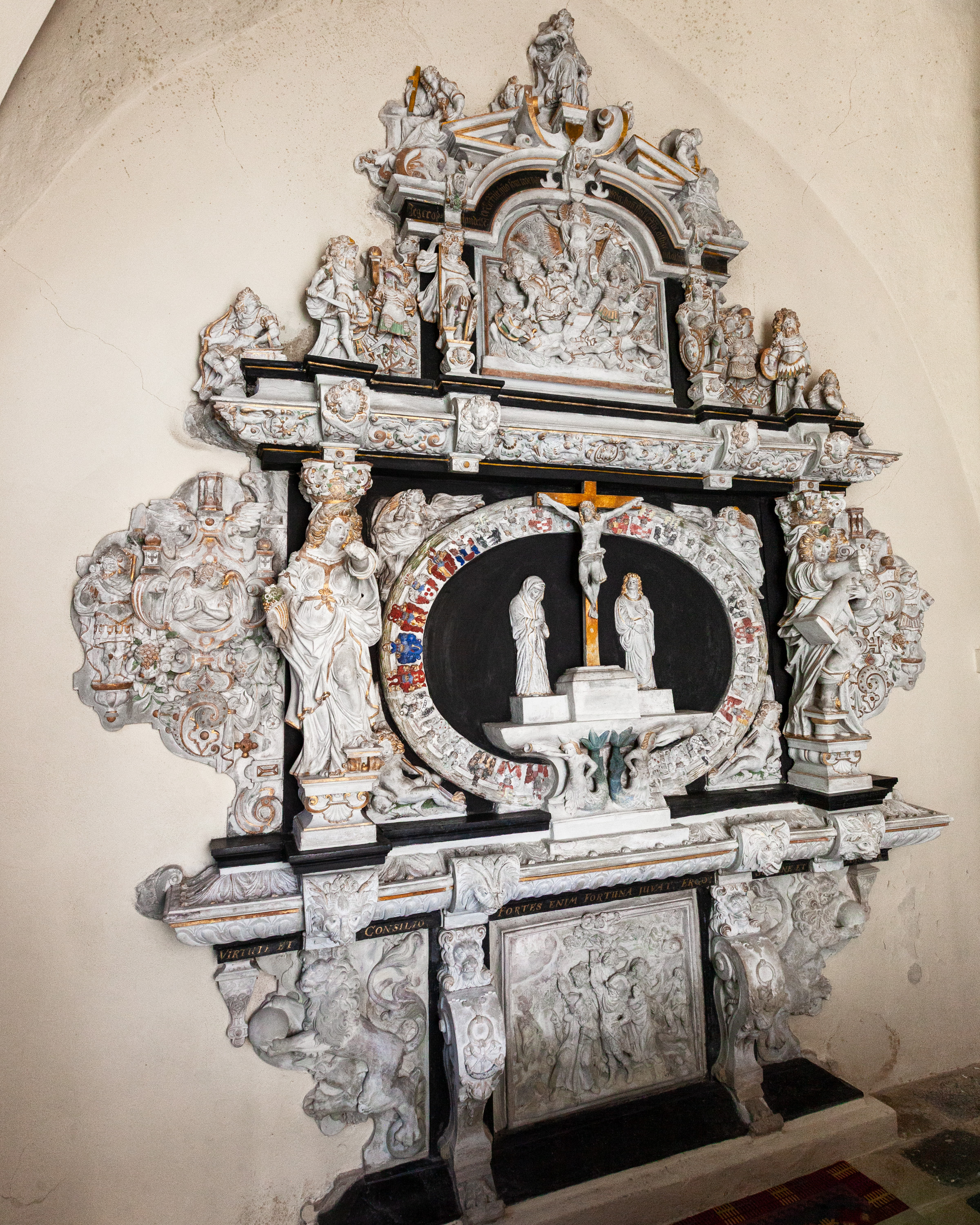 Over gesimsen er en fremstilling af korsfæstelsen omgivet af en oval ramme med de 32 anevåben. I kanten af rammen er en laurbærkrans. Under konsollen med korsfæstelsesgruppen sidder to lurblæsende havfruer. I hjørnerne foroven er der to engle og forneden to putti med hjerneskaller. Til den ene side for ovalen står Abundantia (overflødighedens gudinde) med sit overflødighedshorn, og til den anden side Fortitudo (tapperheden) med en brudt søjle. På vingerne er der frugtklaser, en kartouche med en engel og øverst et timeglas med vinger (tidens flugt).