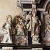 Mellem storfelterne er der skulpturer, der fremstiller Peter, de fire evangelister samt en uidentificeret apostel.