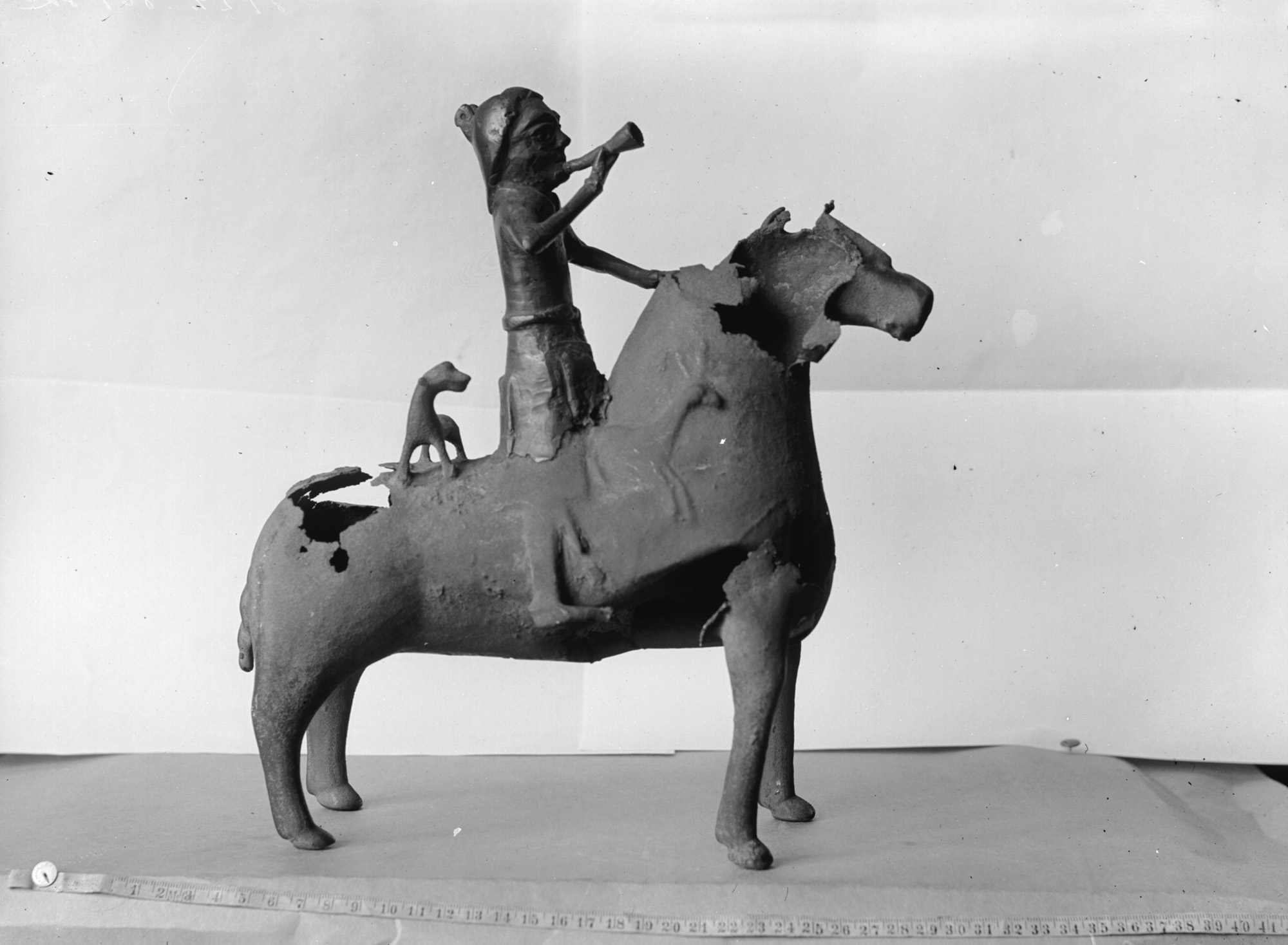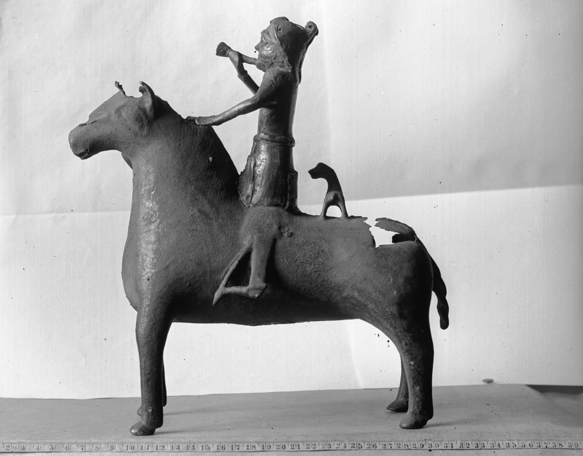 Akvamanile til liturgisk håndvask. Den er formet som en rytter. Rytteren har benene strakt ud i stigbøjlerne. For munden holder han et horn. På hestens ryg bag rytteren står en hund.