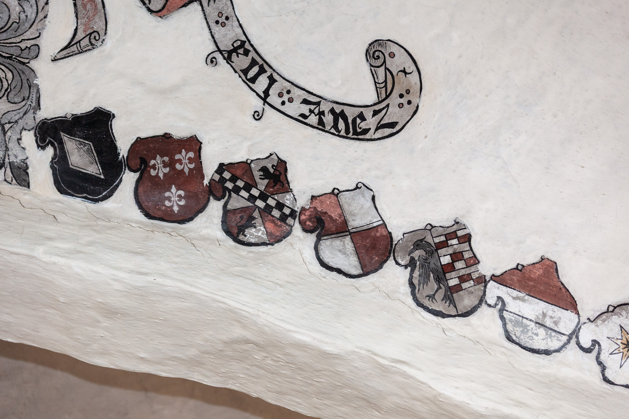 I koret findes 2 gange 16 anevåben for Otto Brahe, 1510-1571, og Beate Bille, 1526-1605. De blev gift i 1544. Derfor kan de dateres til perioden 1544-1571. På båndene står der: