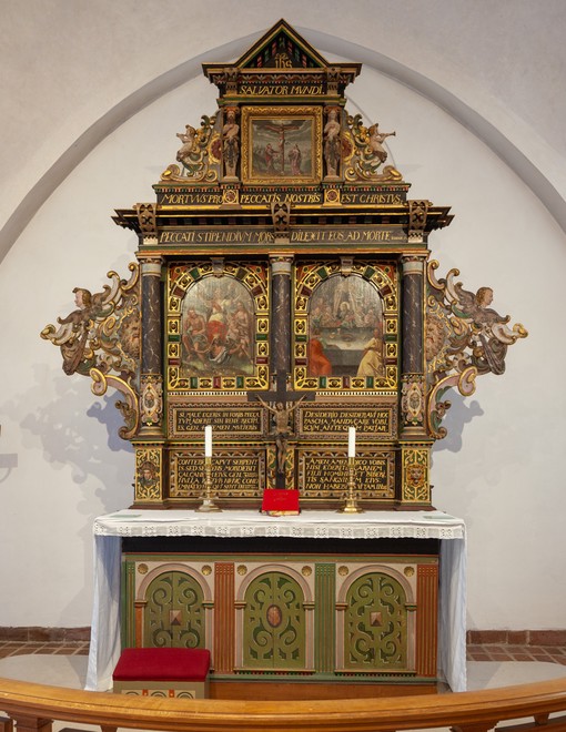 Altertavlen er blevet færdig 1623 eller 1624. Storstykket bestsår af to felter, som er delt af tre søjler. Søjlerne har glatte marmorede skafter og prydbælter. De to billedfelter er indrammet af rundbuer med diamantbosser. Under billedfelterne er der tekstfelter ligesom i postamentfelterne. Vingerne er i bruskornamentik med halve vildmandsmasker.