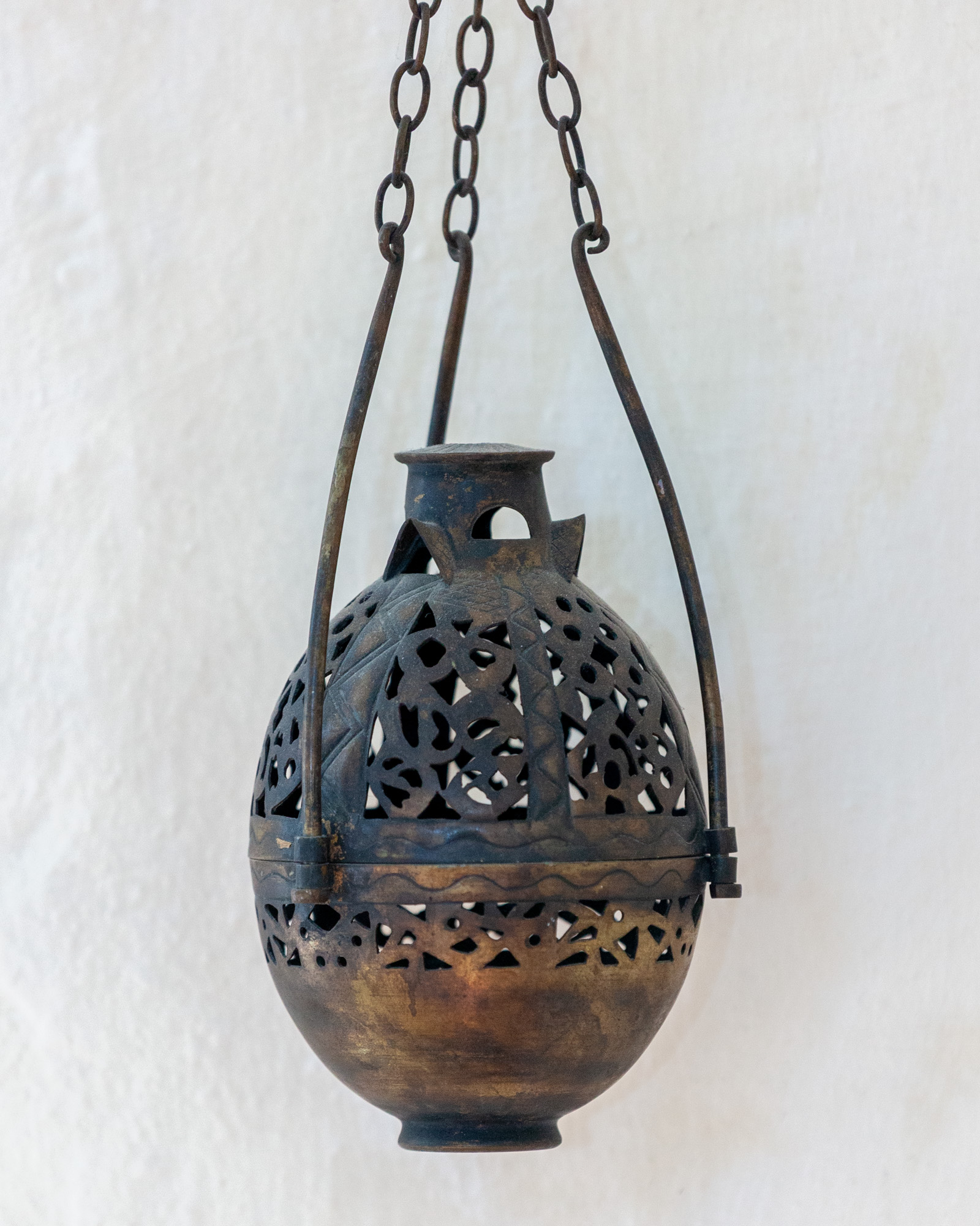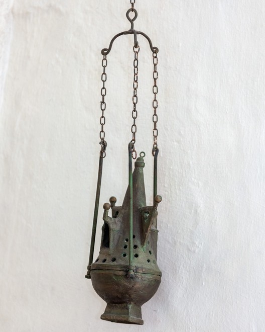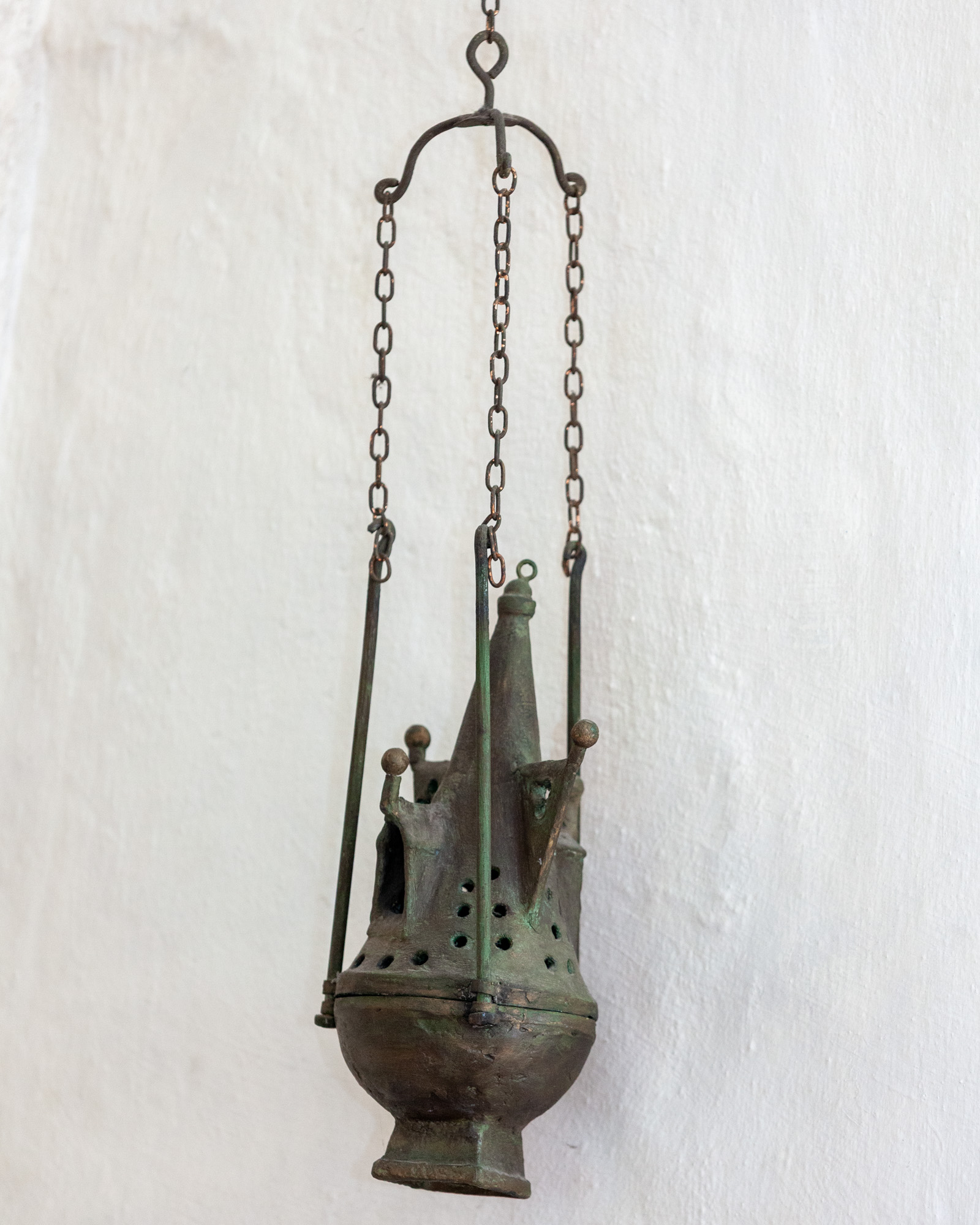 Røgelseskar af romansk type udført af malm. Lænker og stænger, som er nyere, er af messing.