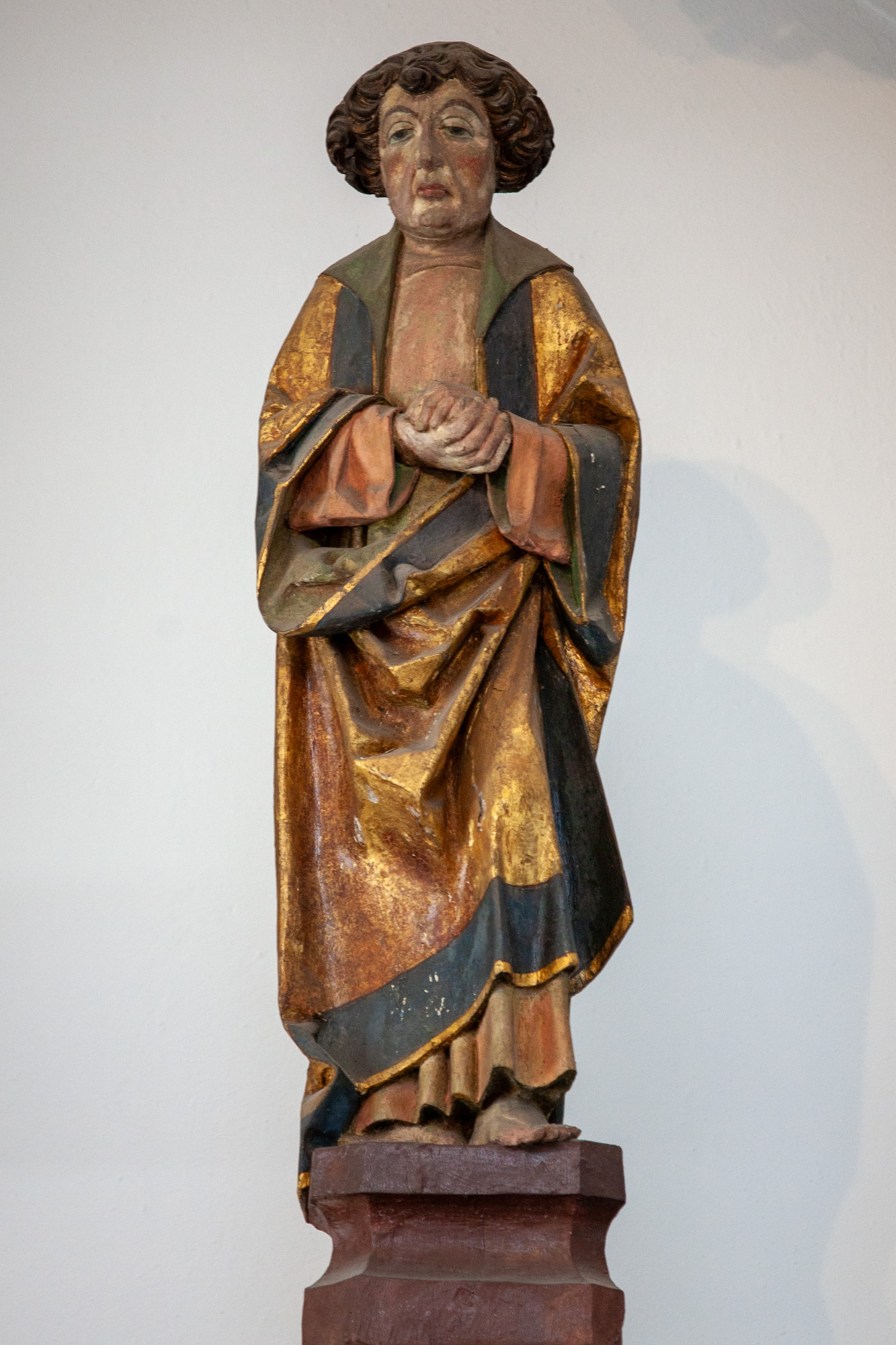 Johannes har også hænderne samlet foran brystet. Han er iført kjortel og kappe.