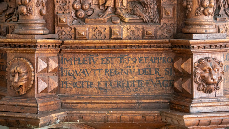 De nederste smalfelter har citater fra evangelisten ovenfor. Der er mange sammentrækninger af ord i teksterne.
