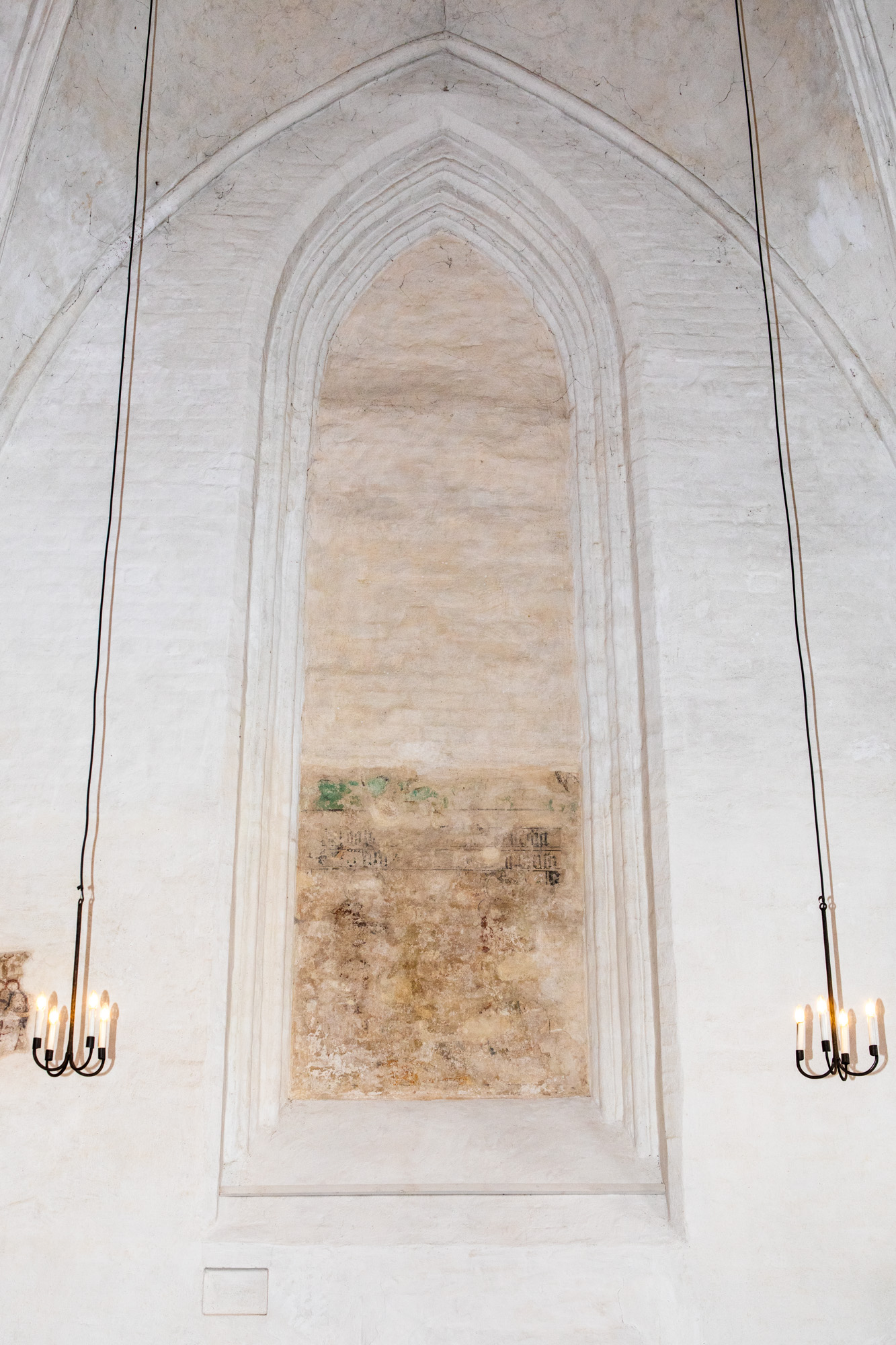 Koret, nordvæg. Til højre for ribbekonsollen ses en gruppe mennesker. Motivet er muligvis Verdensdommen. Til venstre for konsollen ses en stående person og nogle farvepletter. Det kan have hørt til Verdensdommen.