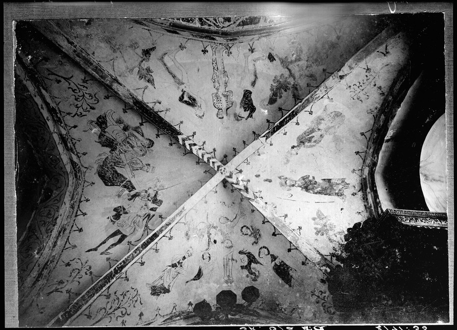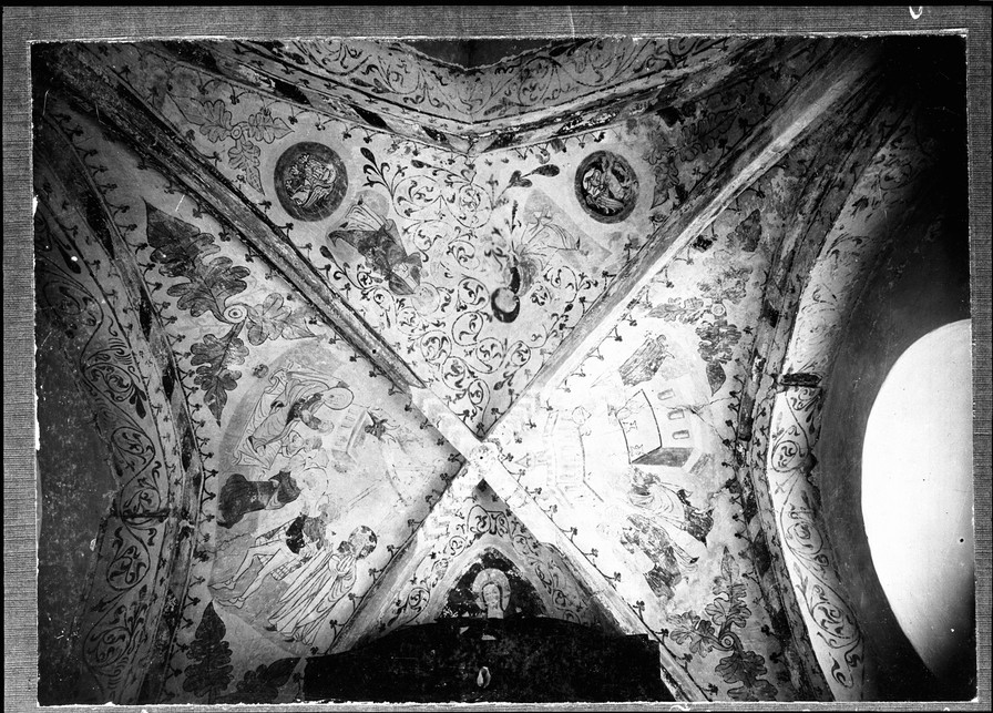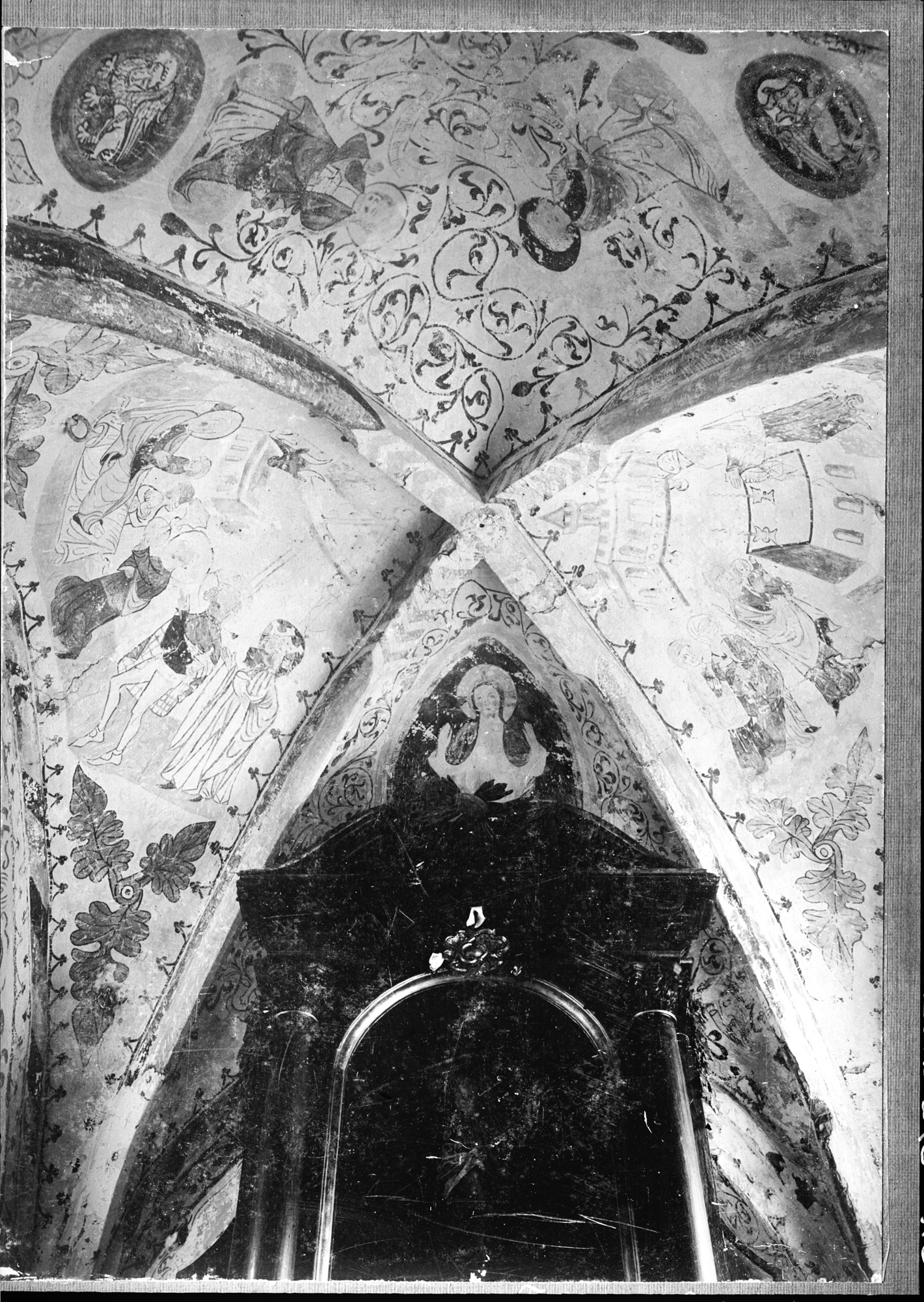 Østkappe: Kristus i mandorla flankeret af medaljoner med evangelistsymboler: Matthæus og Johannes. Lukas og Markus flankerede Bebudelsen på vestkappen. Jomfru Maria og Johannes Døber findes på væggen nedenunder og hører formentlig med til billedet af Kristus som verdensdommer.