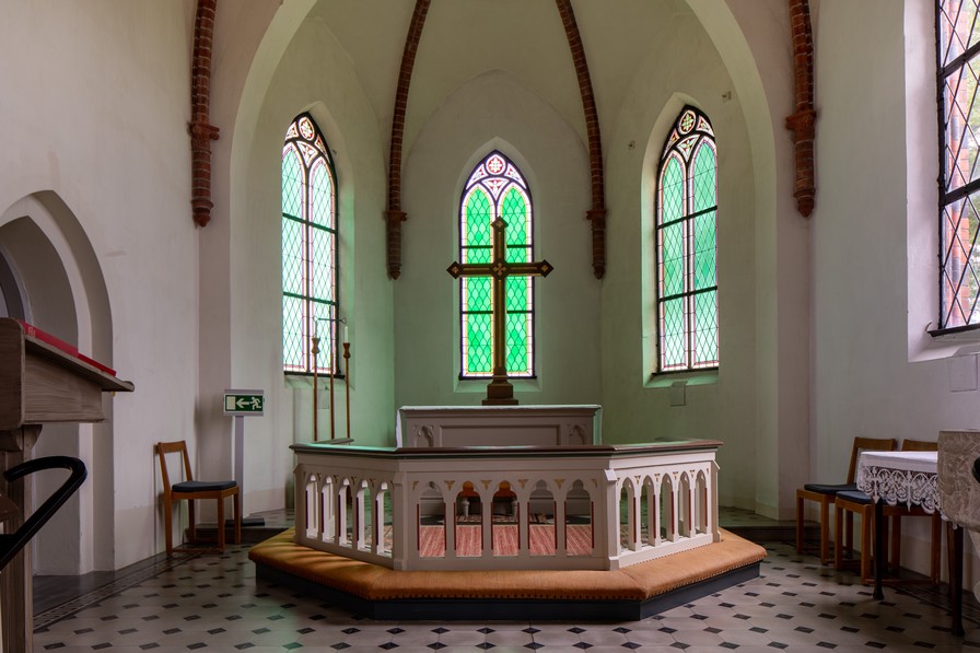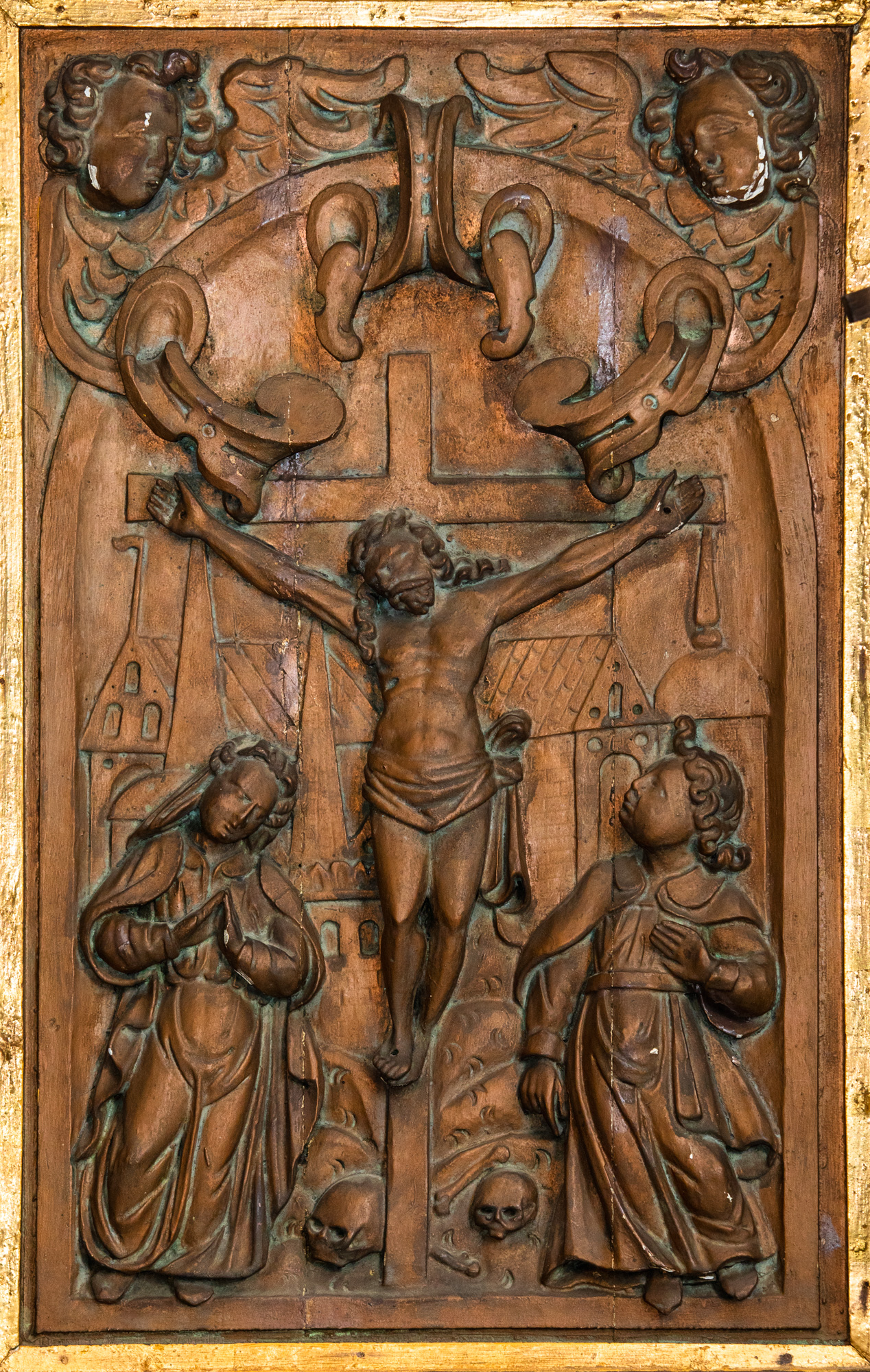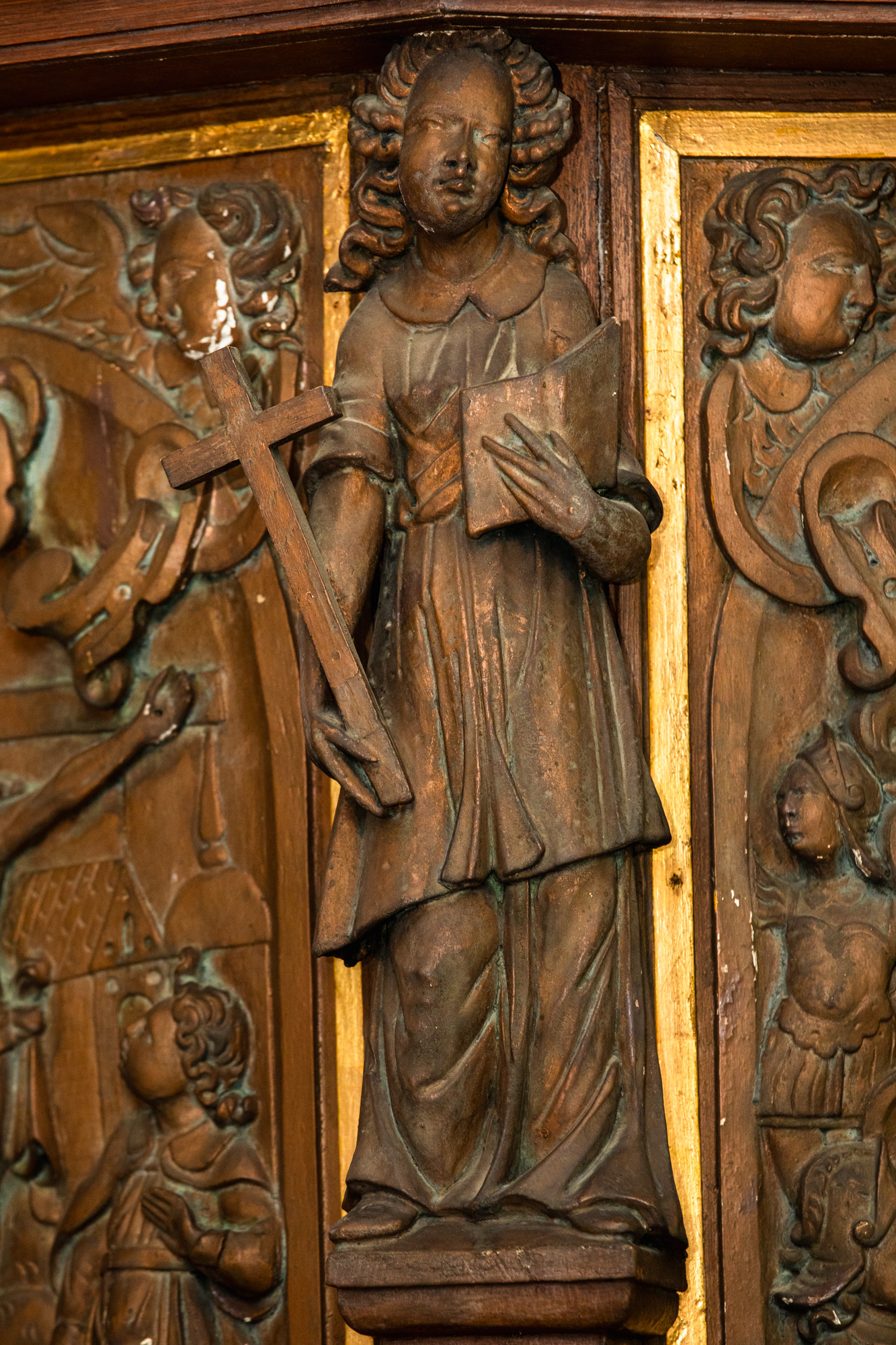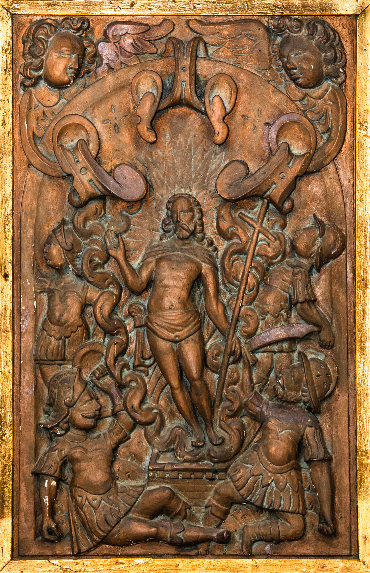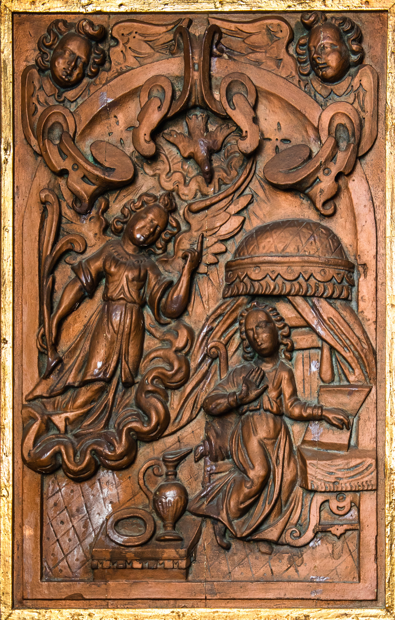 Motiverne i storfelterne er Bebudelsen, Jesu Fødsel, Korsfæstelsen og Opstandelsen. De er alle indrammet af en enkel rundbue med store engleansigter i sviklerne.