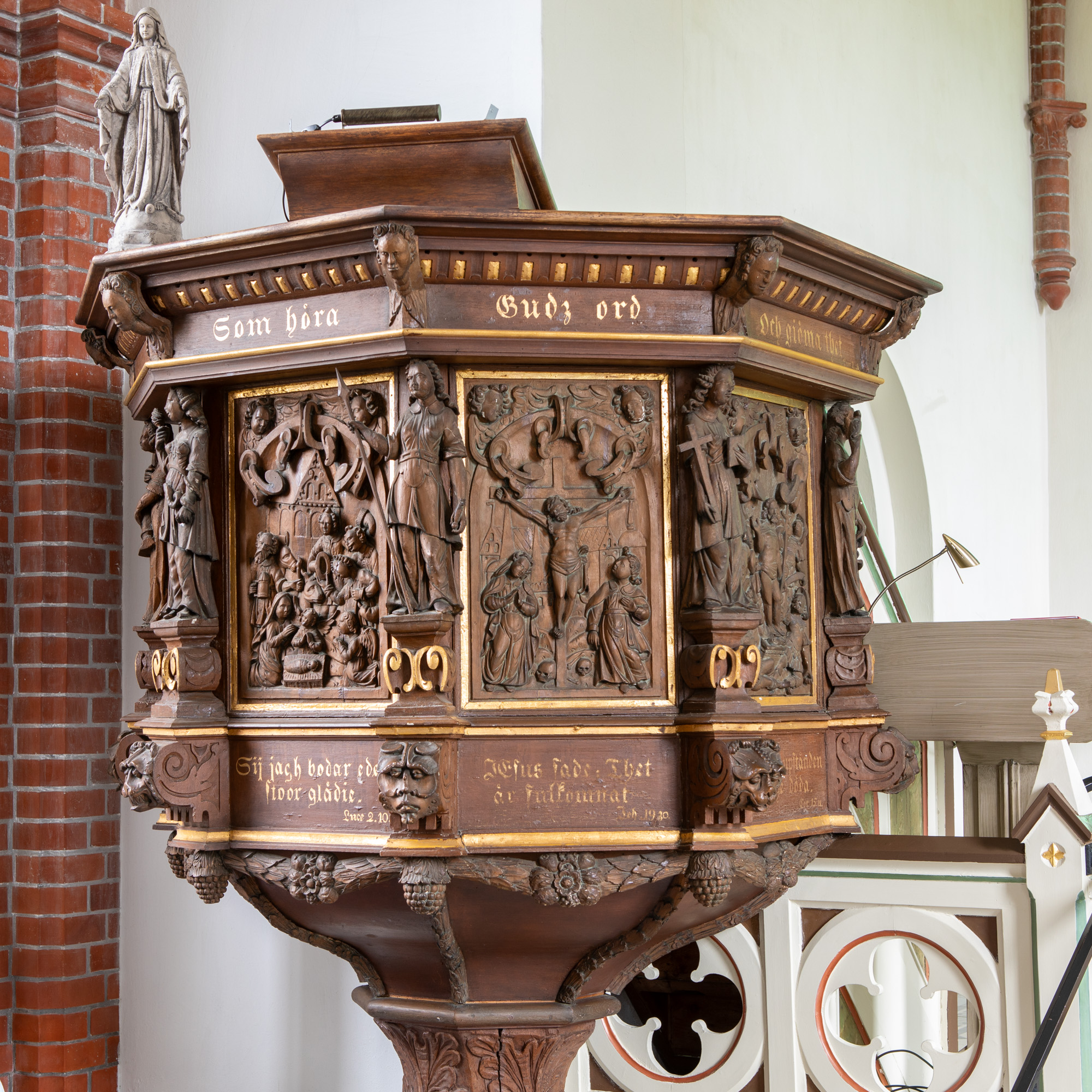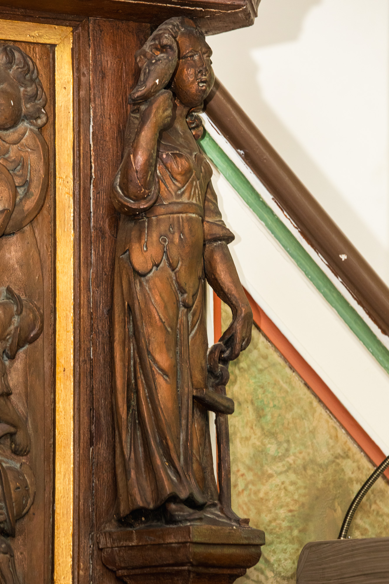 Predickestolen som bleff giort 1652 er aff bellhuggen werck och euge tömmer, er intet forgylt eller stafferit, haffuer och jngen crone offuer sigh.