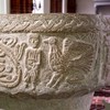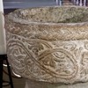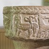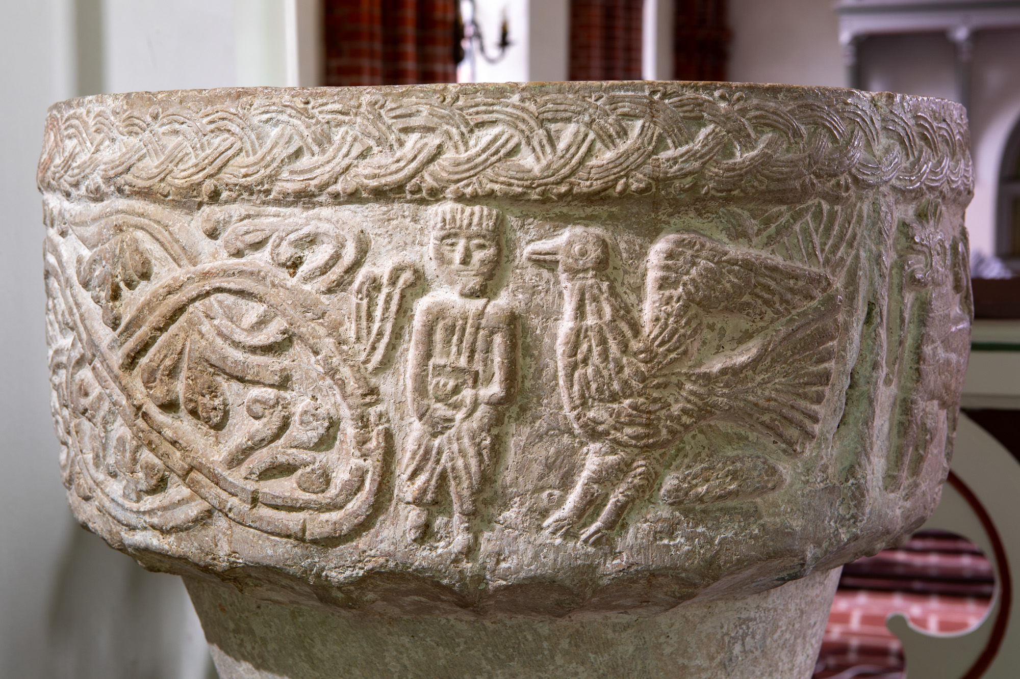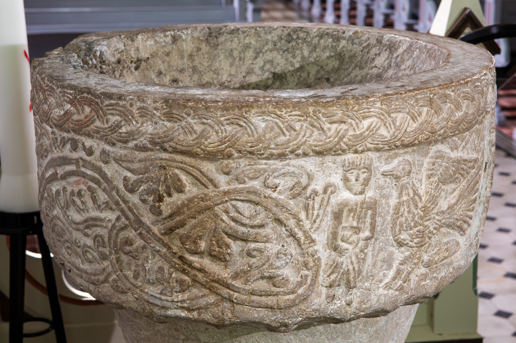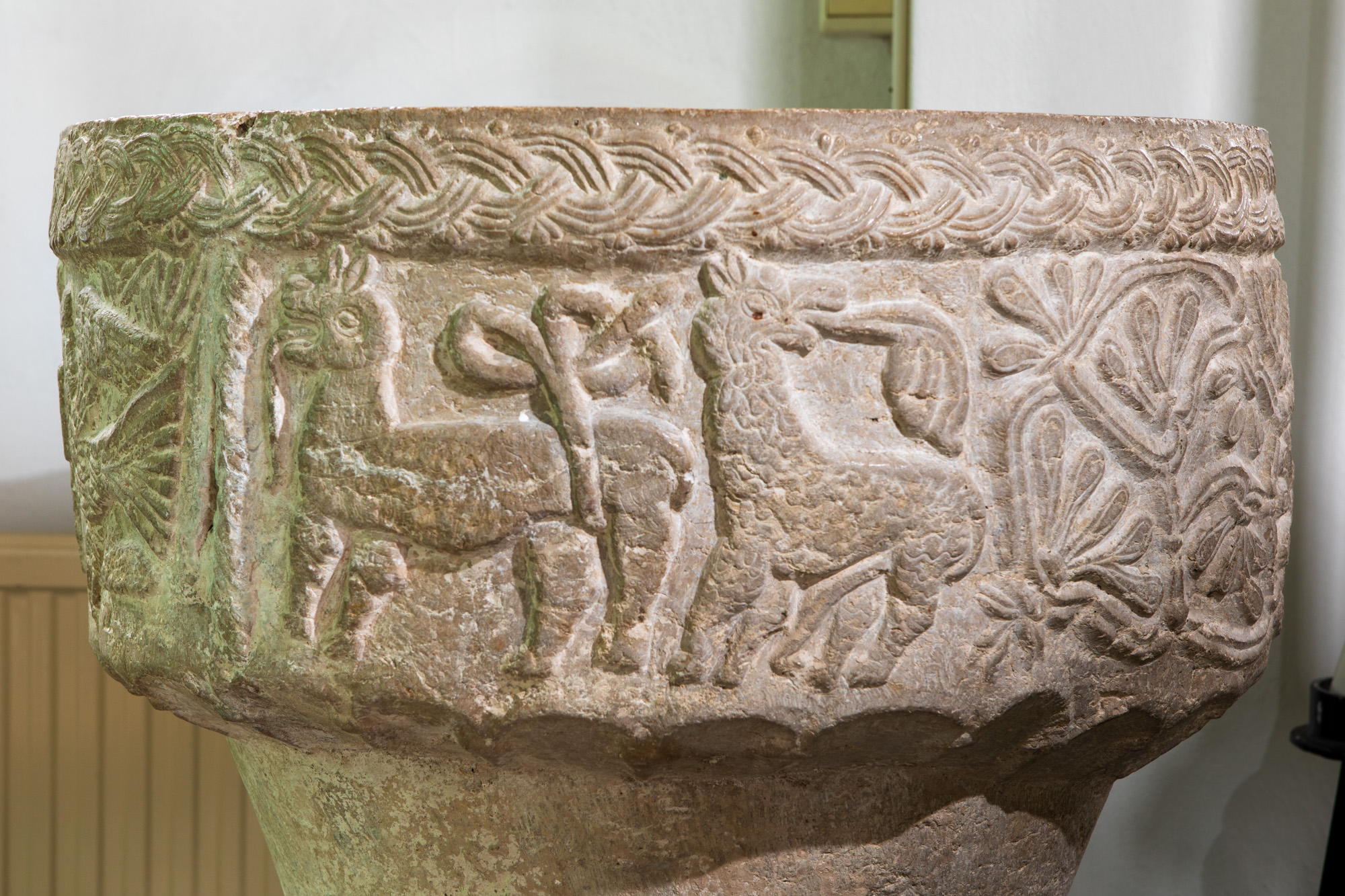 Døbefont af kalksten. Kun kummen er bevaret. Den har udtømningshul, men ikke fals. Under bunden er den udsmykket med en slags skællignende blade. Langs den øverste kant går et flettet bånd. Derunder er en mand med en bog og en fugl. Dernæst ses to dyrefigurer. Den forreste har en lang tunge, der hænger lige ned, og en hale, der deler sig i to. Den anden har et akantusblad i munden. Resten af kummen er udsmykket med ornamentik.