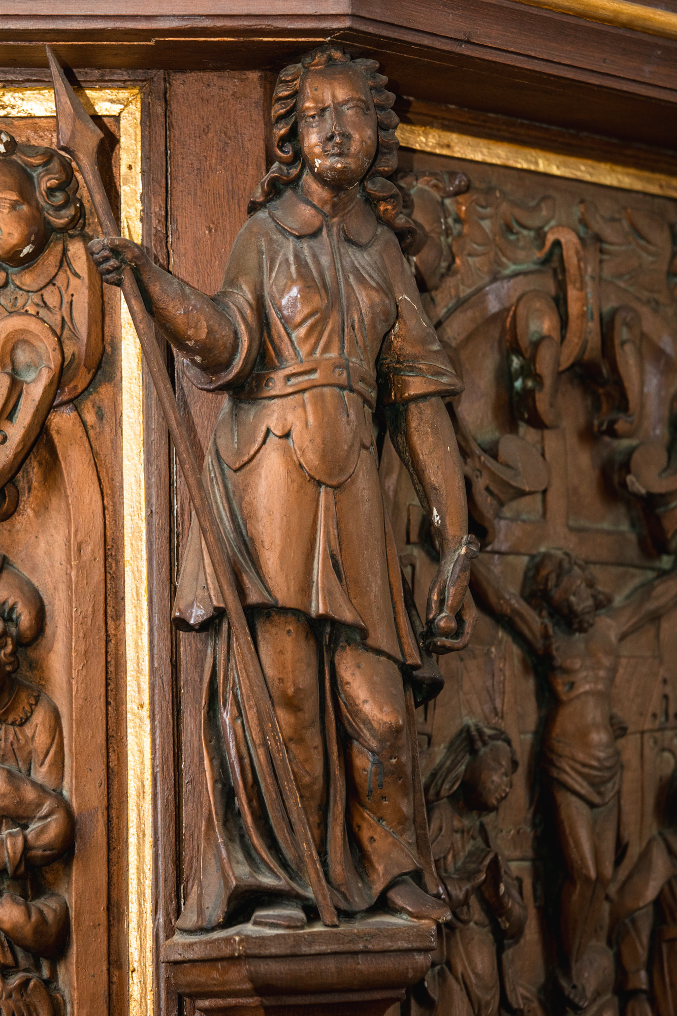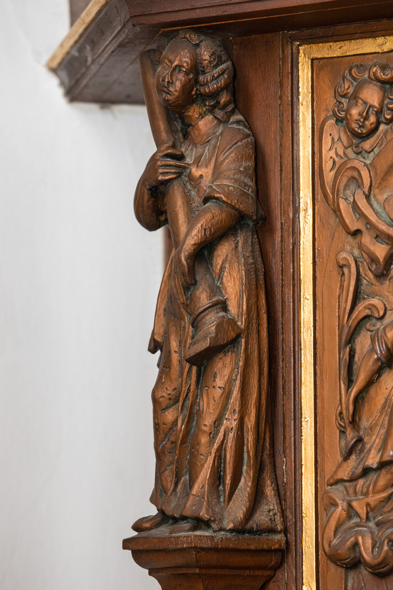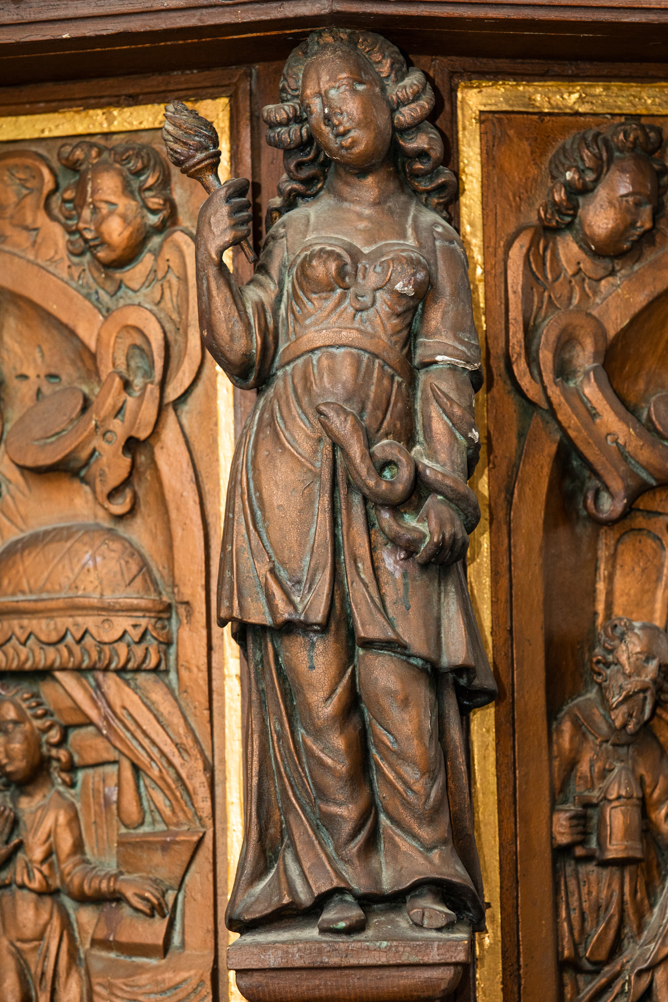 På hjørnerne står dyder som frifigurer. Det er Fortitudo, Prudentia, dyd med lanse, Fides og Spes. Konsollerne har løvehoveder. Hængestykkerne består af laurbærkranse med blomsterroset og frugter i hjørnerne.