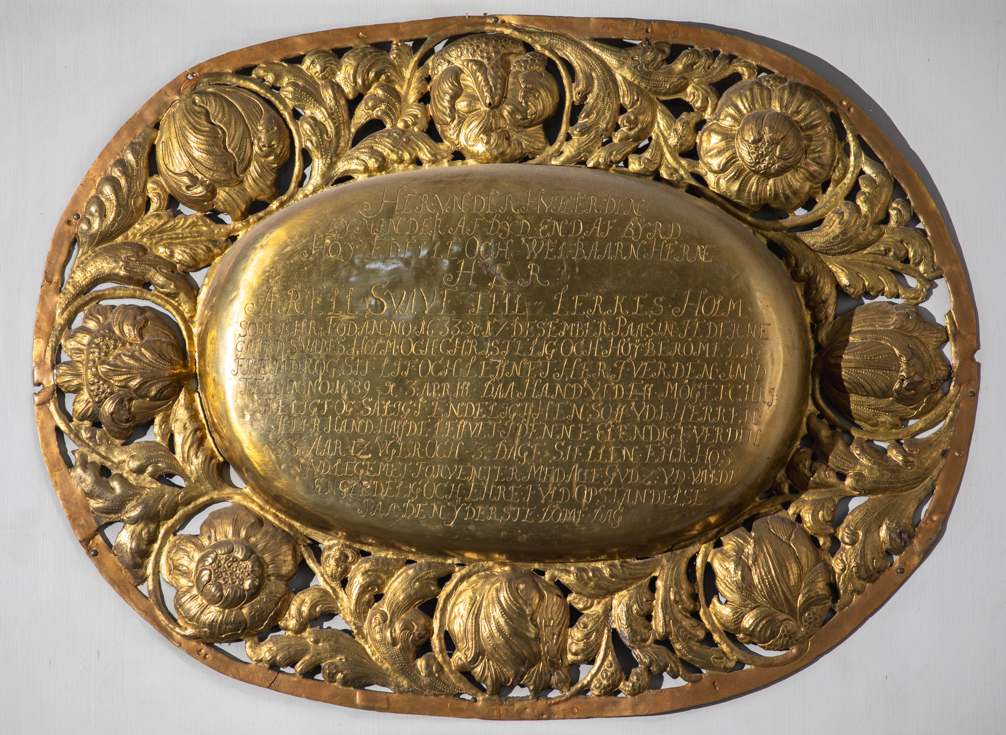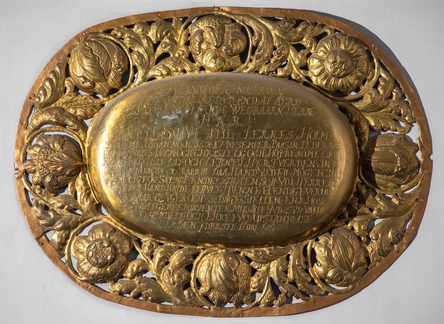 Herunder hviler den eymender(?) af dyd end af byrd høyedelle och welbaarn herre Her Arell Svave tell Lerkesholm som ehr fød anno 1633 17 desember paa sin federne gaard Svabesholm och christelig och høyberømelig fremdrog sit lif och leffnet her i verden indtell anno 1689 3. aprill daa hand ved ett møget christeligt oc saligt endeligt hensoff udi Herren effter hand haffde leffvet i denne elendige verden 55 aar 14 uger och 3 dage. Siellen ehr hos Gud legemet forventer med alle Guds udvaldte en gledelig och ehrefuld opstandelse paa den yderste domedag.
