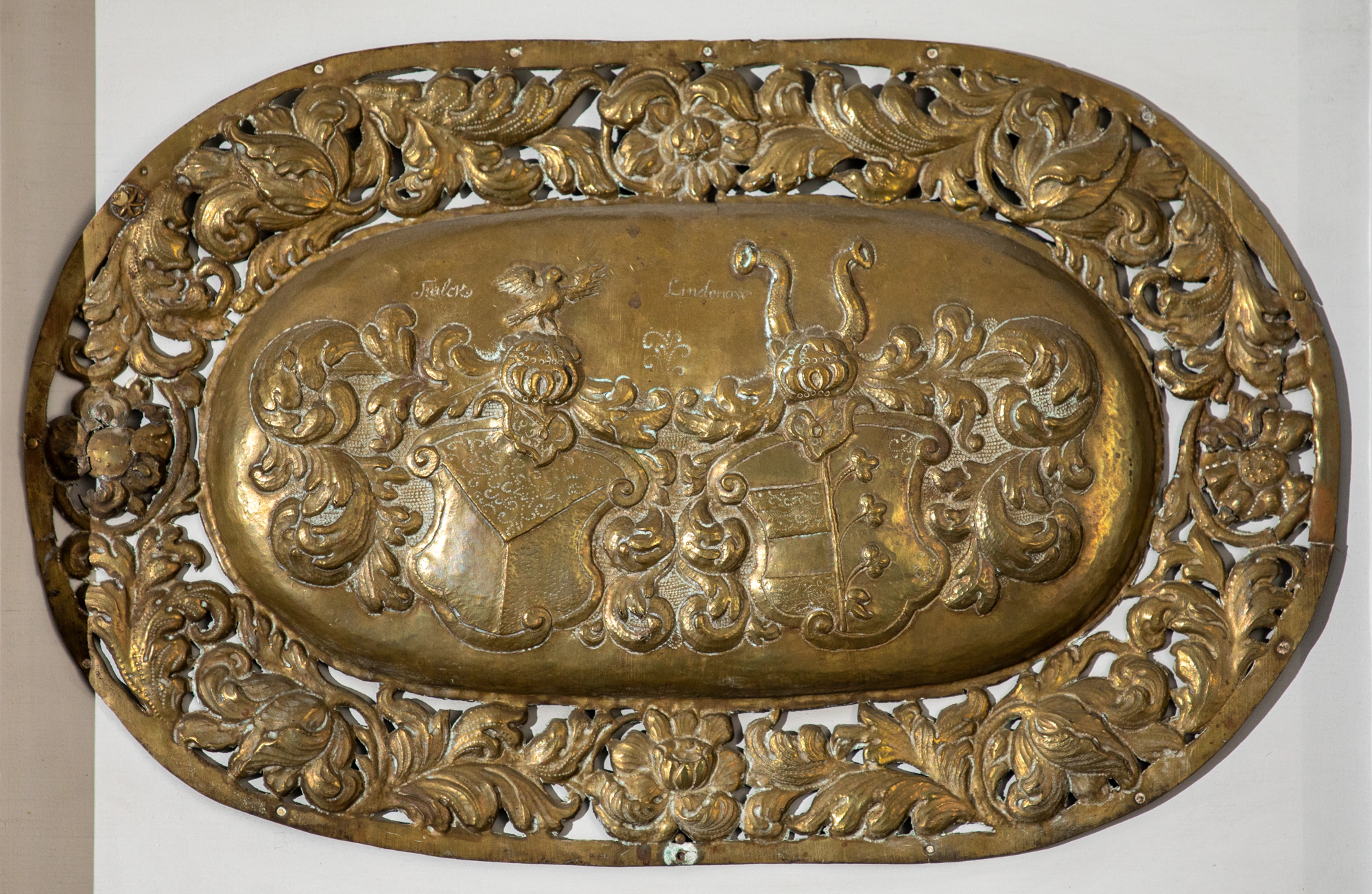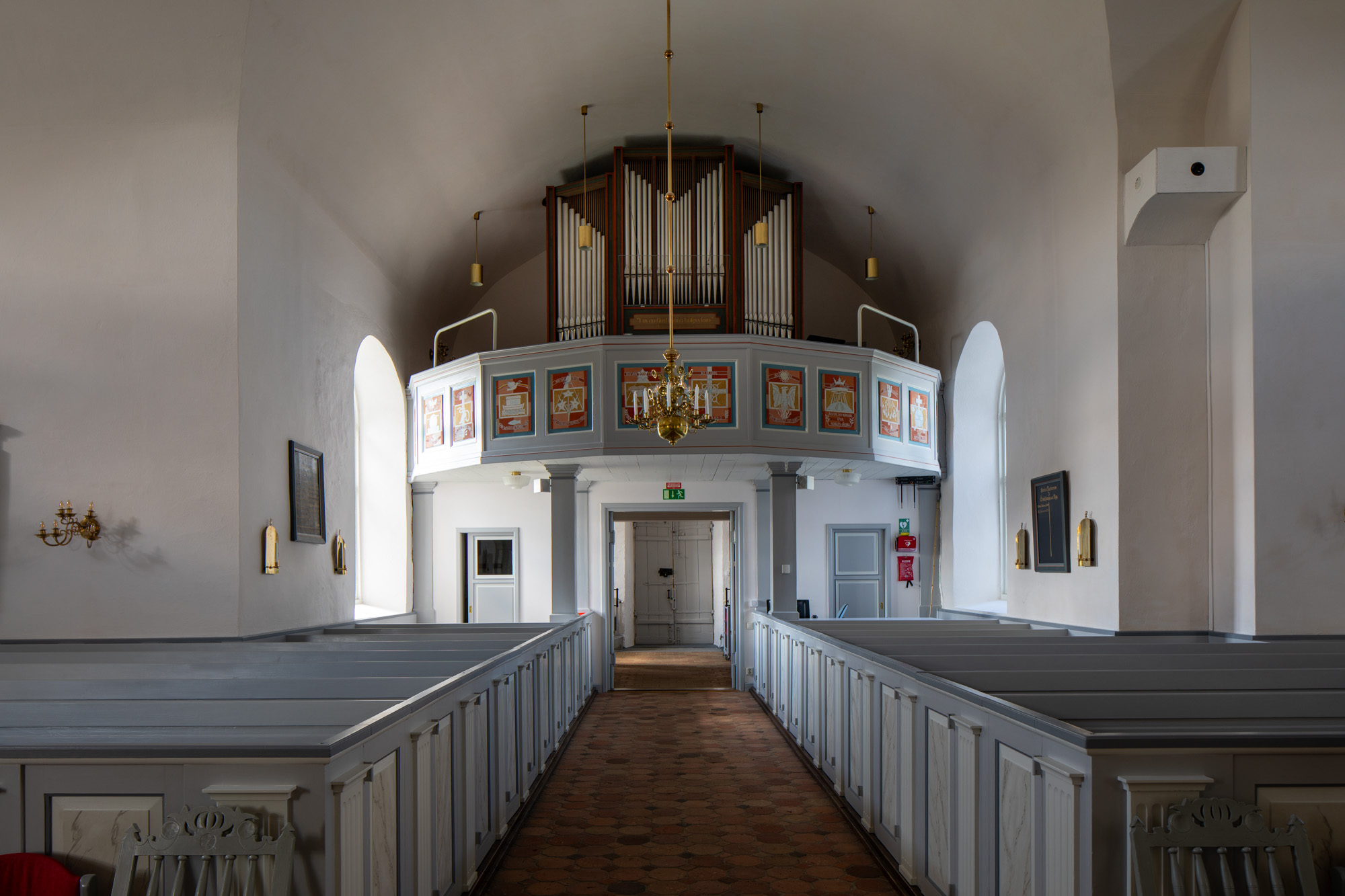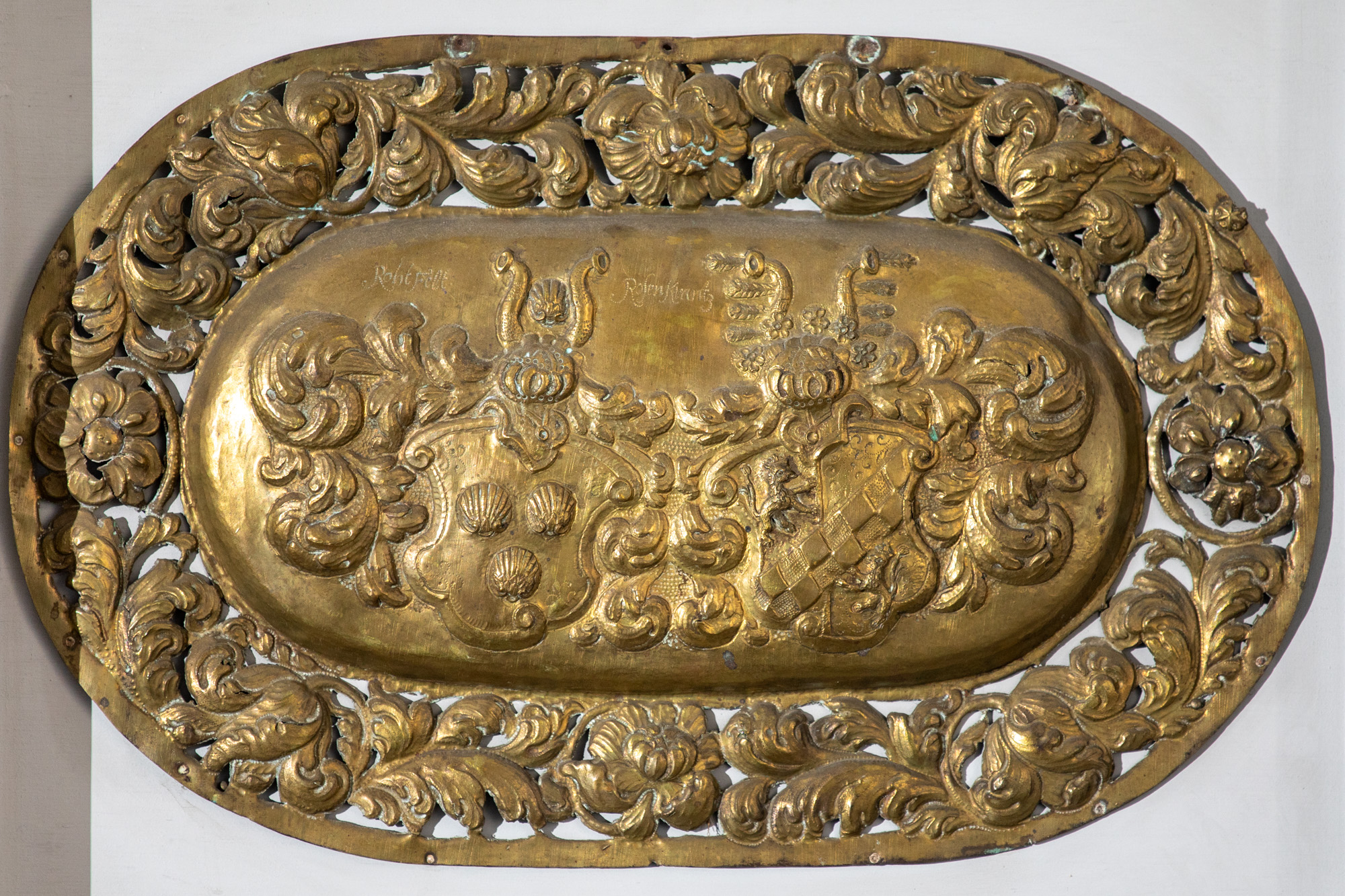 I alt 6 kisteplader og en basunblæsende engel er opsat på væggen. På de fem er der to våbenskjold på hver. På den sjette er en tekst: