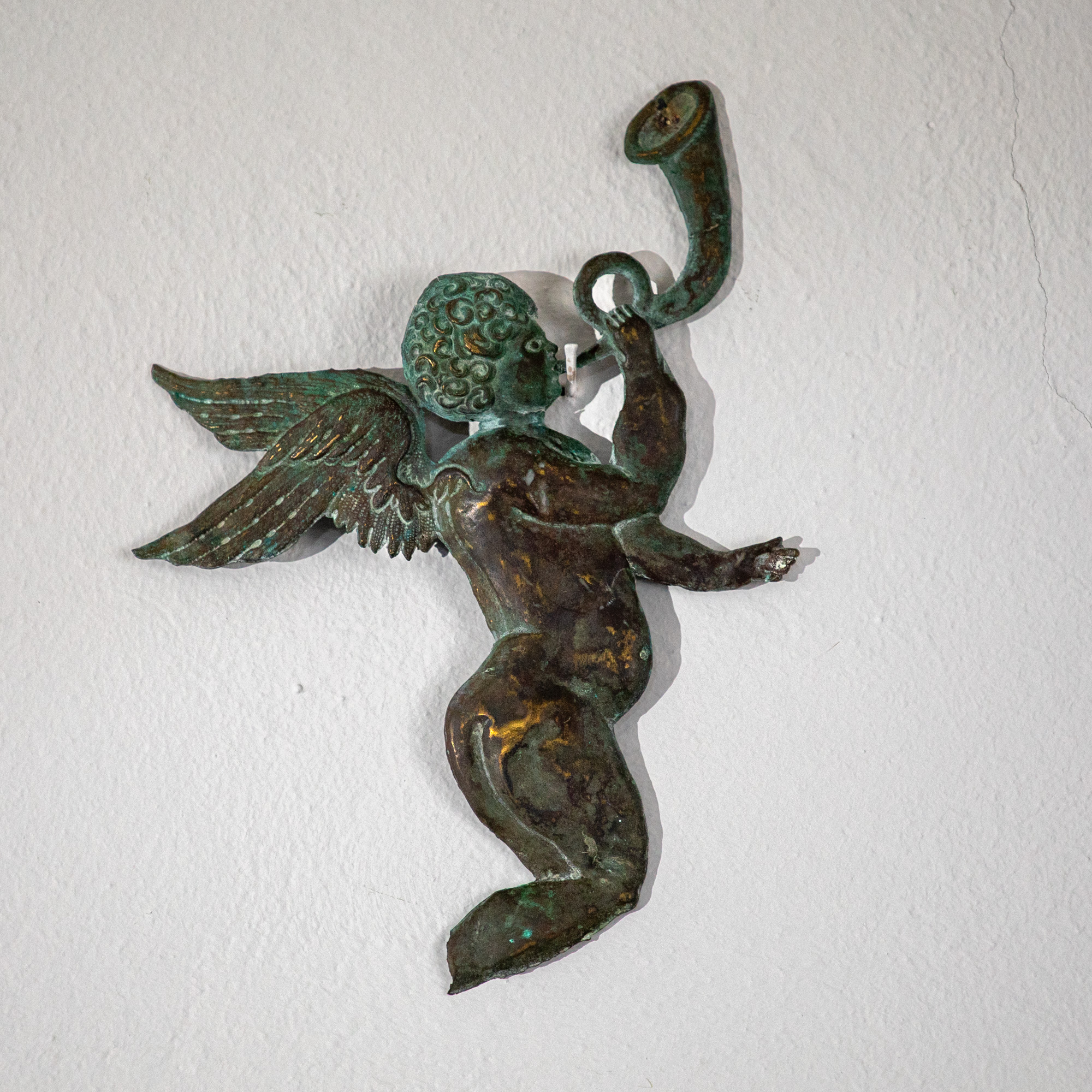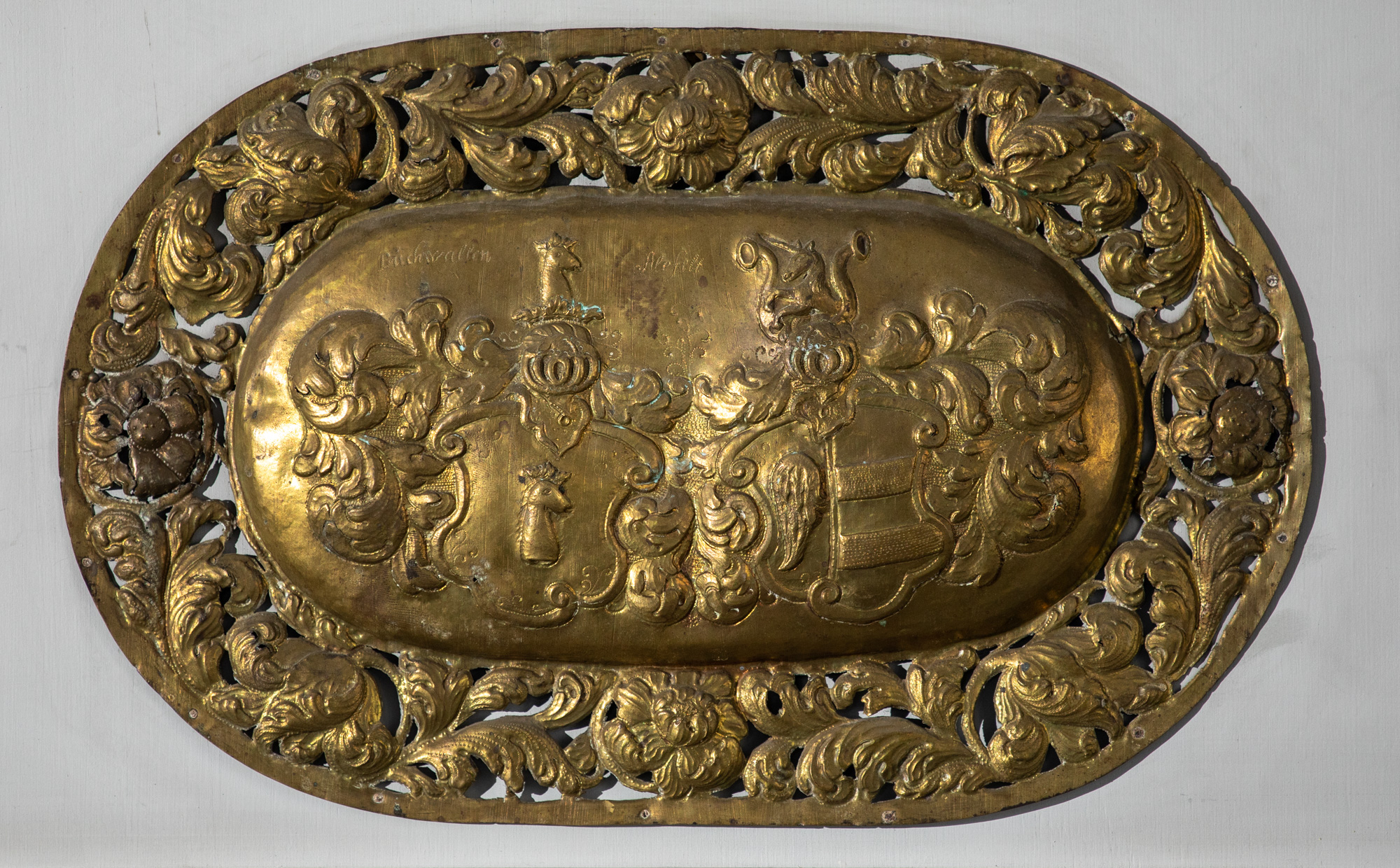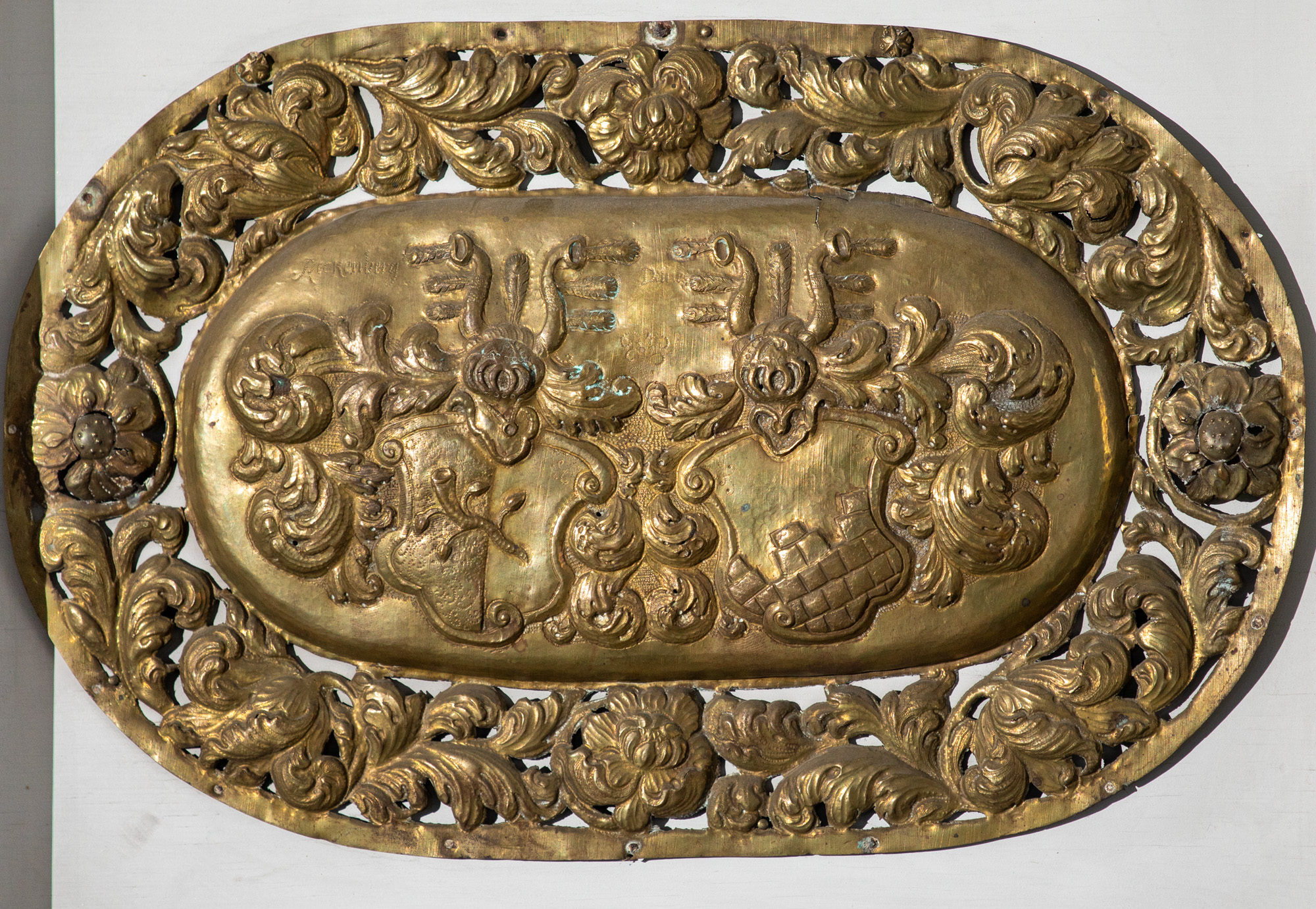 I alt 6 kisteplader og en basunblæsende engel er opsat på væggen. På de fem er der to våbenskjold på hver. På den sjette er en tekst: