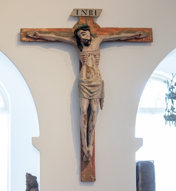 Hovedet hælder mod højre. Armene er udstrakt diagonalt med blodårer og sener. Fingrene er udstrakte. Lændeklædet er bundet i venstre side. Højre fod er lagt ind over venstre.
