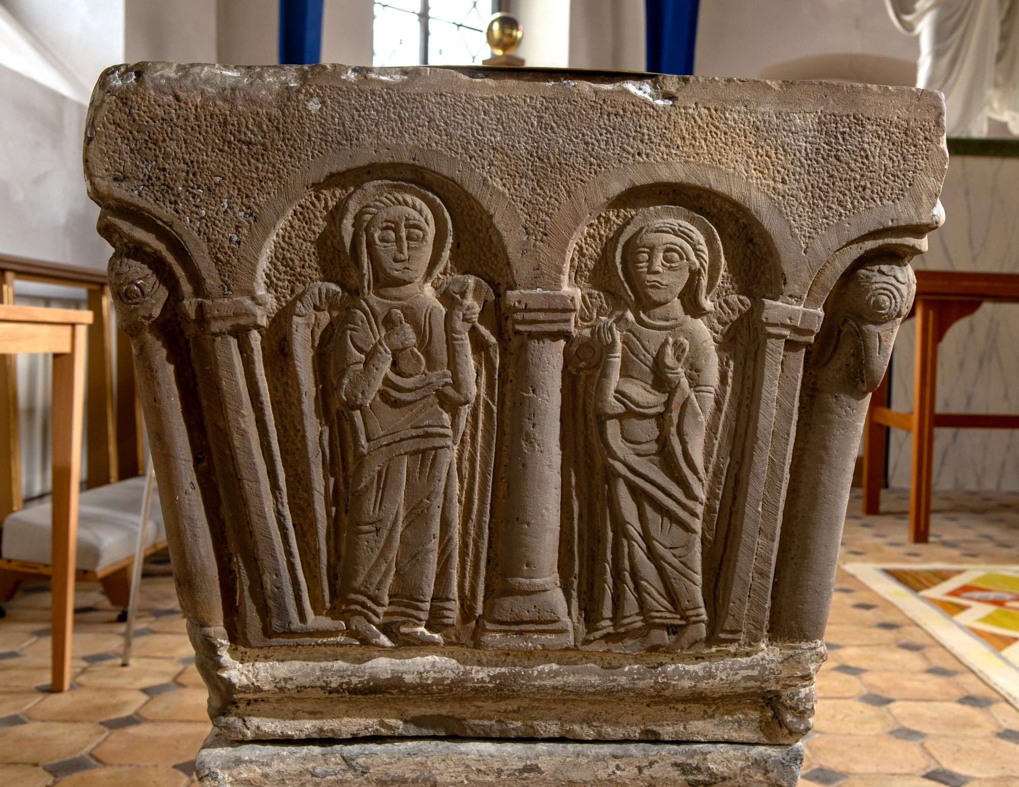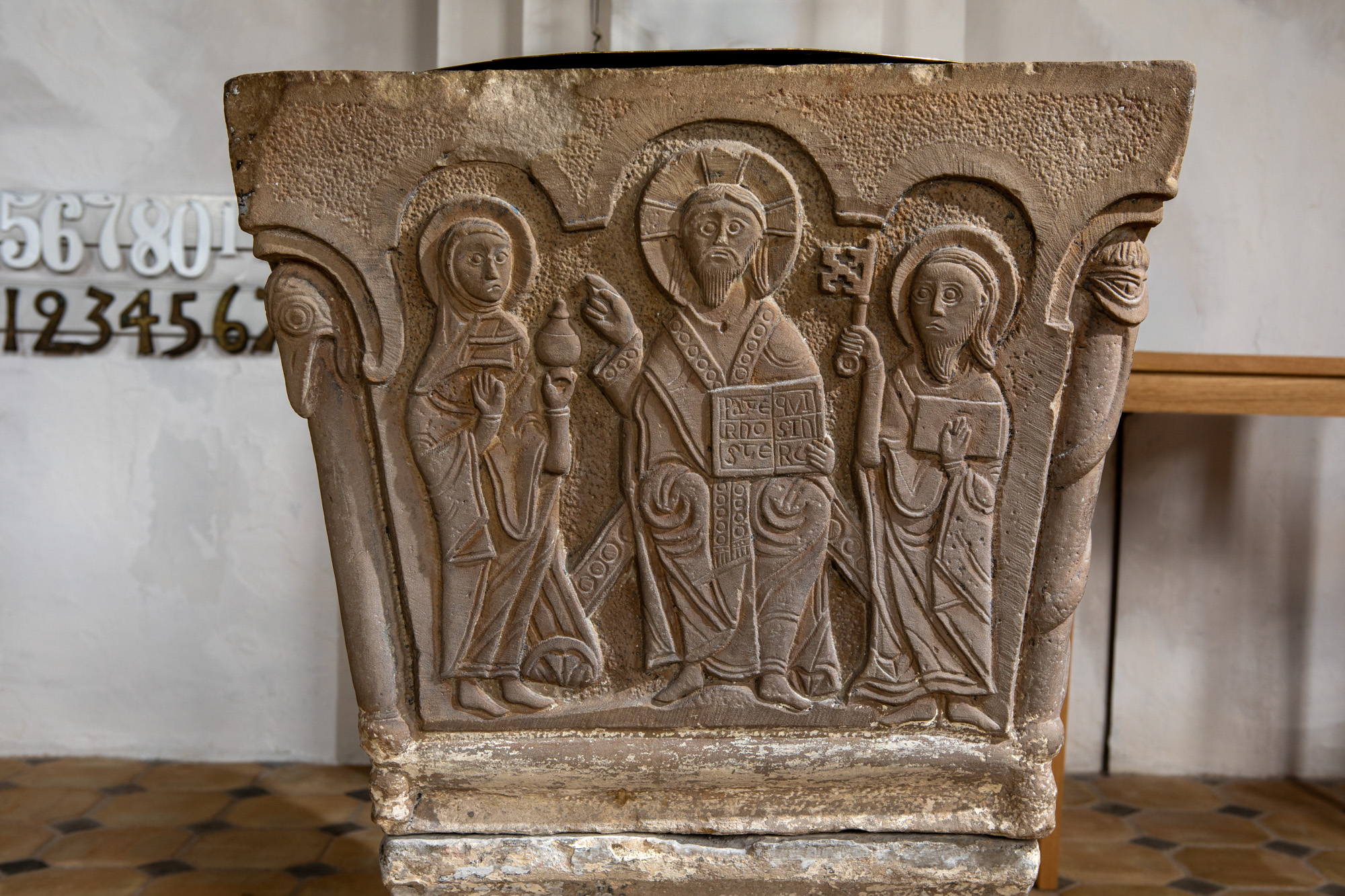 Kristus som lærer. Han sidder på en tronstol og har korsglorie. Han bærer et bånd, som ligner et pallium. Højre hånd er løftet, mens han i venstre hånd støtter en bog, som hviler på knæet. På forsiden står der: Pater noster qvi (e)s in c(oelis) (se tegning Tynell, s. 186) – altså begyndelsen på Fadervor. Til venstre i billedet ses Maria fra Betania med salvekrukken. I den anden side ses Peter med nøglen.
