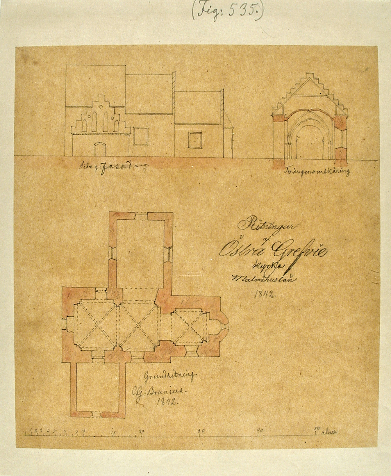 Skitse og plan over den gamle kirke udført af Nils Månsson Mandelgren, 1842. alvin-portal.org Public Domain.