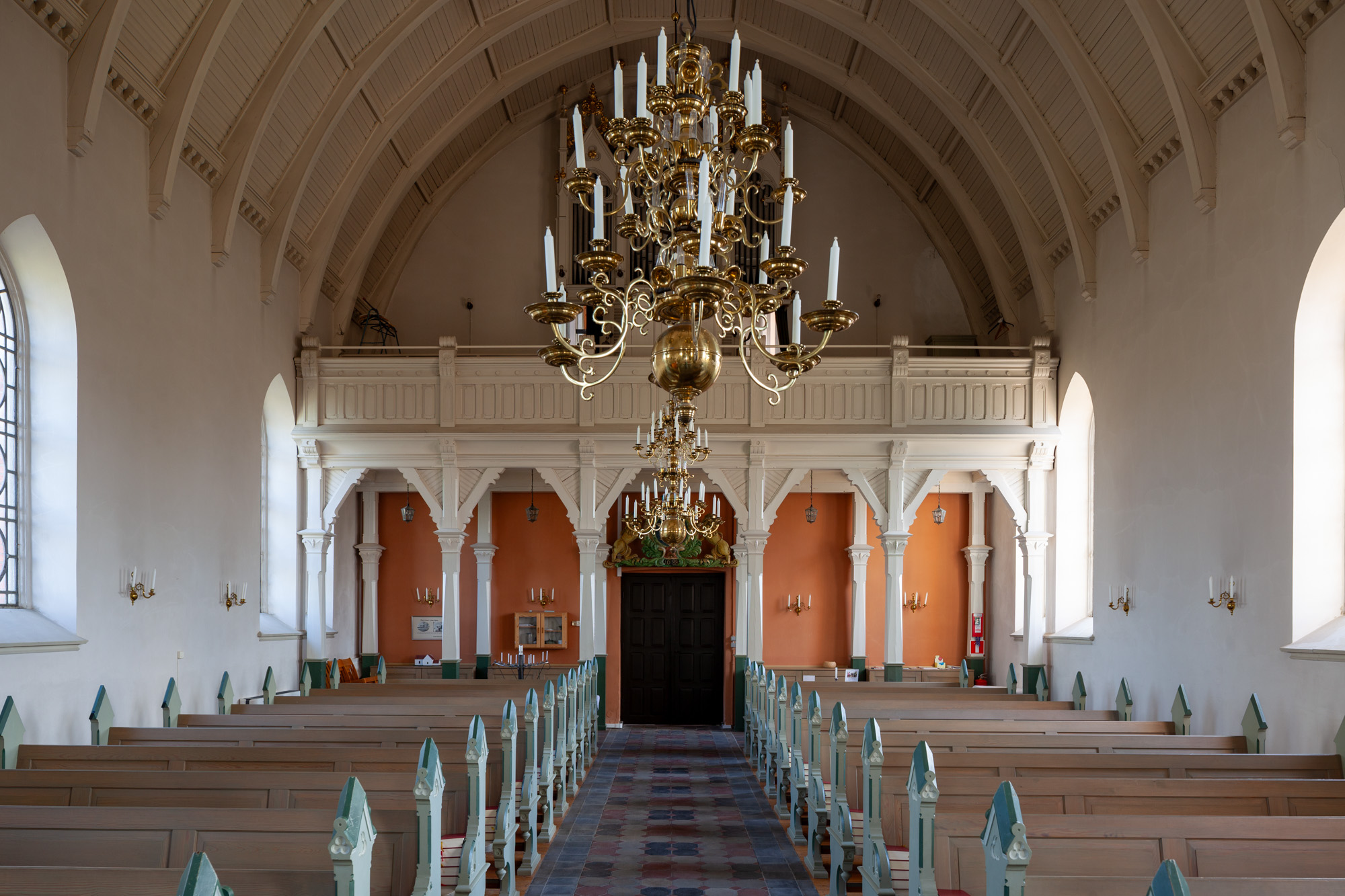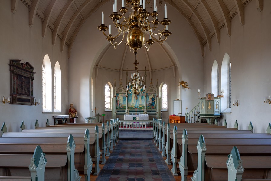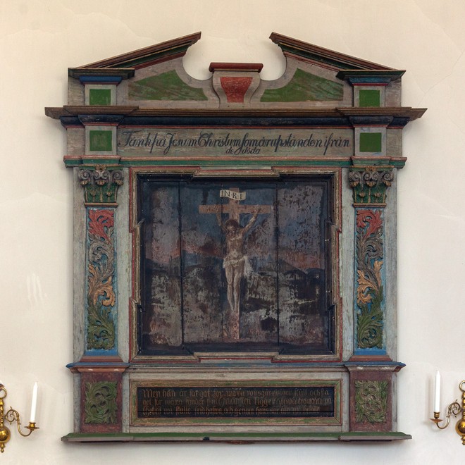En altertavle fra 1703 hænger på skibets nordvæg.