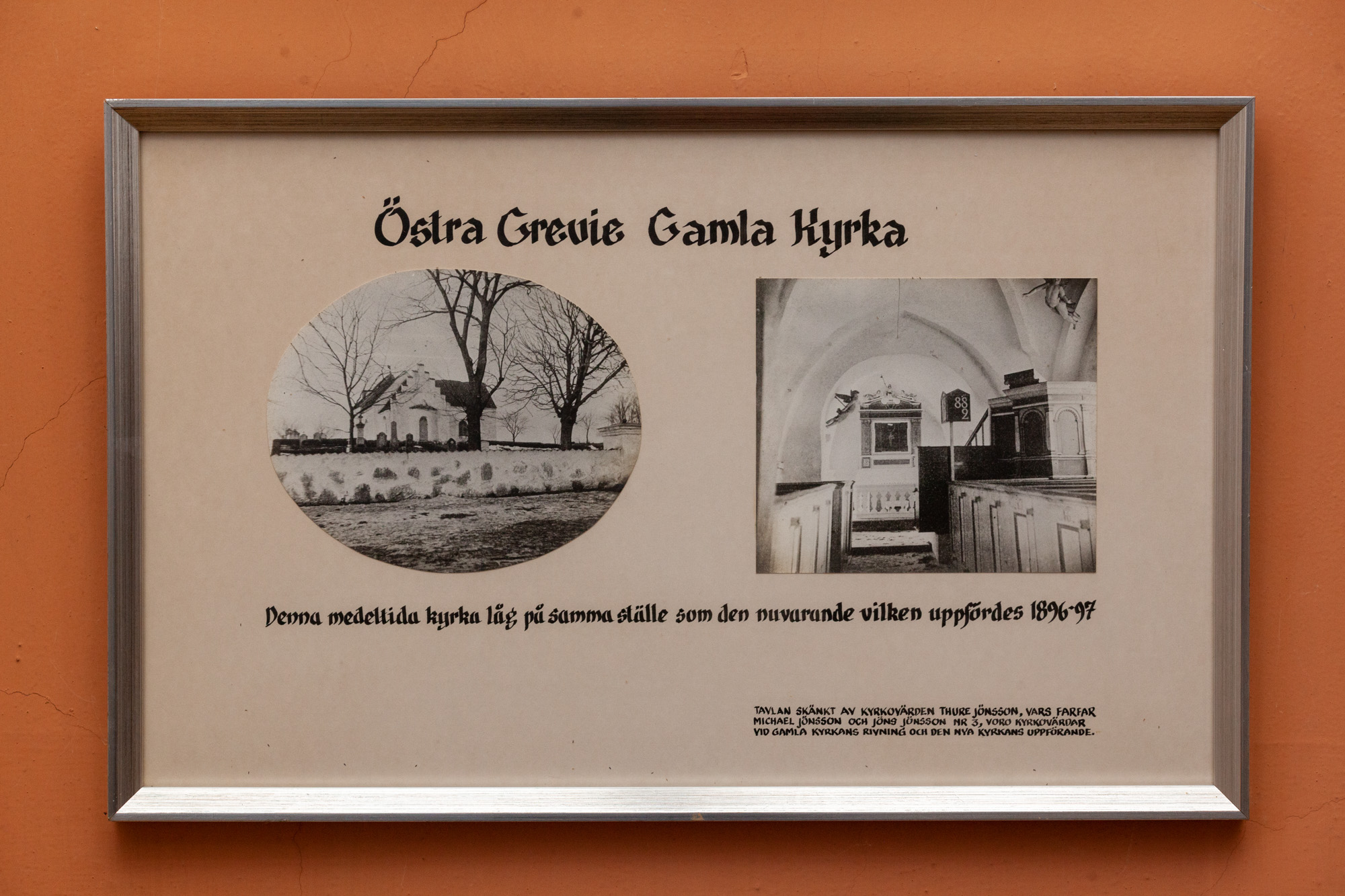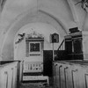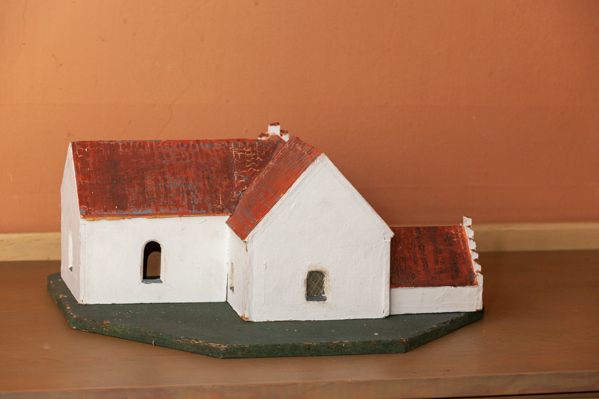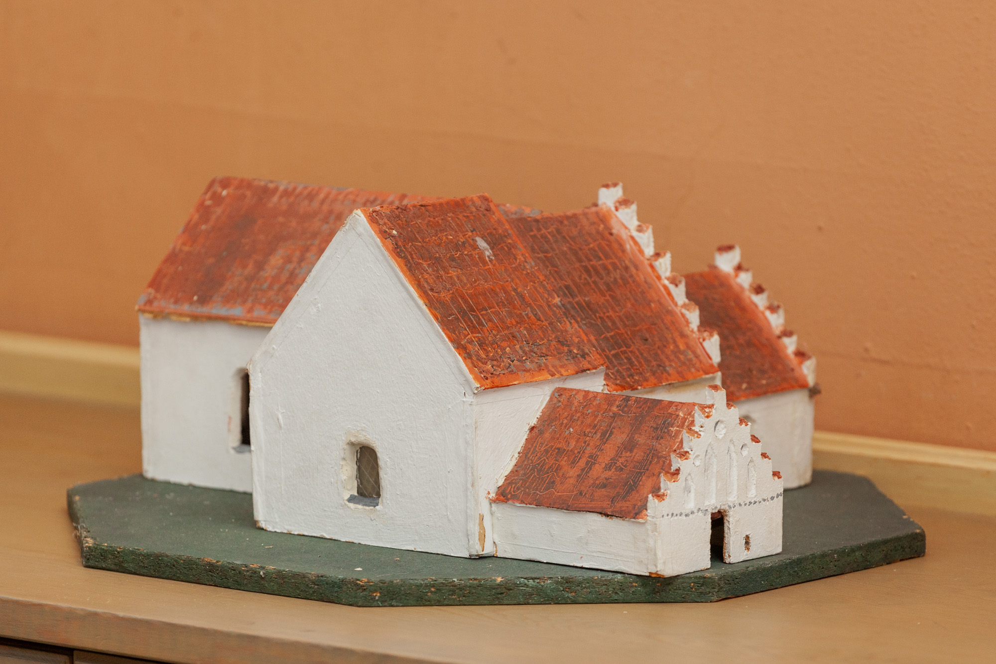 I kirken findes en model og fotos af den gamle kirke.