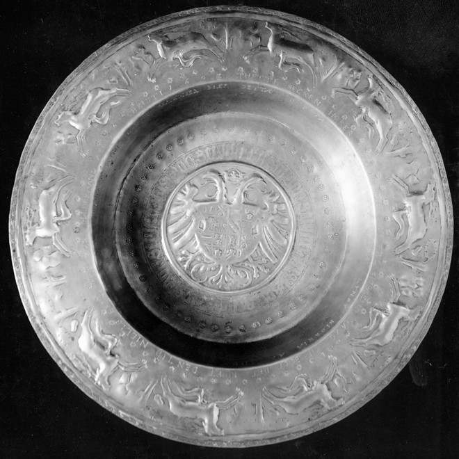 Dåbsfad af messing, 1500-tallet. På randen findes en senere indskrift, som viser, at det har haft et ikke-kirkeligt formål, inden det blev taget i anvendelse som dåbsfad: