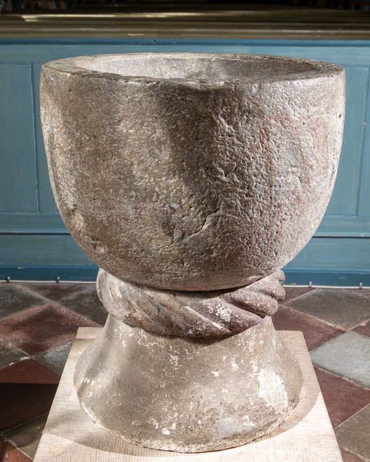 Døbefont af sandsten. Kummen er glat og har hverken fals eller udtømningshul. Foden er rund med en høj hulkehlet skråkant. Mellem fod og kumme en kraftig tovsnoning. Kummen – ikke foden – minder om Søvested.