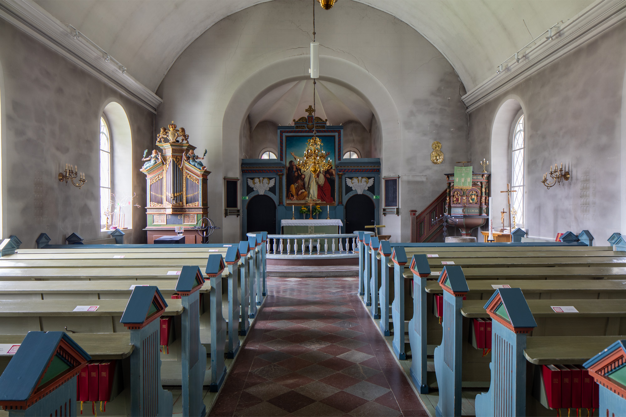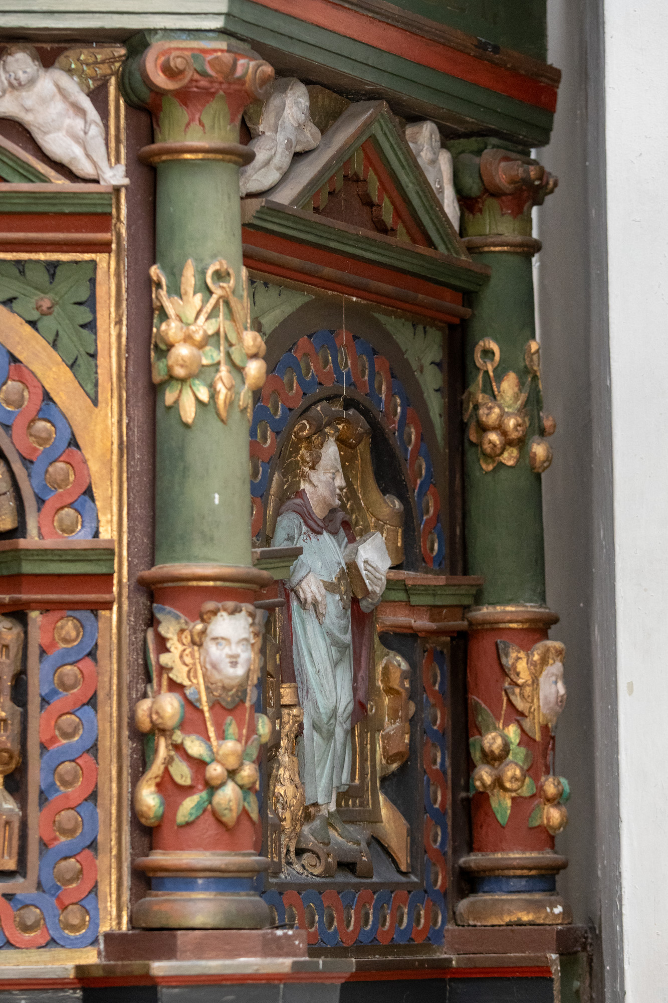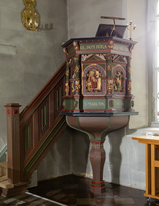 Prædikestolen er fra 1600-tallets første halvdel. Storfelterne har figurer, der fremstiller evangelisterne. De står i rundbuer med listekapitæler og slyngbånd. I svikkelfelterne er der bladornamentik. Søjlerne har prydbælter og glatte skafter med frugter. Over billedfeltet ses et gavlfelt. I smalfelterne forneden ses evangelistnavnene. Foden og trappen er fra 1908, mens farvesætningen er fra 1966.