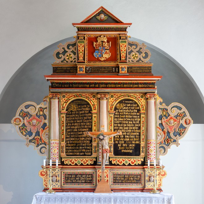 Altertavlen er fra 1604. I fodstykket er der to felter med skriftsteder: Joh. 6,54: ”Hvo som æder mit Kiød oc dricker mit Blod hand haffuer det evige liff. Ioh. 6.” Ved siden af 1. Kor. 11,28: ”Mennisket skal prøffue sig oc æde saa aff dette Brød oc dricke aff denn kalk. 1 Co.” Felterne er anbragt mellem tre konsoller, som bærer storstykkets tre søjler. På konsollerne er der ansigtsmasker.