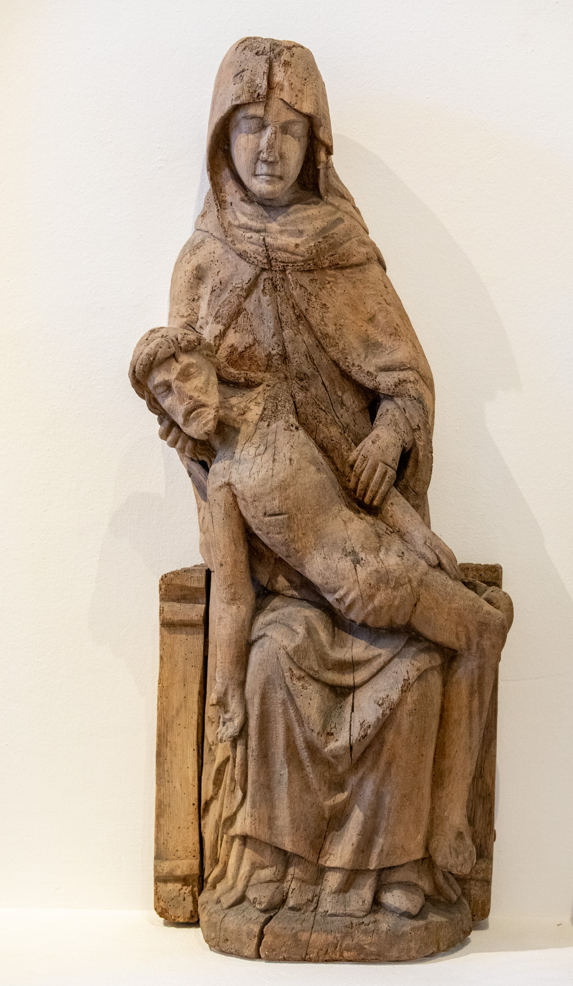 Maria er iklædt hovedtørklæde, kjortel og kappe. Sønnen er halvt liggende med hovedet drejet mod højre støttet af hendes hånd. Tornekronen er omviklet. Højre arm hænger lige ned.