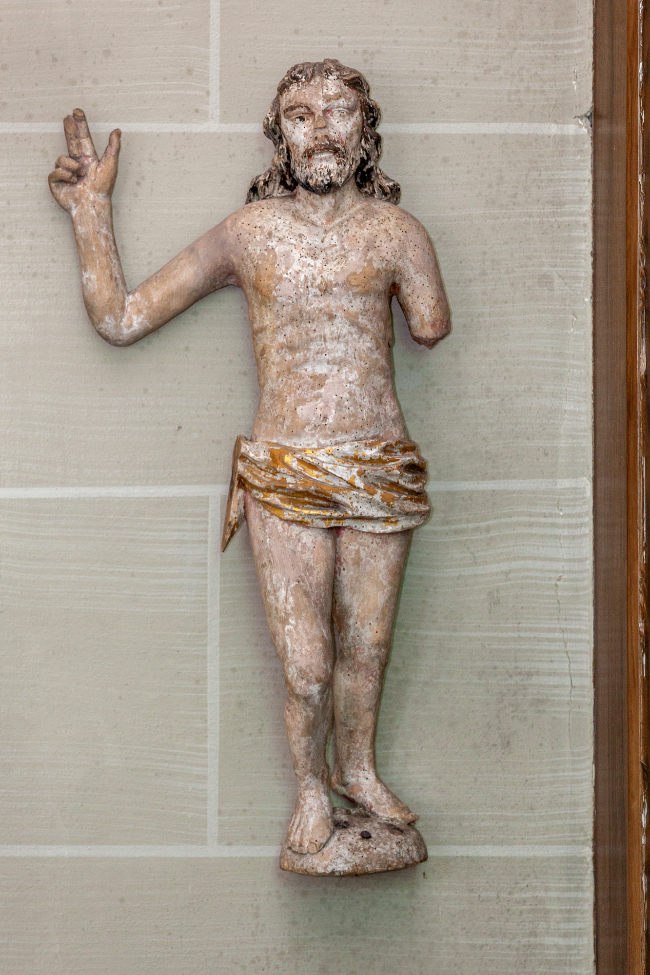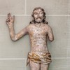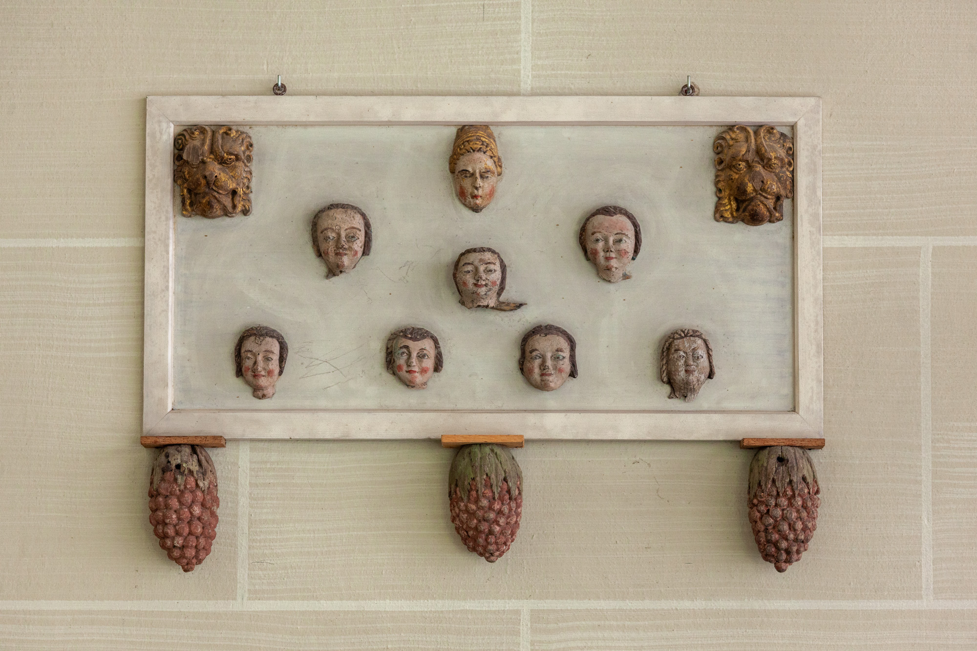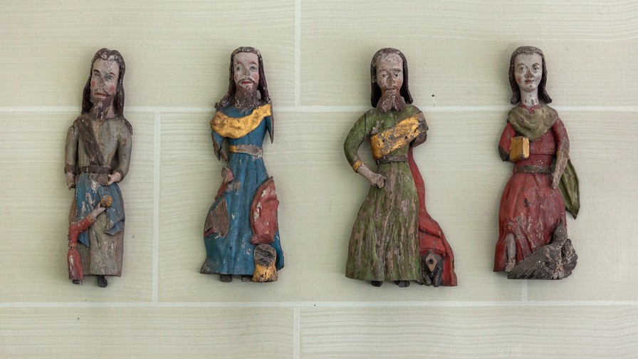 Et antal træskulpturer fra 1500-tallet, som nu er opsat på væggen. De stammer fra en prædikestol og en altertavle.