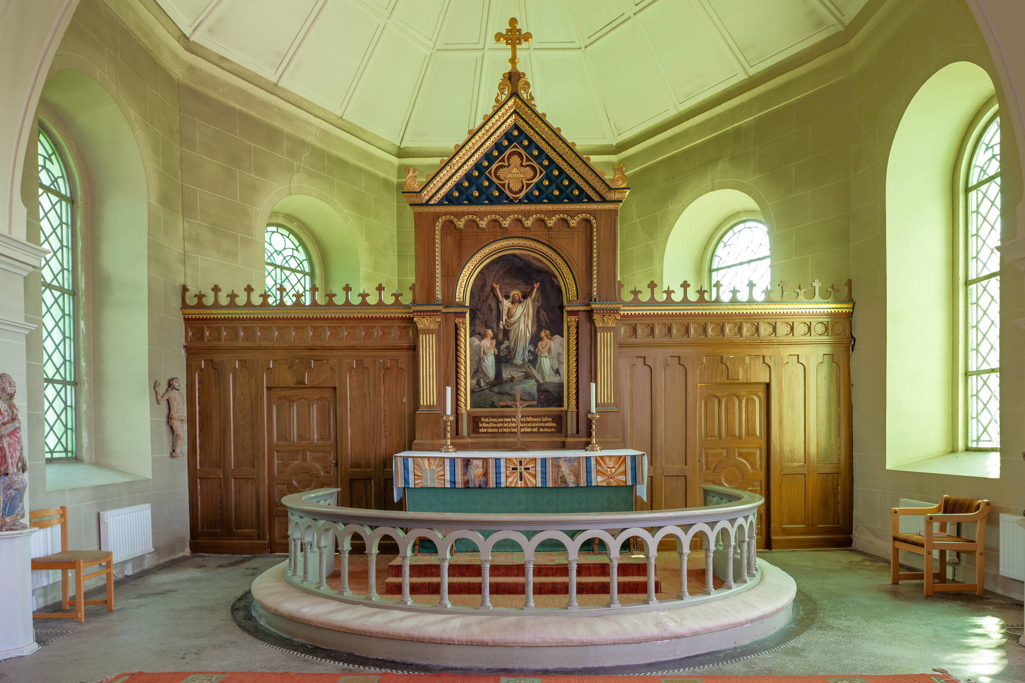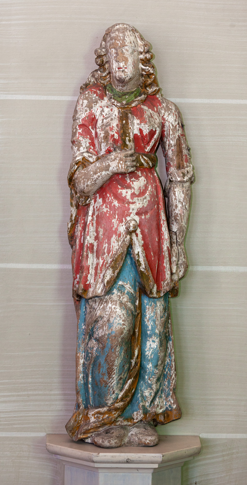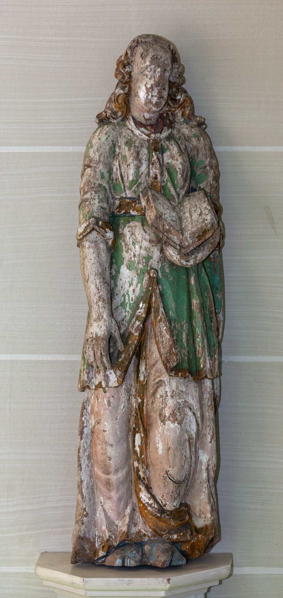 Et antal træskulpturer fra 1500-tallet, som nu er opsat på væggen. De stammer fra en prædikestol og en altertavle.