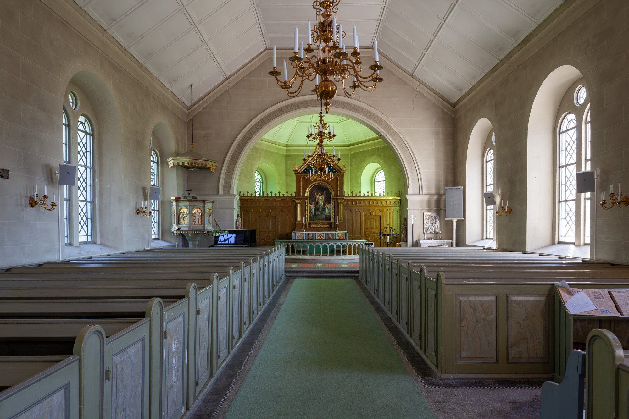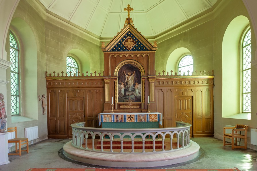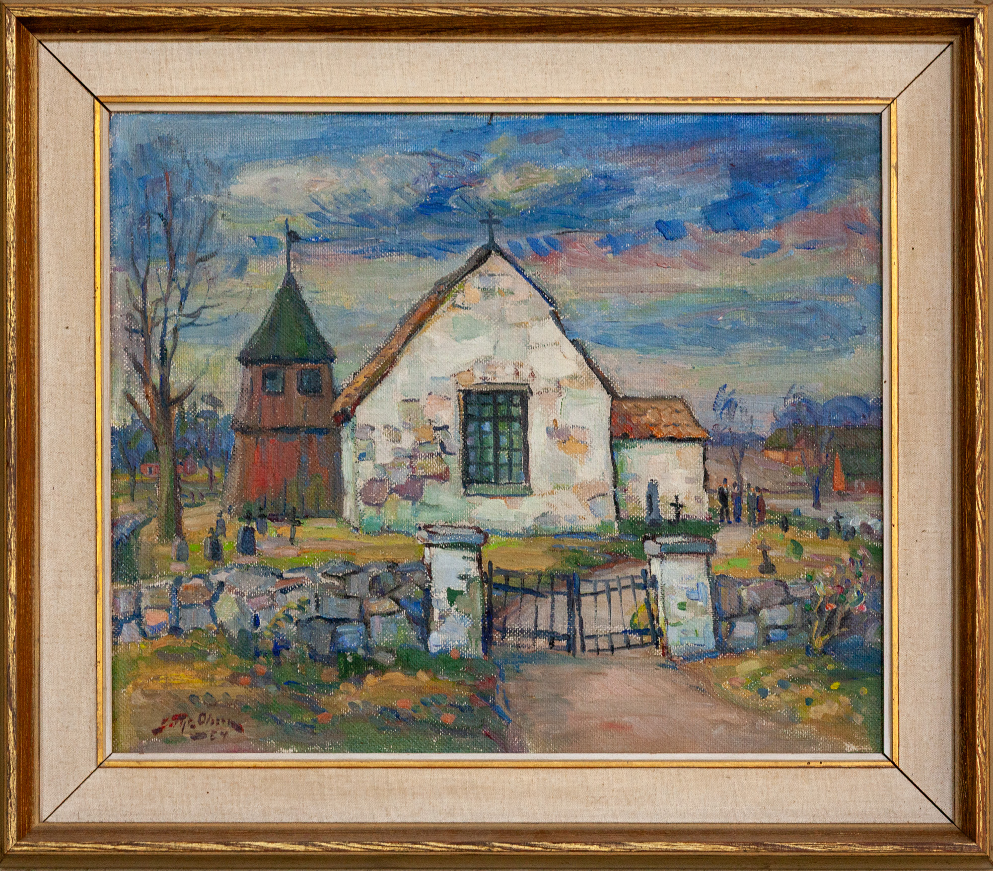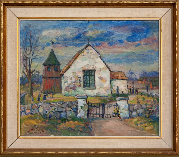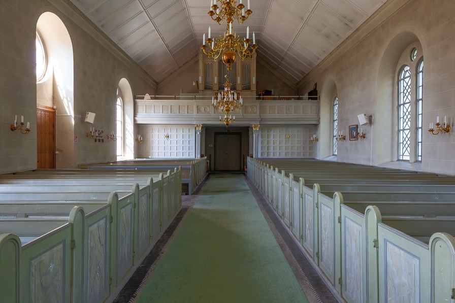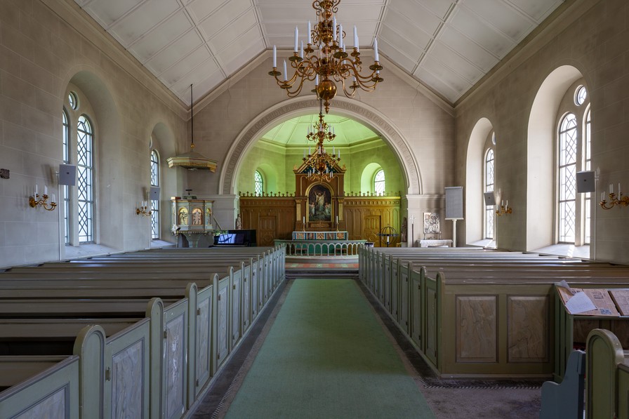 Et maleri af den gamle kirke er ophængt i kirken. Af det fremgår det, at den havde et klanghus i stedet for tårn.