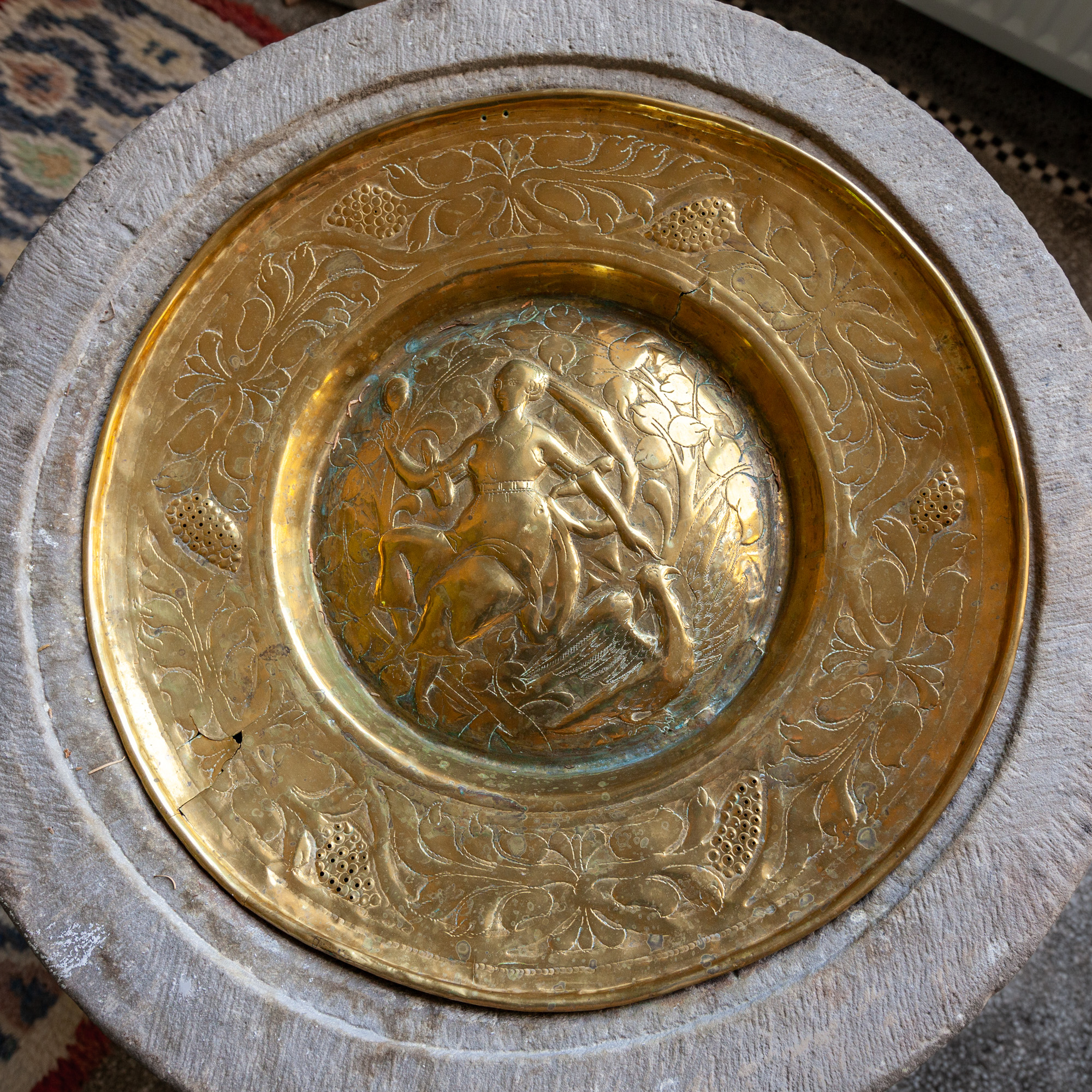 Motivet i bunden er en kvinde med et spejl i højre hånd, mens hun med venstre hånd peger på en fugl. Baggrunden er udfyldt med rankeværk. På fadets rand er der bladranker og vindrueklaser.