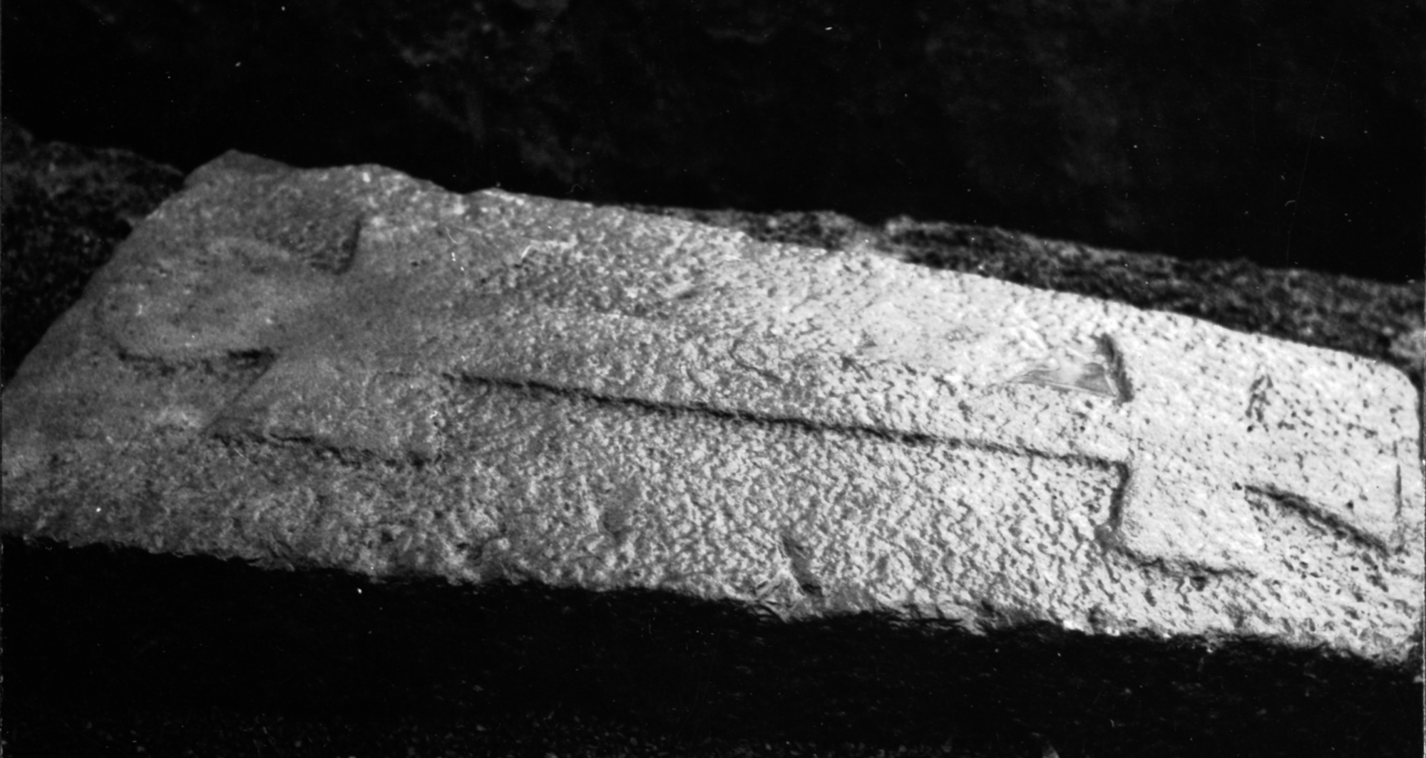 Middelalderlig gravsten med dobbeltkors fundet ved udgravning på parkeringspladsen syd for kirken.