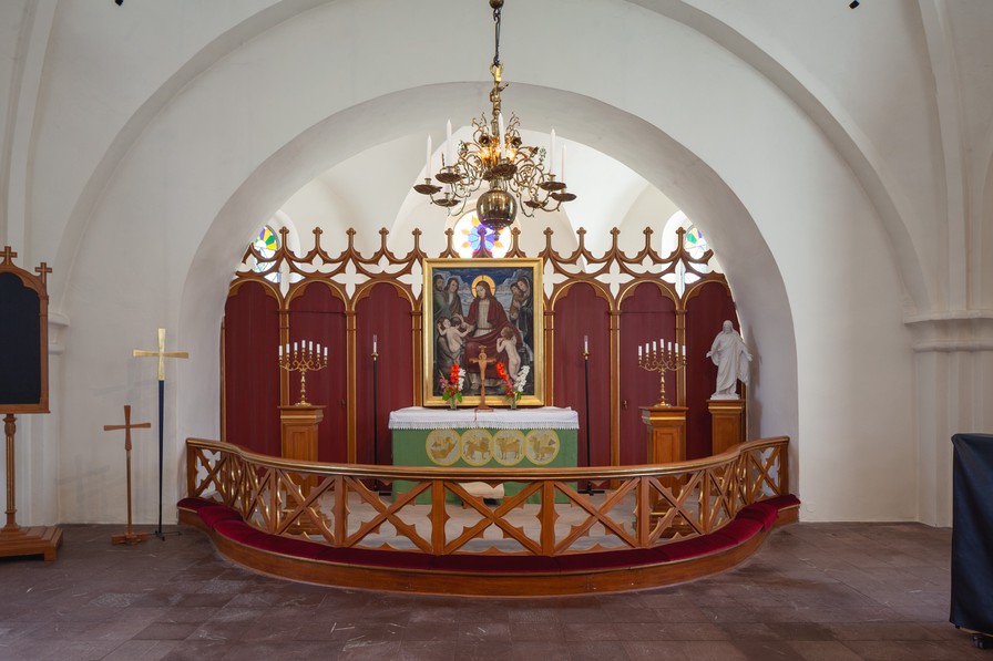Et alterbillede forestillende Kristus på korset fra 1811 var oprindelig indsat i en altertavle af ukendt udseende. Denne altertavle havde nogle indskrifter. Øverst stod der: