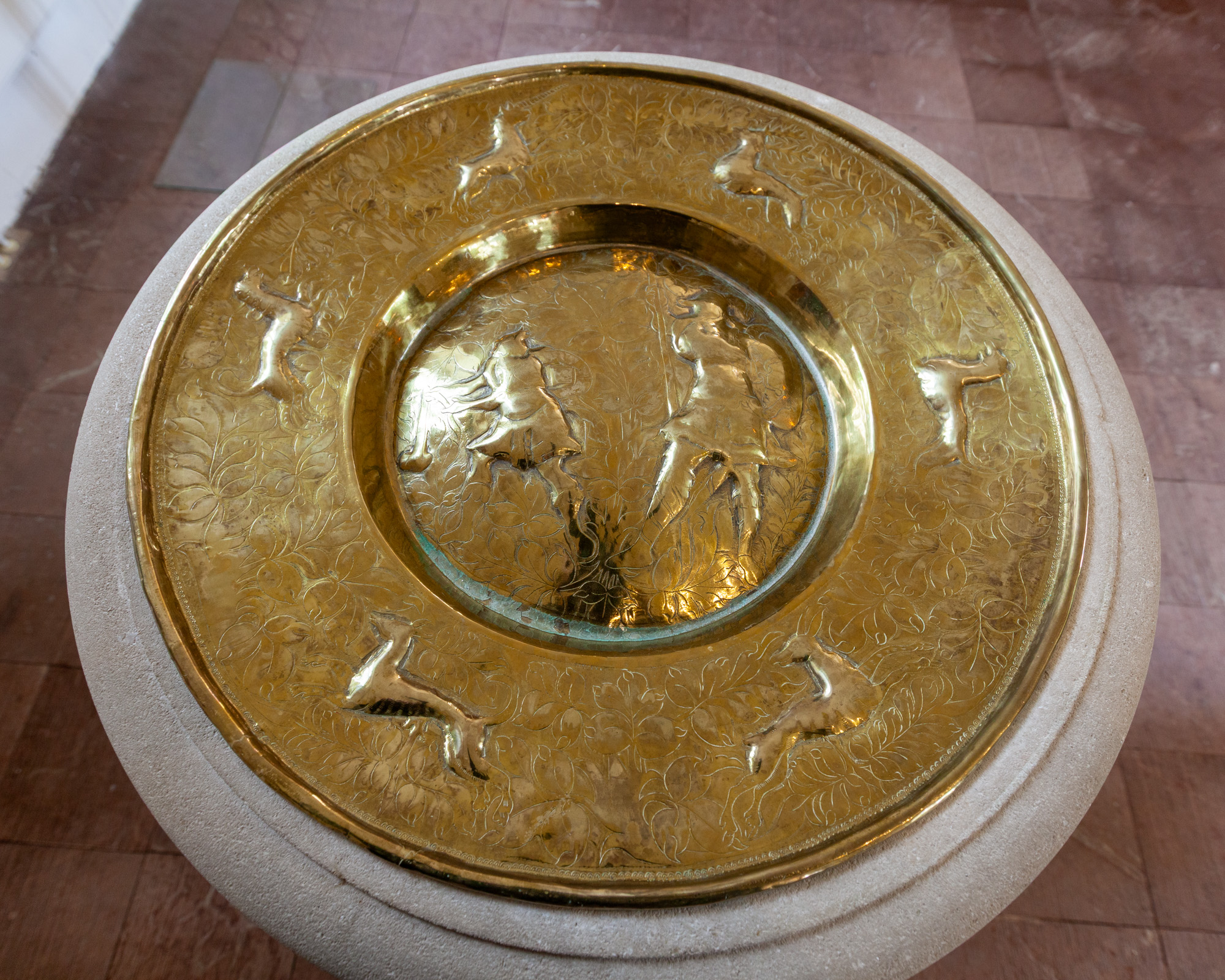 Dåbsfadet er af messing med et billede af David og Goliat på en baggrund af bladværk. På randen springende hunde, jagende enhjørning, hjort og rådyr. Det er lavet i Holland i første halvdel af 1600-tallet.