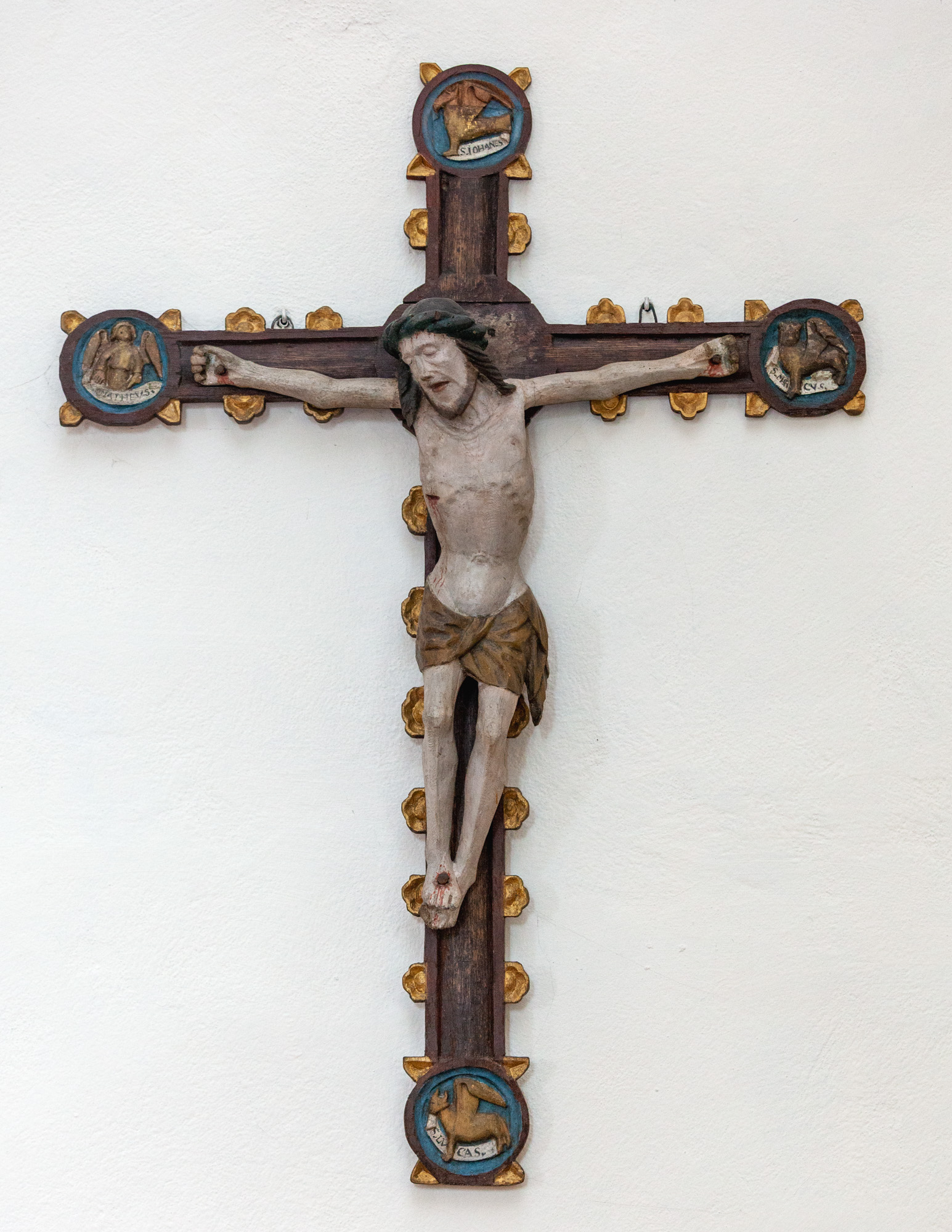 Hovedet er bøjet forover til højre. Tornekronen er snoet. Armene, der er meget tynde, er strakt horisontalt ud. Lændeklædet er kort og sidder lavt. Det er knyttet foran. Højre fod er lagt ind over venstre.