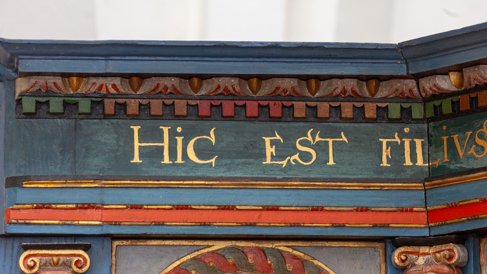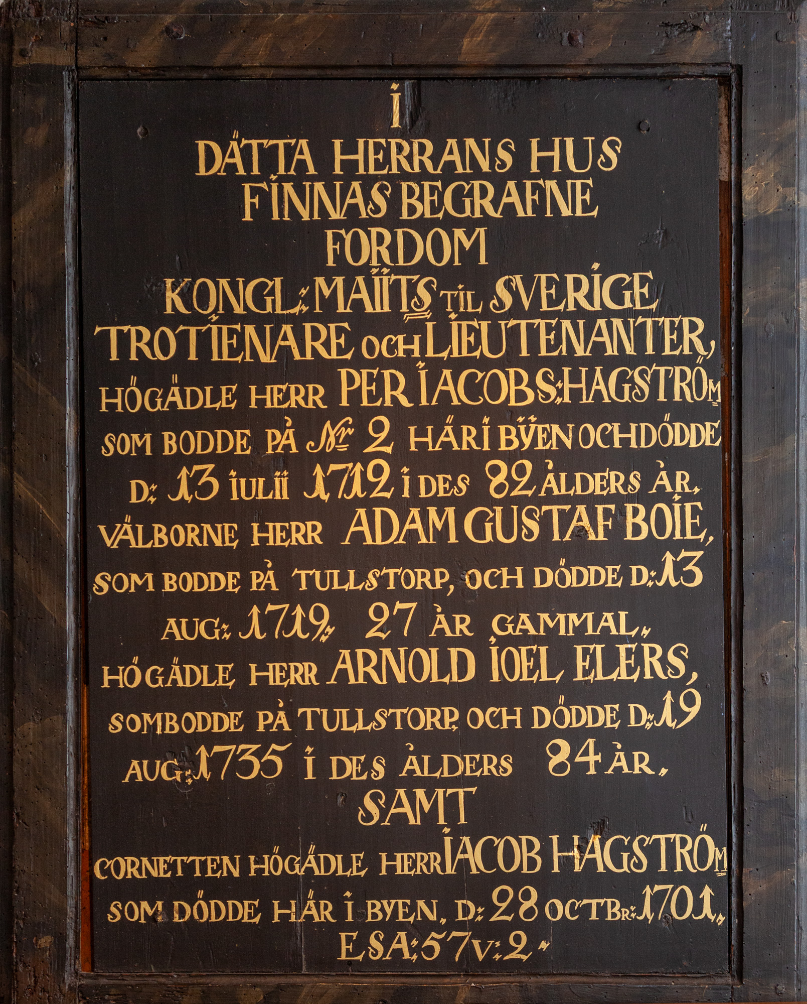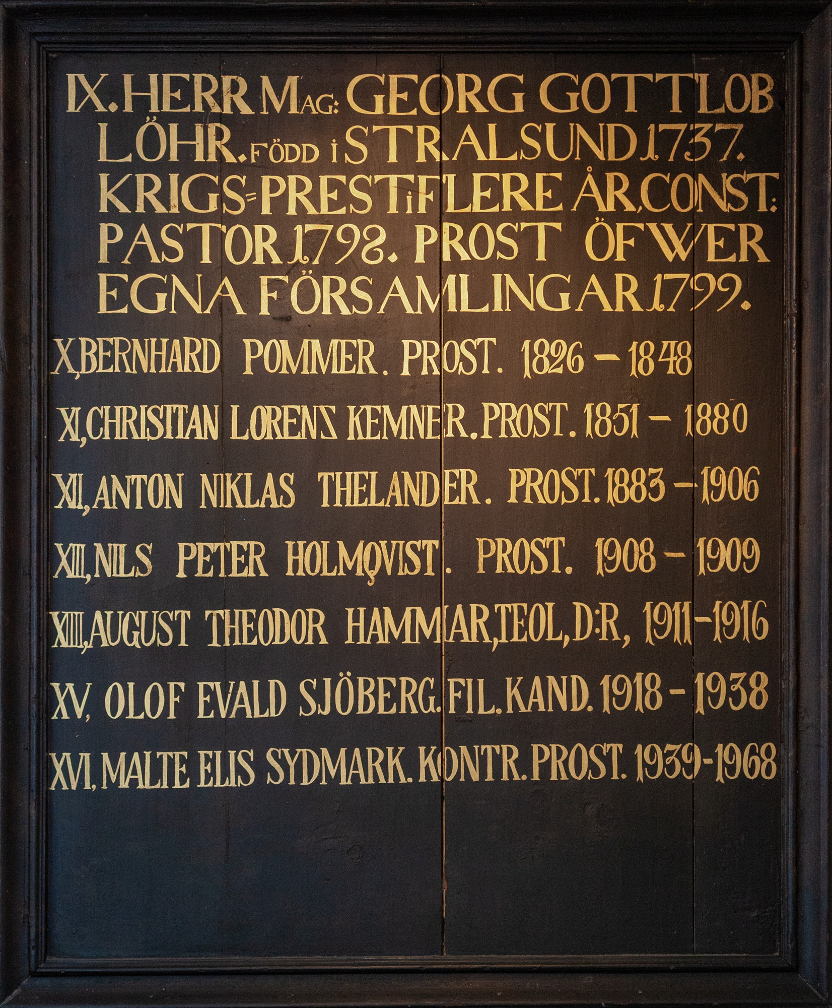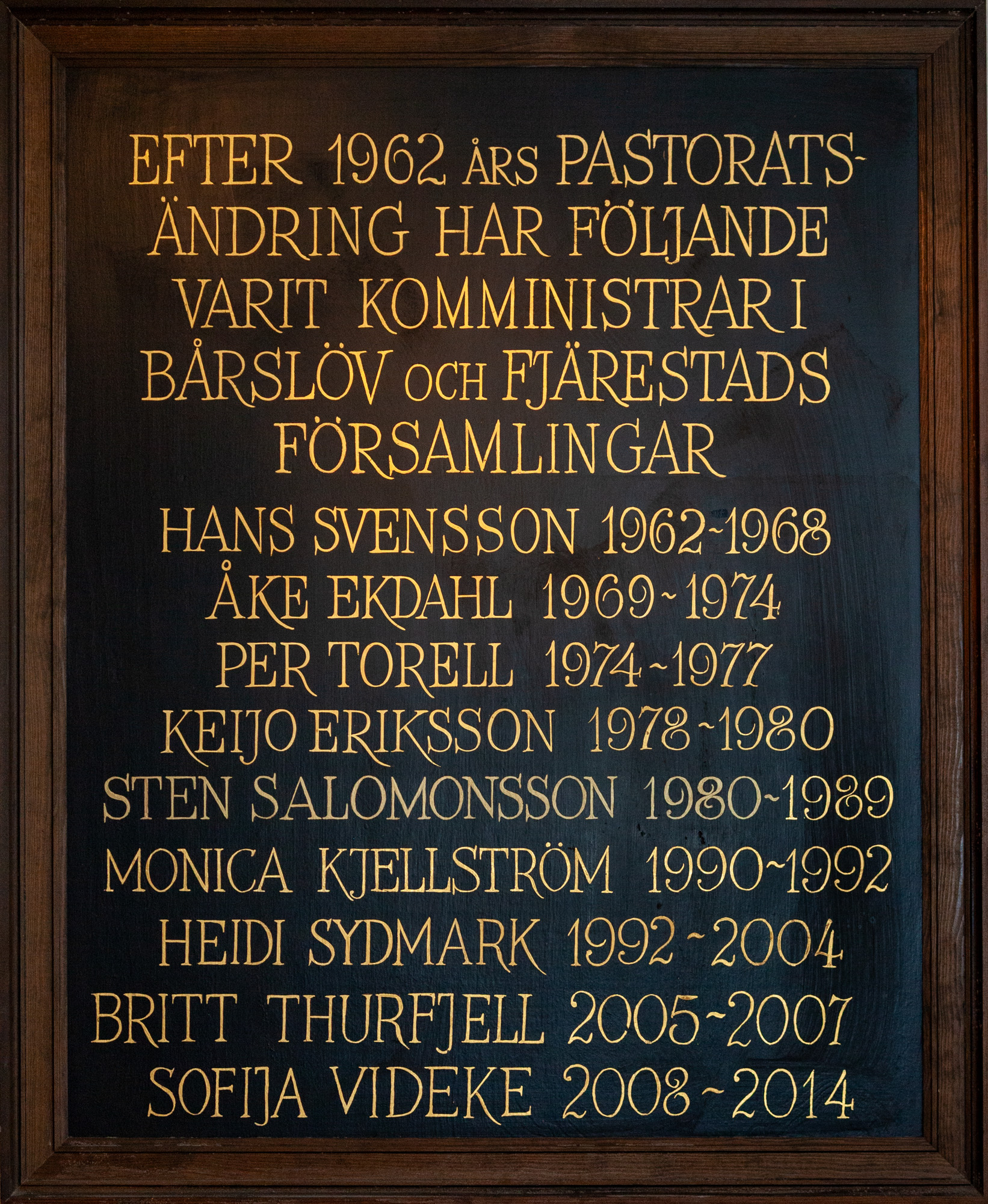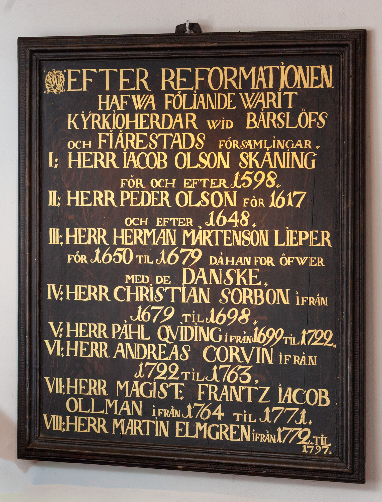 Anno 1672 blef denna altare tafla renoverad och då war hederlig wällärd mann Hr Herman Mårtensson Lipper sogne prest här udi Bårslöf och Fierestad sogner.